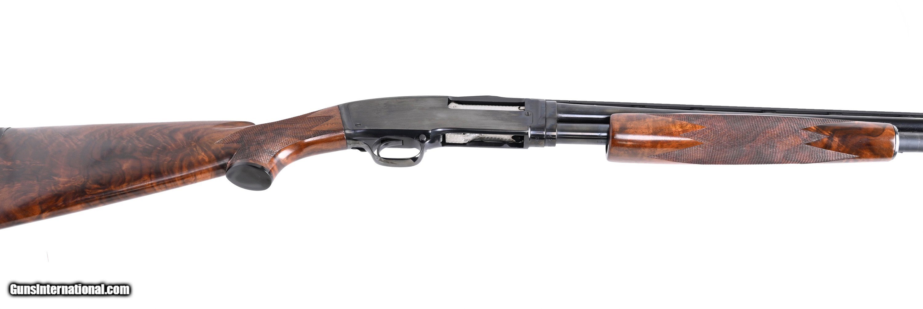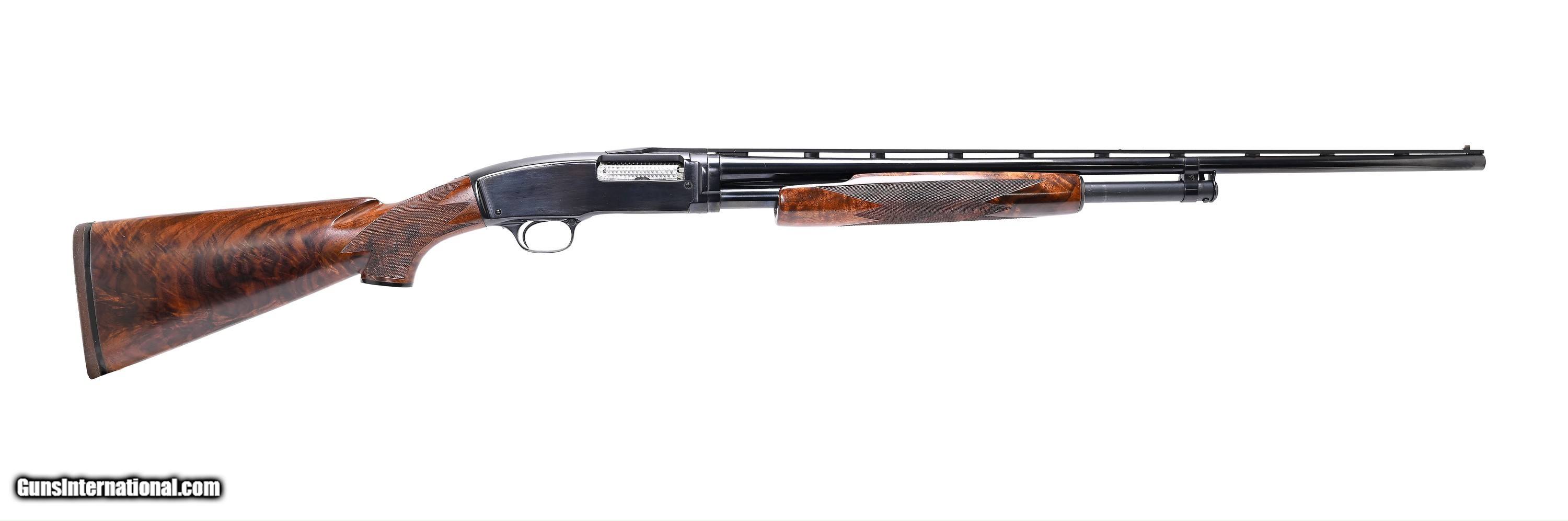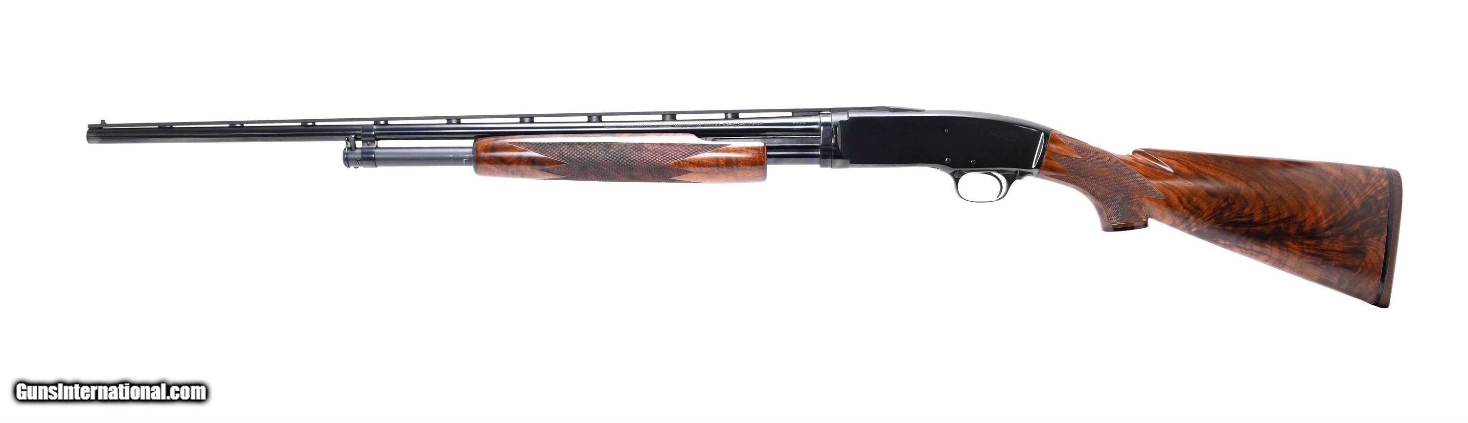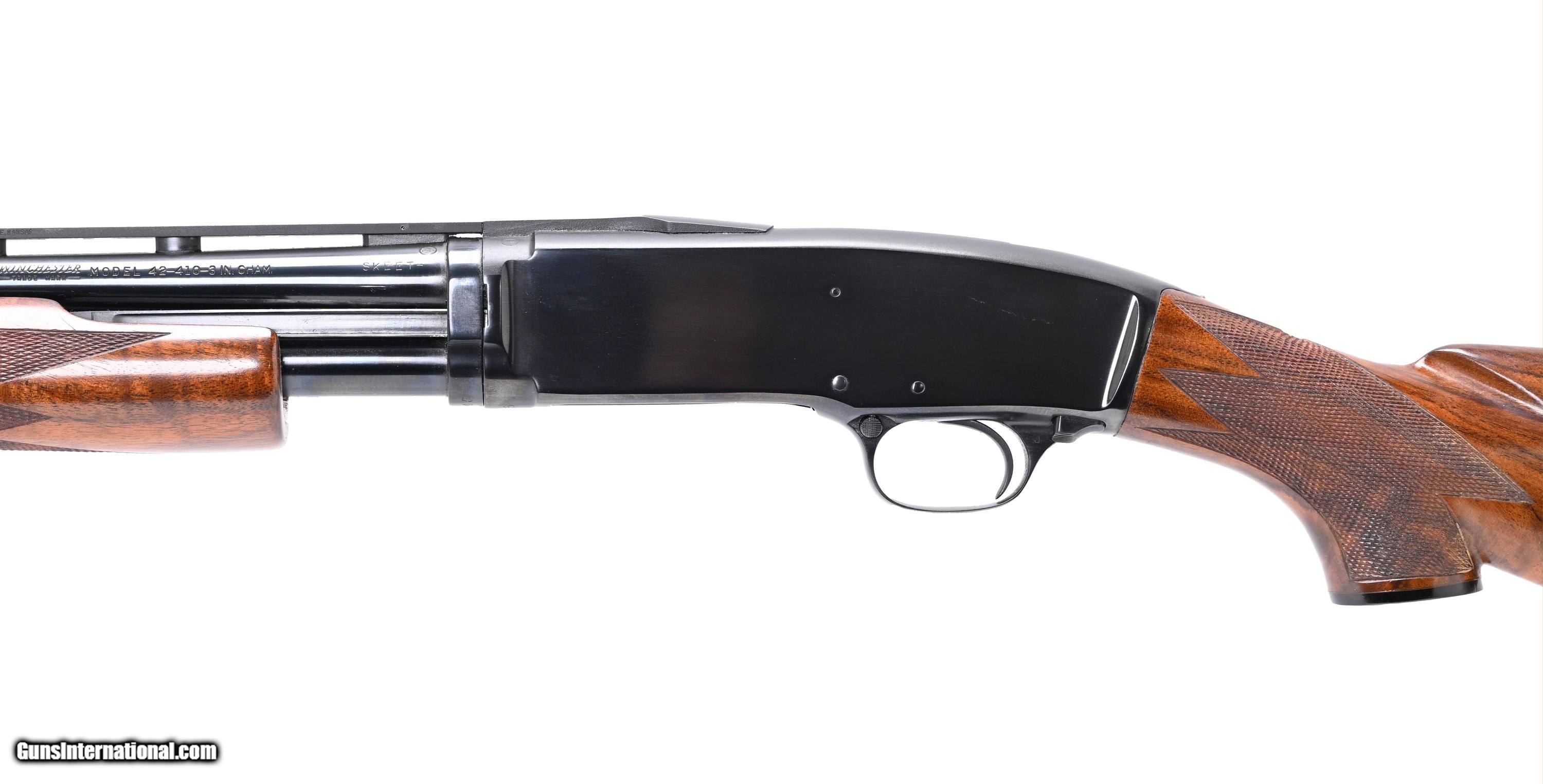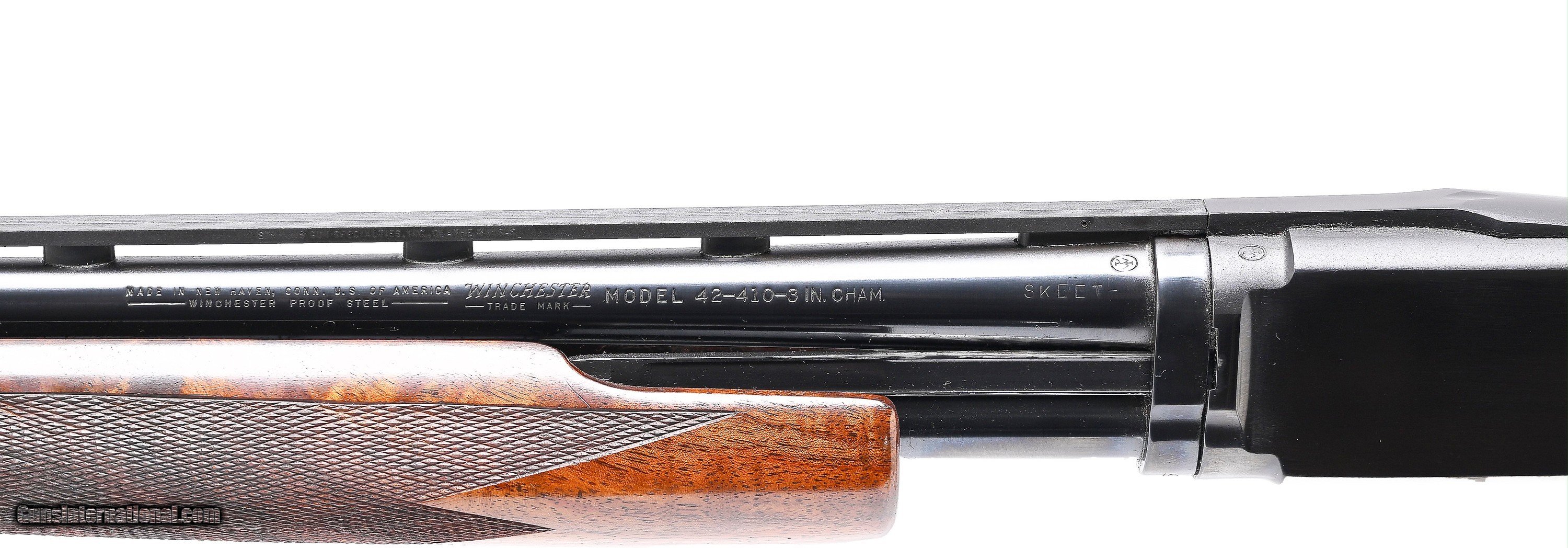 Description: Winchester Model 42, .410 bore pump action shotgun. This gun has been upgraded with a Winchester style duck bill ramp vent rib; also a deluxe style engine turned bolt and loading gate; and beautiful deluxe walnut butt stock and forearm with fine checkering The barrel is 26" with SKEET choke and 3" chamber. The stock has a 14 1/8" length of pull over the recoil pad (13 1/2" to the end of the stock). SN: 62945 originally made in 1947 SOLD Curio/Relic: Yes |