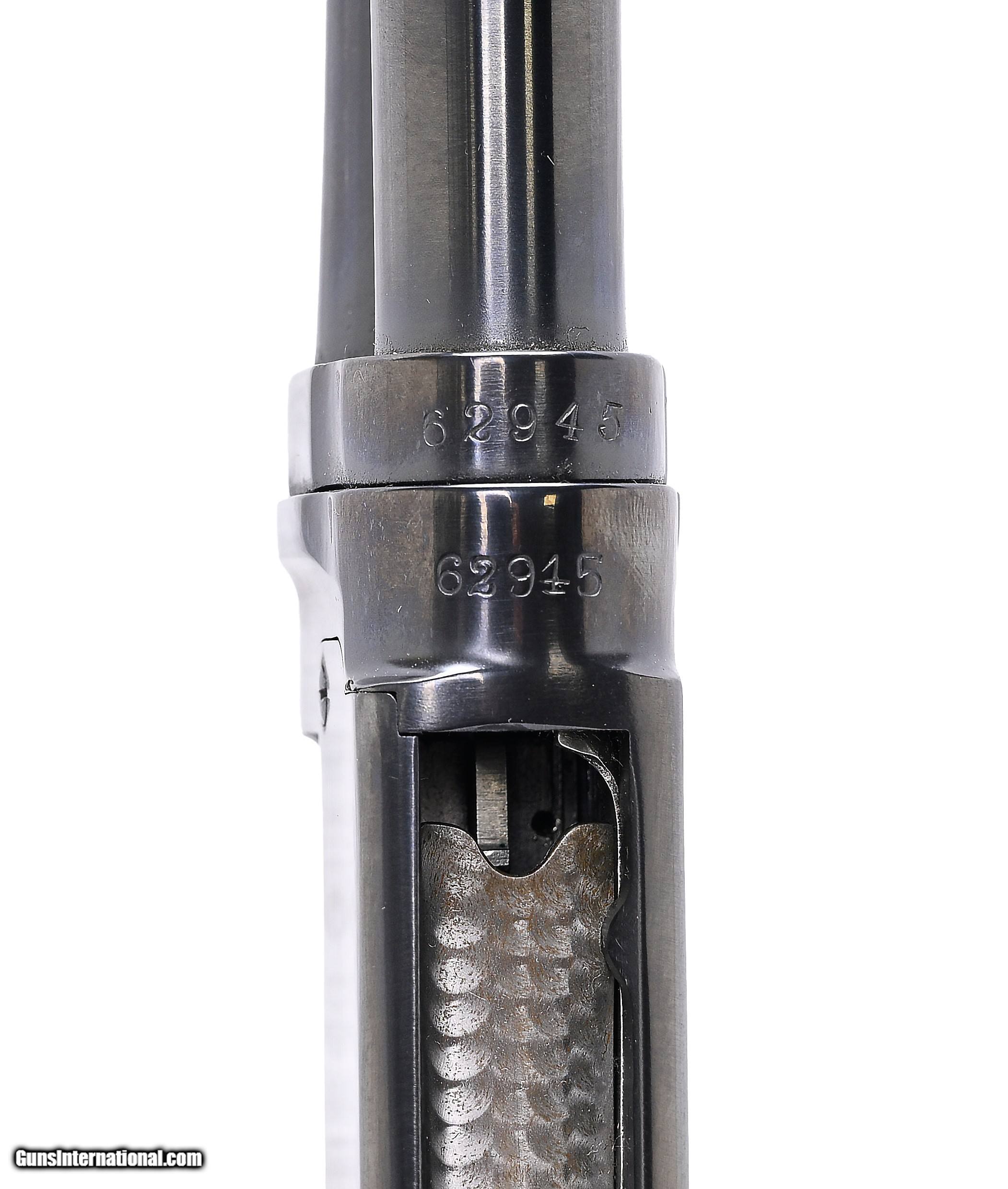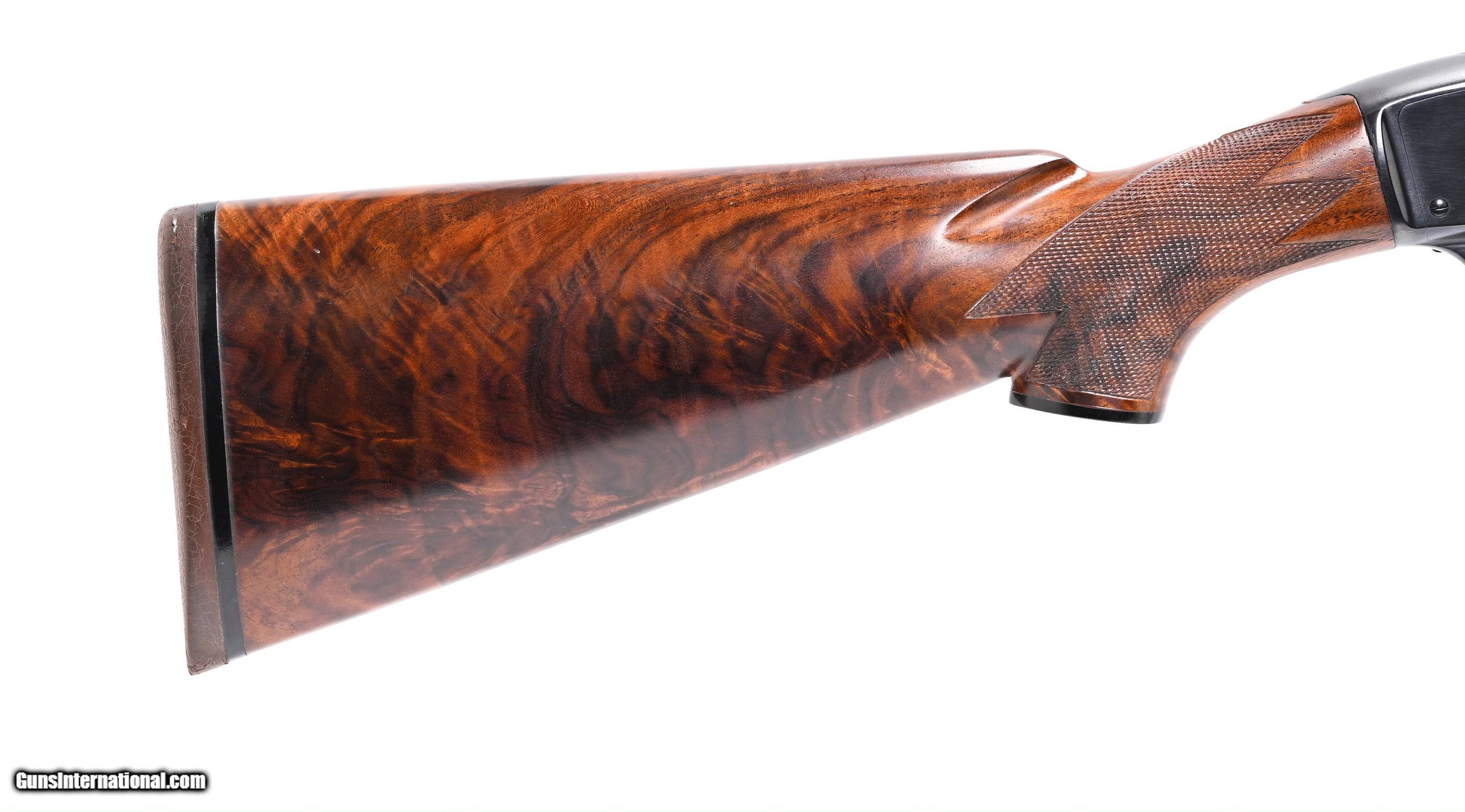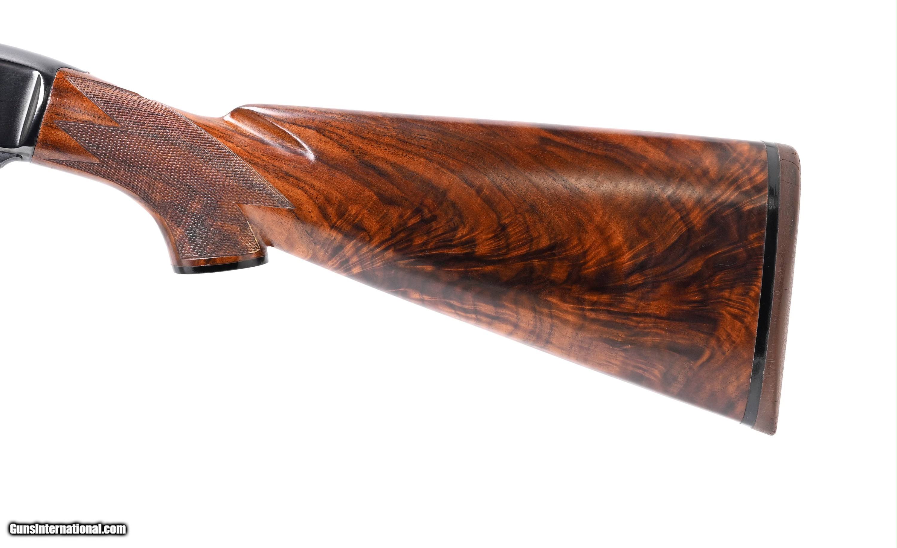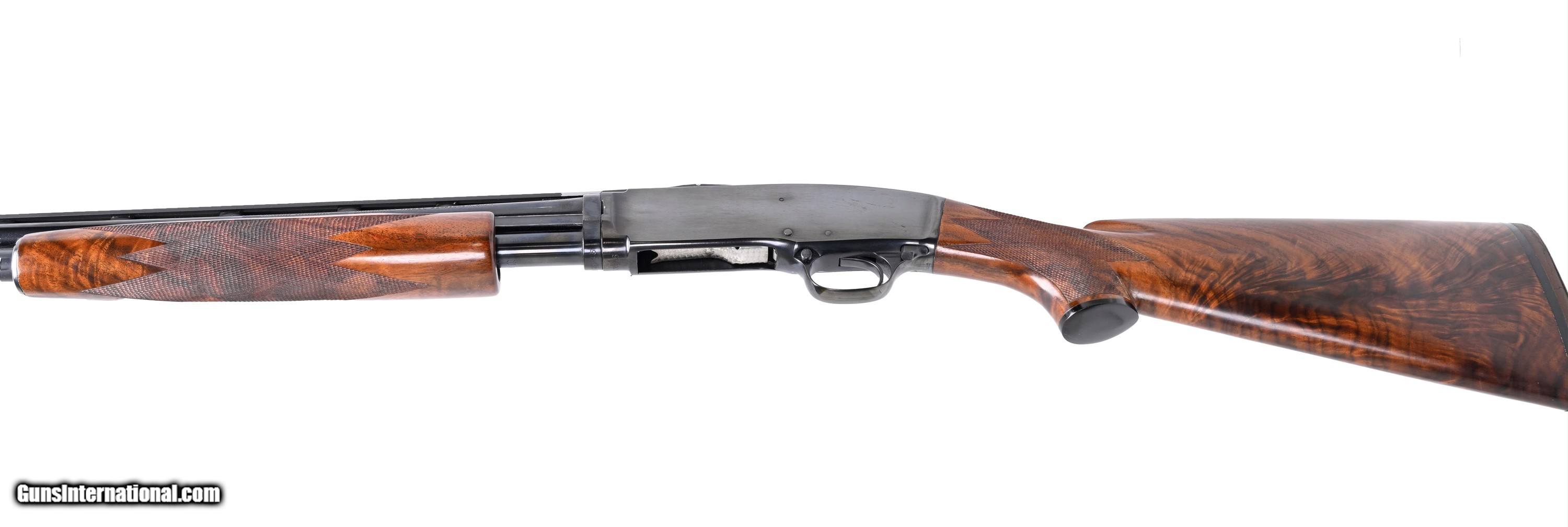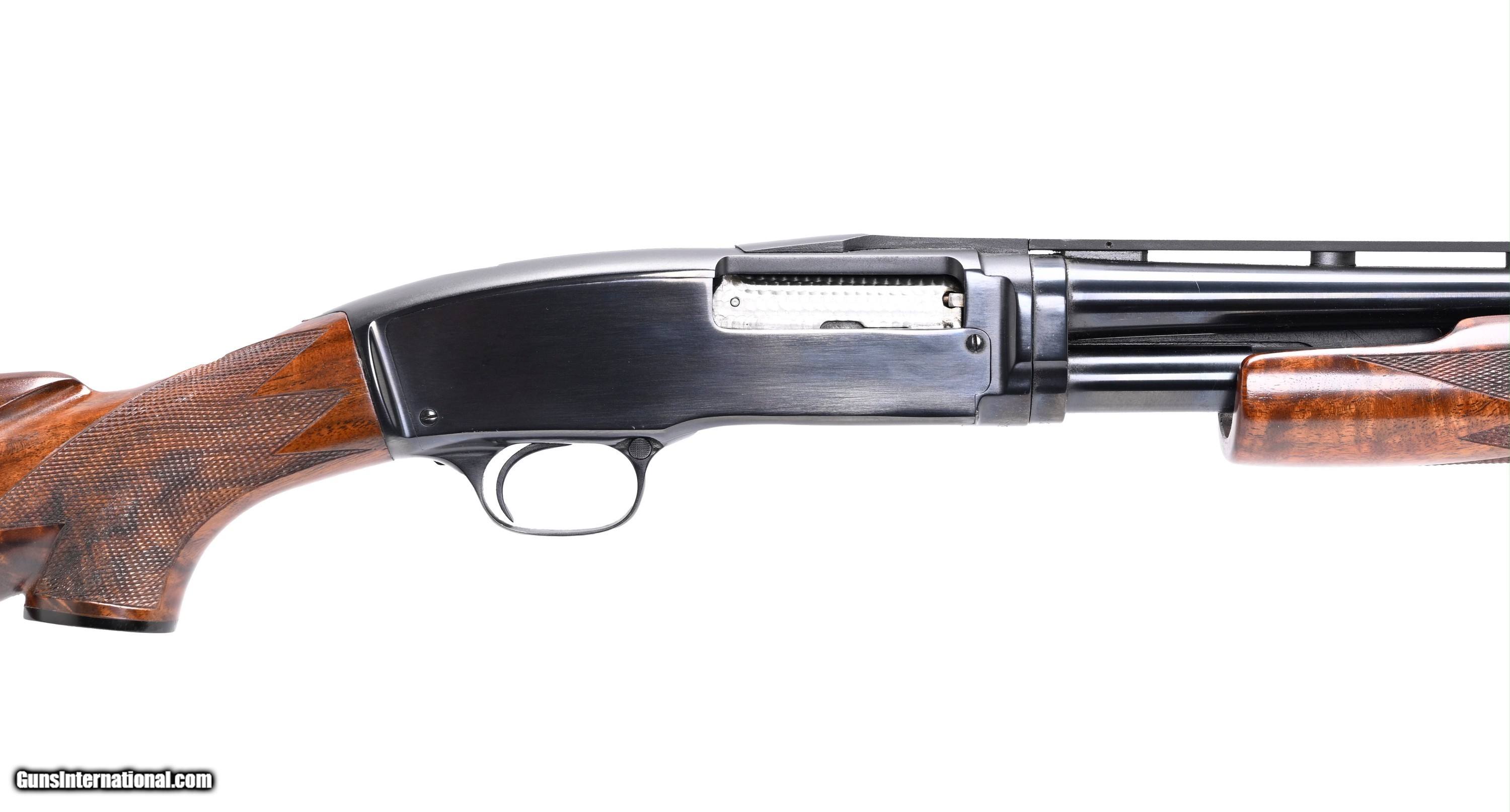 Description: Winchester Model 42, .410 bore pump action shotgun. This gun has been upgraded with a Winchester style duck bill ramp vent rib; also a deluxe style engine turned bolt and loading gate; and beautiful deluxe walnut butt stock and forearm with fine checkering The barrel is 26" with SKEET choke and 3" chamber. The stock has a 14 1/8" length of pull over the recoil pad (13 1/2" to the end of the stock). SN: 62945 originally made in 1947 SOLD Curio/Relic: Yes |
