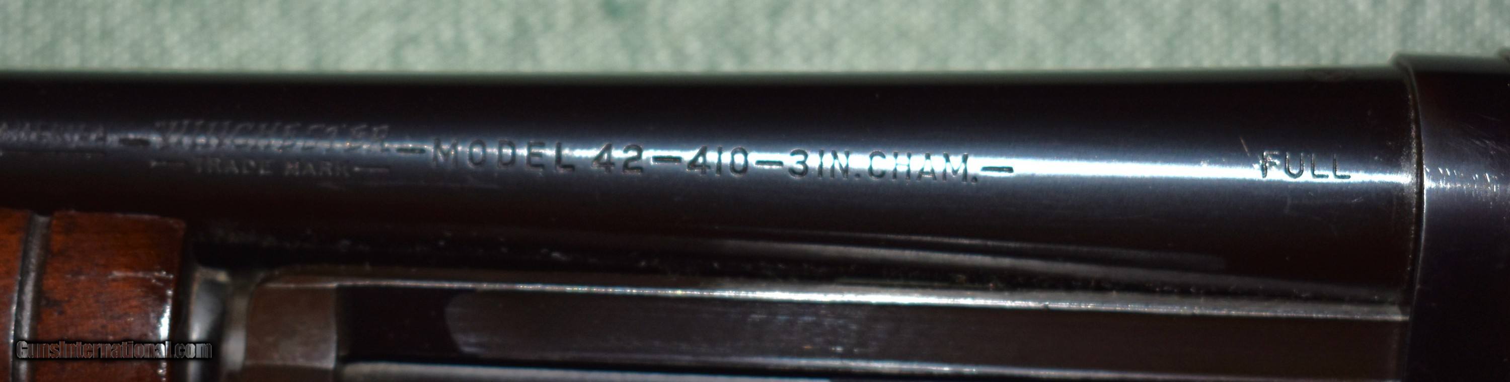 Description: Winchester pre 64 model 42 field grade built in 1952. This gun is in as new all original condition. The gun retains 99,9% of the original blue and wood finish. It has a 28" barrel choked full. The bore is mint and the stock and forend are sound with no cracks or damage. All roll stamps and inspectors proof stamps are sharp and crisp. This gun is really in remarkable shape to be 71 years old. A fine gun to add to any collection or a classic 410 for the shooter who recognizes old style quality. C&R eligible. Price includes shipping to your FFL. SOLD Curio/Relic: Yes Shotgun Gauge: .410 Gauge Manufacturer: Winchester Model: 42 Field Grade Serial Number: 95286 Barrel Length: 28 Chambers: 3 Condition: mint Metal Condition: mint Wood Condition: mint Bore Condition: mint Barrel Type: Winchester Proof Steel Action: Pumo Butt Pad: Factory Buttplate Manufacture Date: 1952 Chokes: Full |