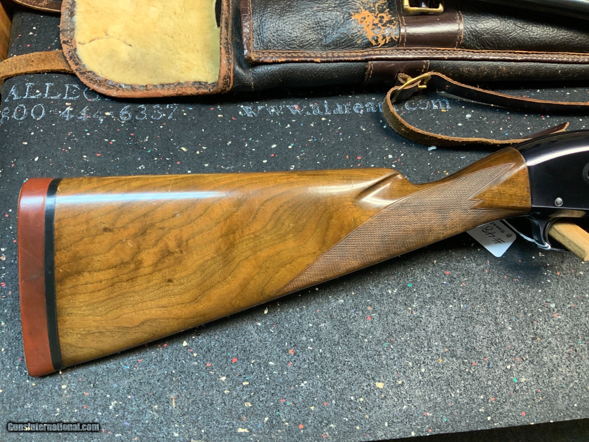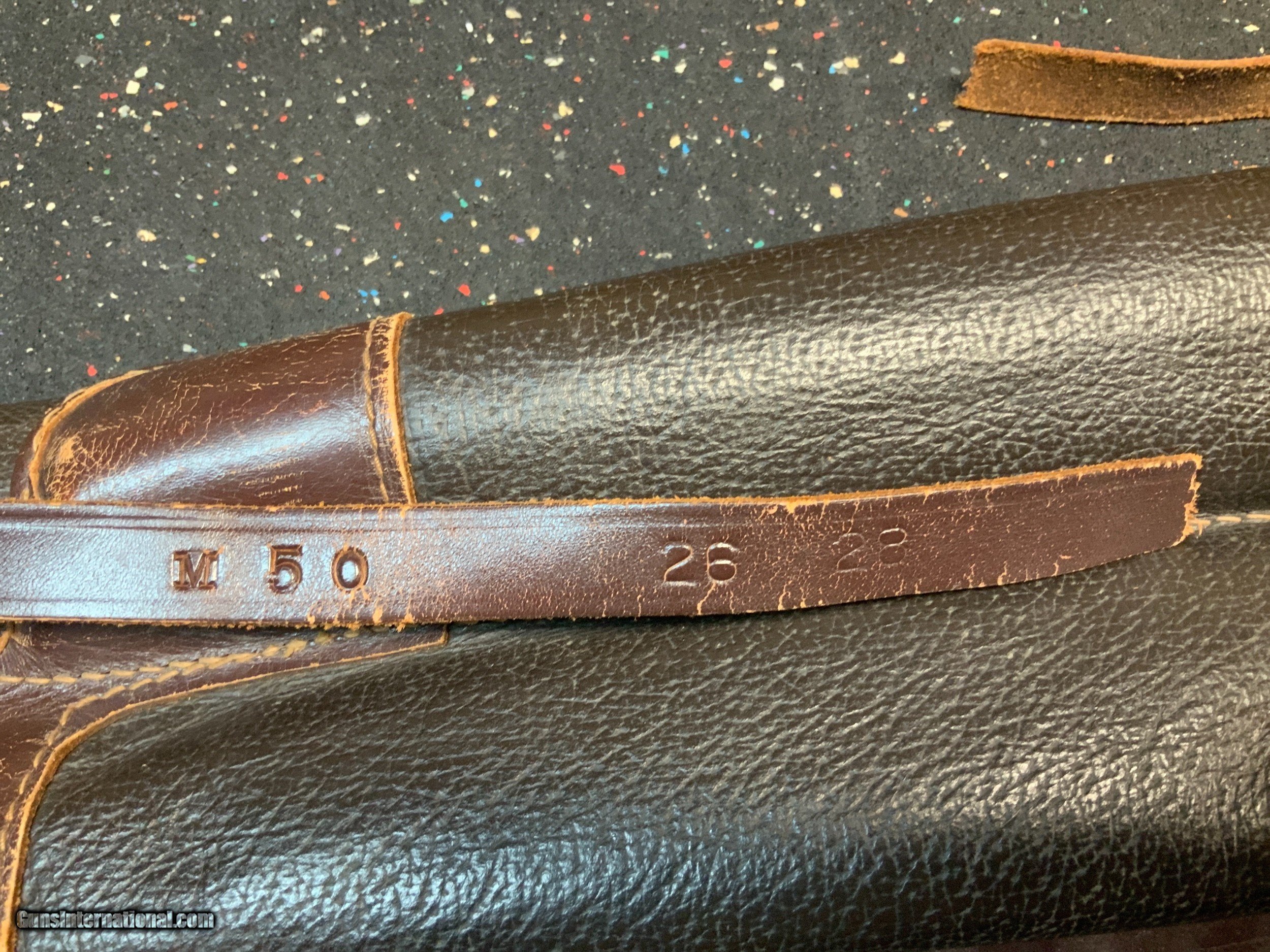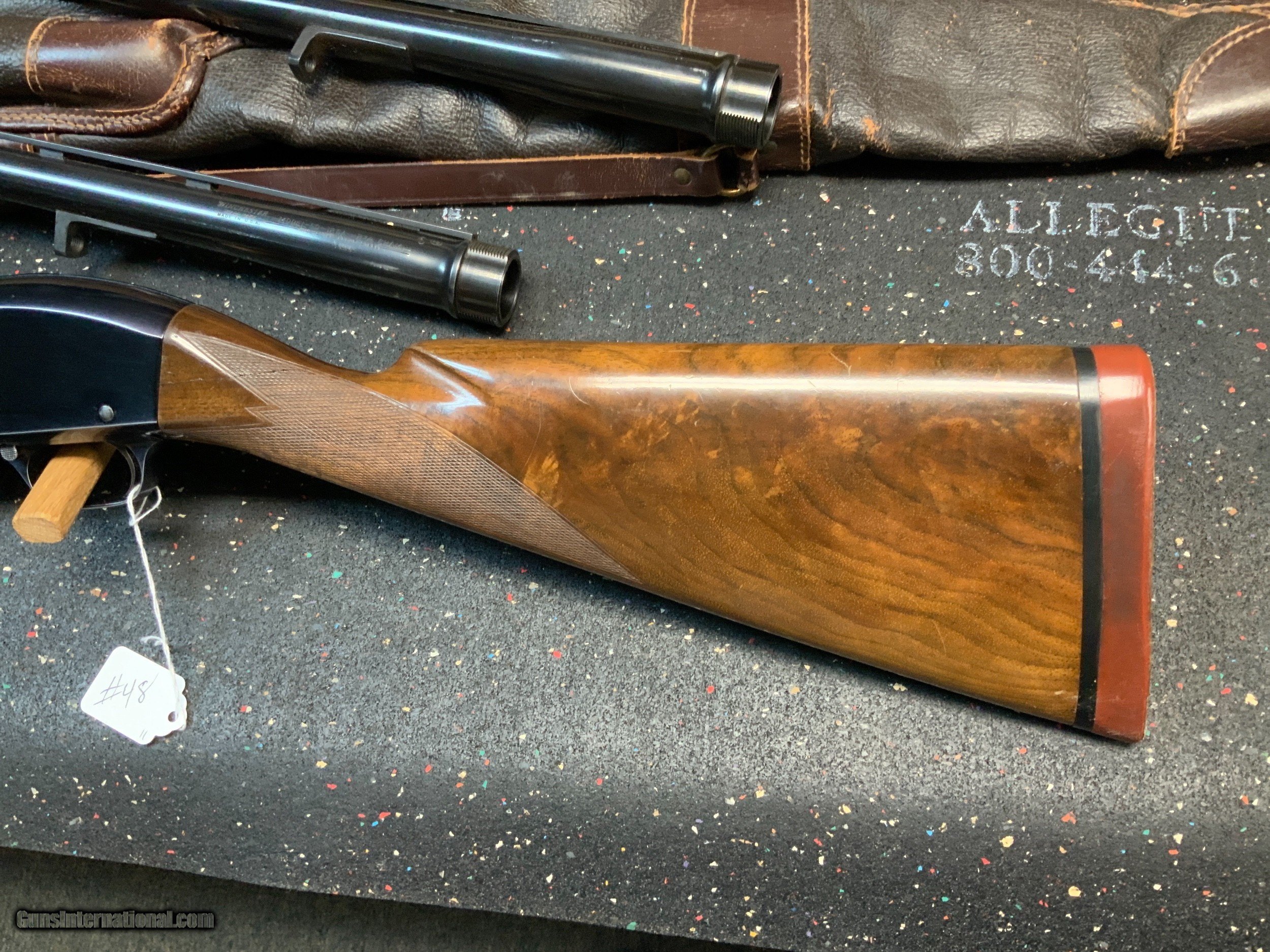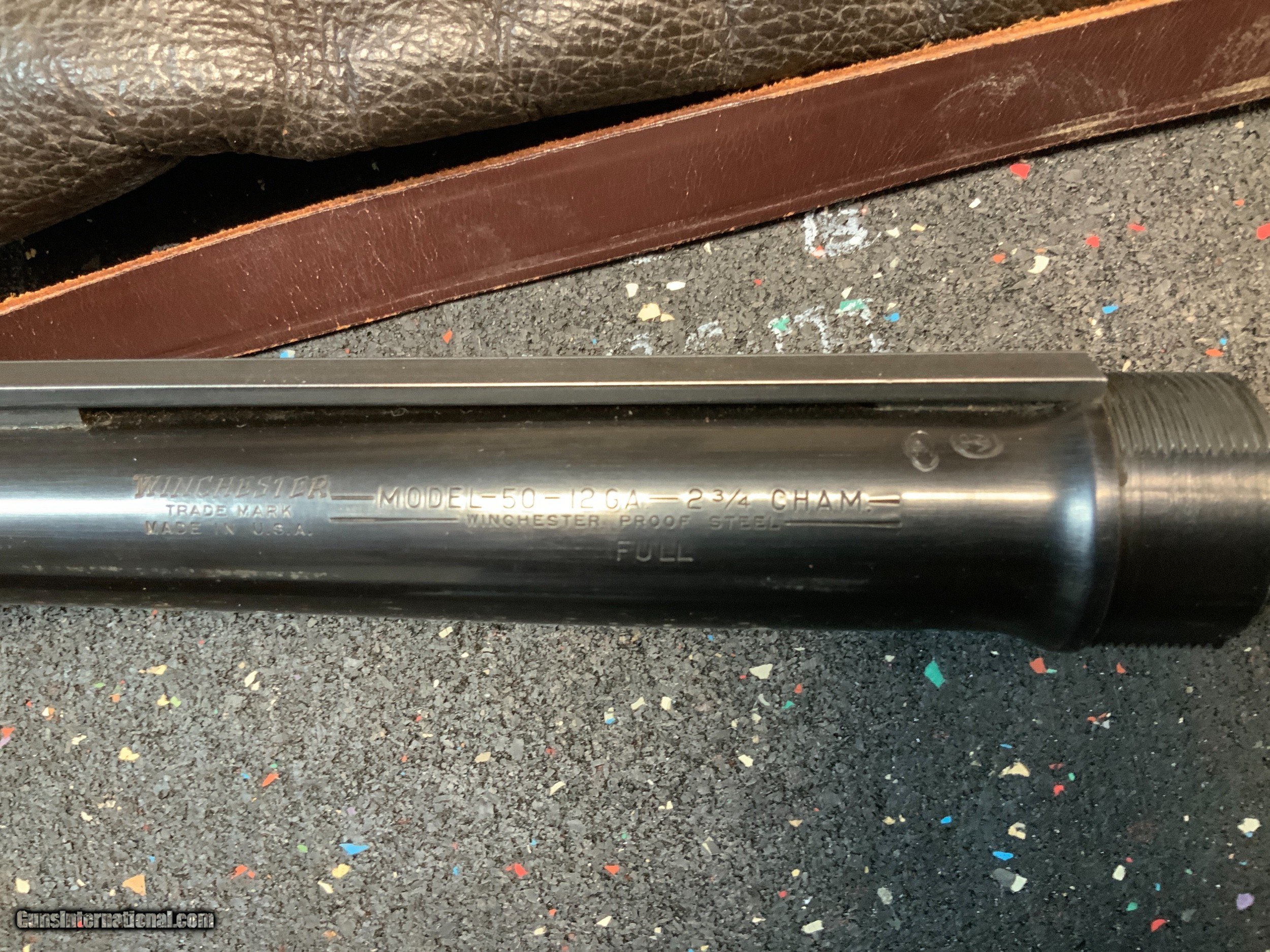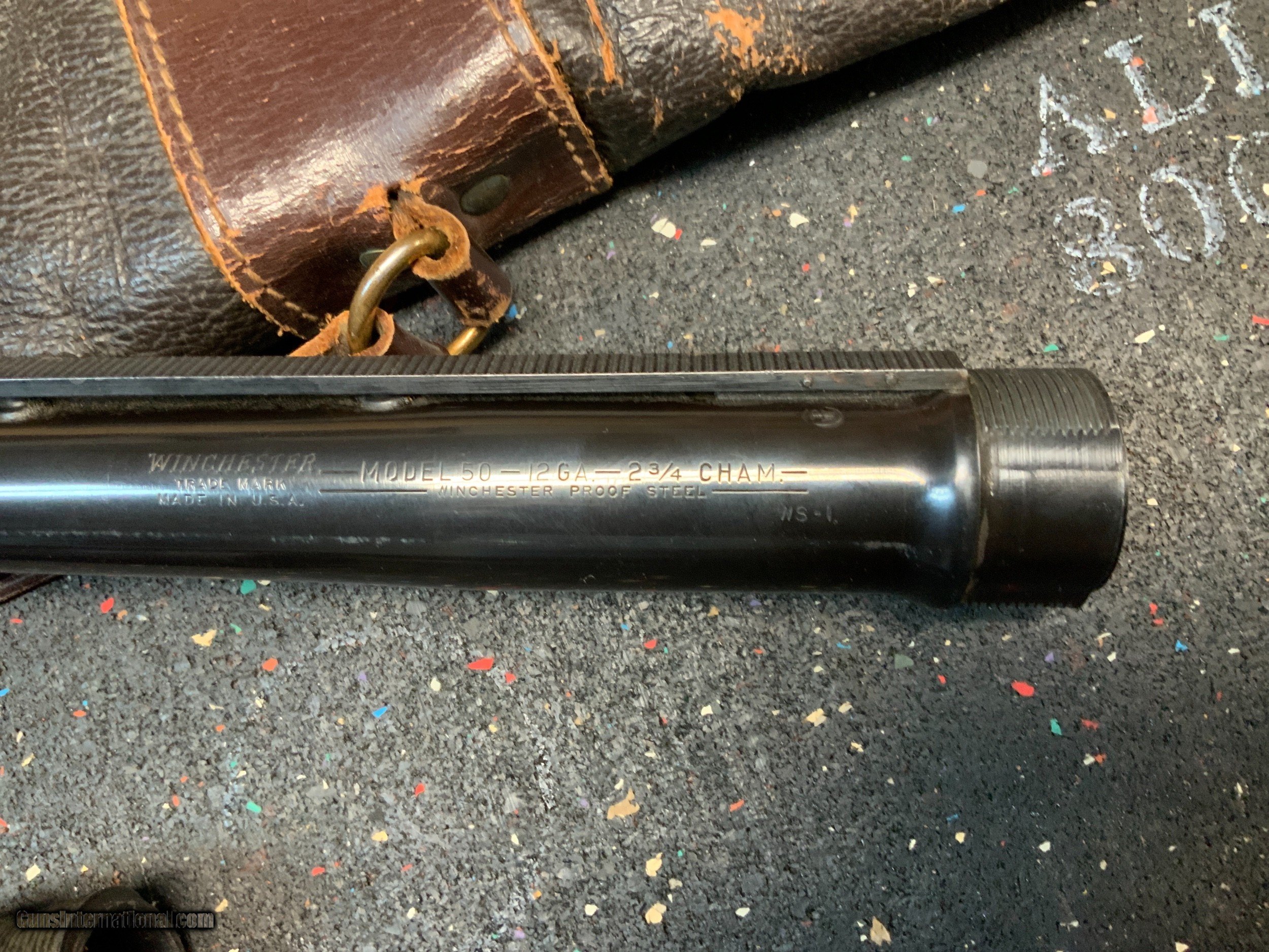 Description: Winchester model 50 featherweight 12 gauge semi-auto high grade 3 barrel set complete with vintage leather Winchester scabbard. Estate Gun obviously special ordered. Never seen anything like it. Super rare fancy wood English style straight buttstock with vintage solid rubber recoil pad. Featherweight version. Pictures show what you get in this amazing set. Barrel on the gun is a 28 inch modified choke vented rib configuration. 2nd barrel is a 28 inch full choke vented rib configuration. 3rd barrel is a 26 inch WS-1 choked donut post vented rib configuration. Leather case is stamped Winchester. Leather strap is broken but stamped "M50 26 28". Only small defect is the grain on top of the pistol grip has opened up on one side. This does NOT carry into the top or opposite side of the grip and doesn't appear to be split. More pictures available on request. Unique and rare to say the least. Please add $75 for shipping and insurance to your FFL or C&R. SOLD Curio/Relic: Yes Shotgun Gauge: 12 Gauge Manufacturer: Winchester Model: 50 Chambers: 2 3/4 inch Condition: Very Good Metal Condition: Excellent Wood Condition: Very Good Bore Condition: Excellent Barrels: Set of 3 Action: Semi-Automatic Stock: English Style Butt Pad: Hard rubber Rib: Vented Extras: Leather Carrying Case Case: Yes |