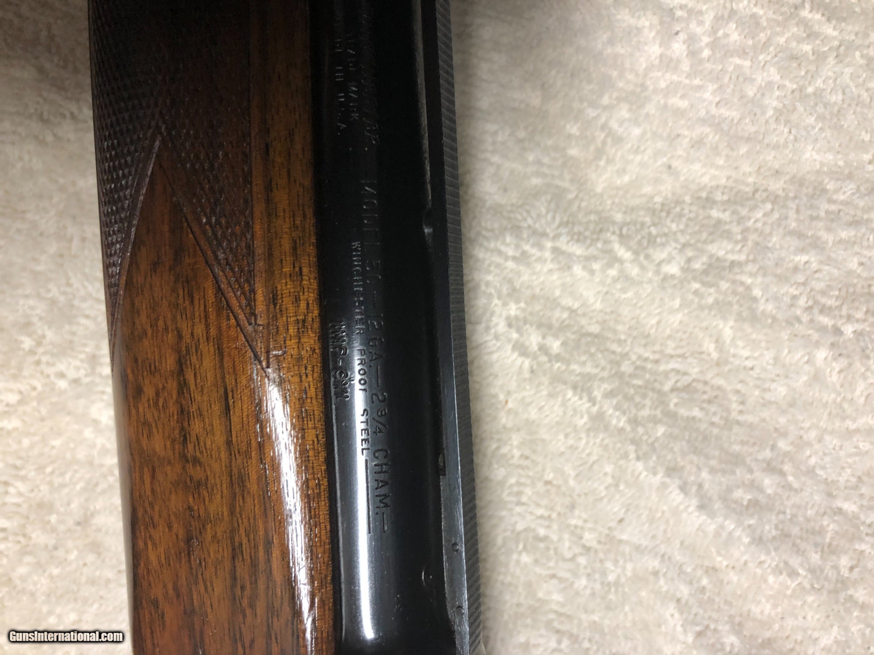 Description: This is a Winchester model 50 12 guage semi-auto shotgun with the rare original donut post vent-rib barrel. The barrel length is 26 inches with Improved Cylinder fixed choke. The gun is all steel and was manufactured in 1958. It does not appear to have been fired much and is in very good to excellent shape! The gun is all original except for a high grade pachmar recoil pad professionally installed with the length of pull being restored to it's original 14 inches... this is a sweet shooting gun with very little recoil... it will make an excellent bird or sporting clays gun for someone. SOLD Curio/Relic: Yes Shotgun Gauge: 12 Gauge Serial Number: 100174 Barrel Length: 26 inches Chambers: 2 & 3/4 Condition: 95% plus Metal Condition: 95%plus Wood Condition: 95% plus Bore Condition: Excellent Manufacture Date: 1958 |