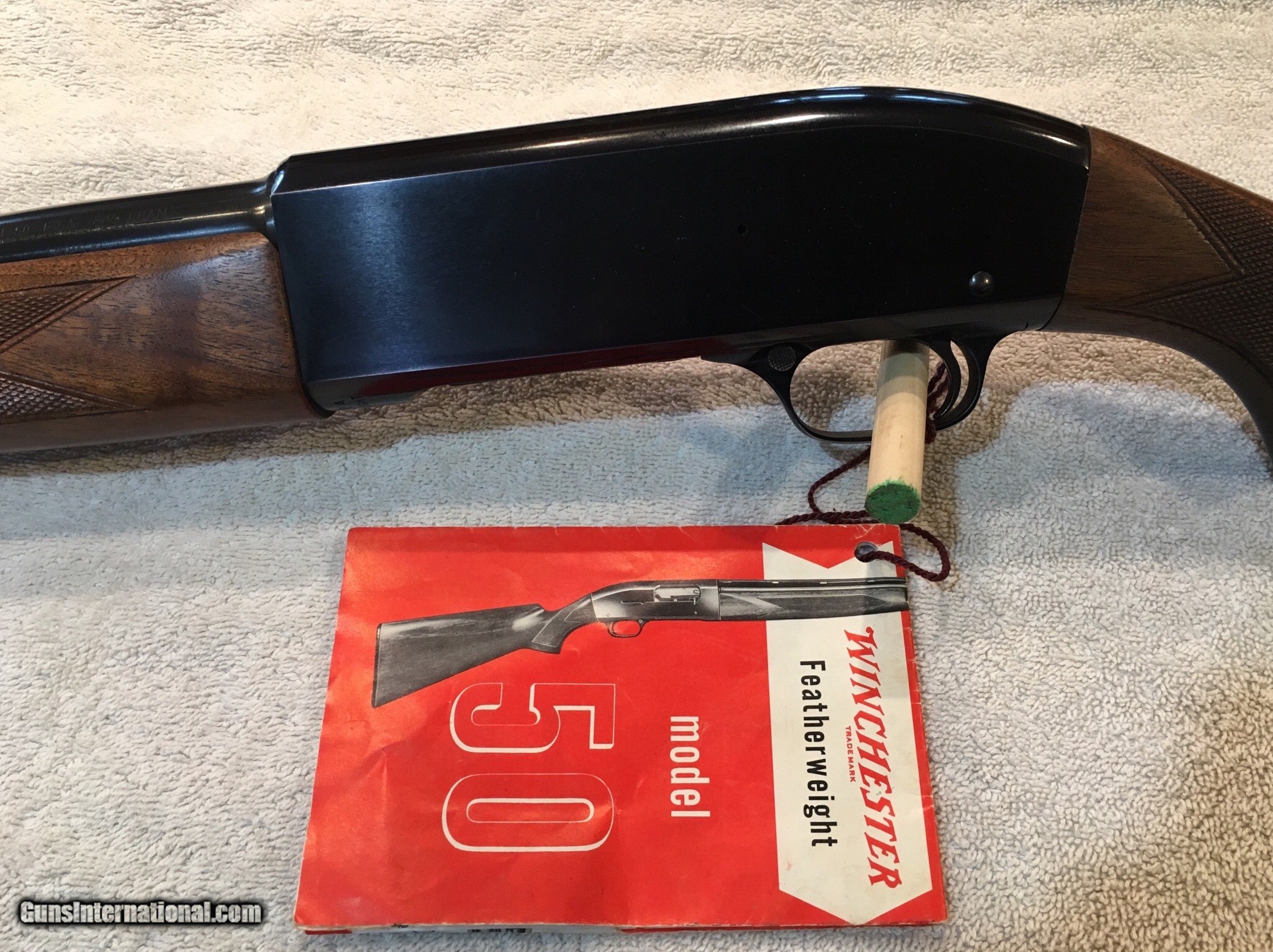 Description: Winchester Model 50 FW 12 ga 26” barrel, improved cylinder. Late gun, as-new condition.Beautiful walnut. No California Sales. SOLD Shotgun Gauge: 12 Gauge Manufacturer: Winchester Model: 50 Featherweight Barrel Length: 26 Condition: As-new Metal Condition: 99%+ Wood Condition: 99%+ Manufacture Date: 1962 |