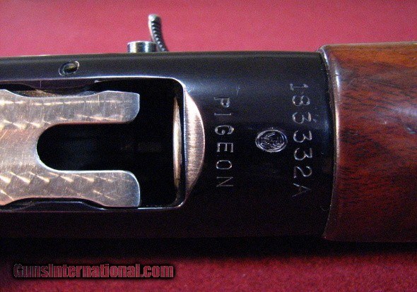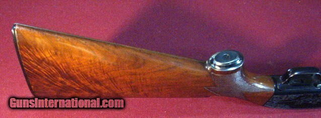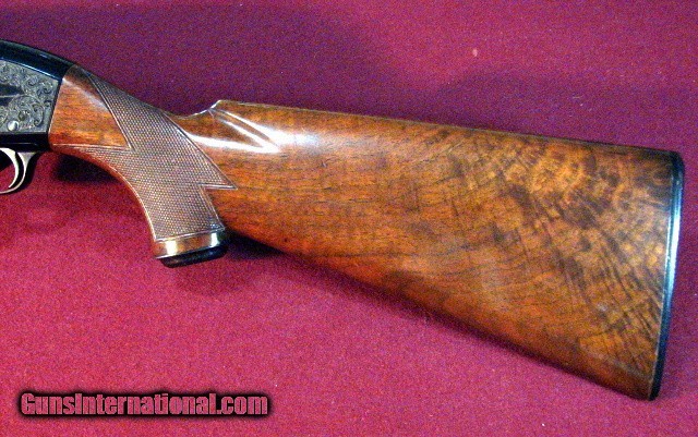 Description: Winchester Model 50 Pigeon Grade Feather Weight with Grade 5 factory engraving most likely by Nick Kusmit as this model was made from 1958-1961. This gun features a 26" WS-1 factory vent rib barrel with small silver mid bead and large white front bead. The bore is excellent. Buttstock with steel pistol grip cap and upgrade feathercrotch American Walnut that is very well figured. LOP is 14" to factory buttplate. Weighs in at 7lb 8oz This is a very nice piece and one of the rarest factory engraved models. It is in very good overall condition. Receiver and barrel blue at 99% Stock finish at 97% with minor scattered dents and dings from very light field use. Rarely seen. SOLD |