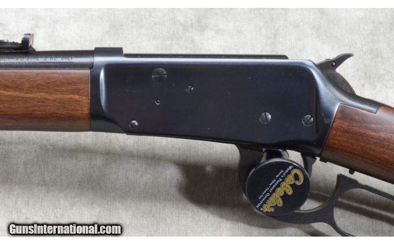 Description: The popular 9410 featuring nice straight grip walnut stock, fiber optic bead and semi-buckhorn open sights. It is drilled and tapped for scope mounting and has angle eject for a lower mount. SOLD Caliber Info: .410 Bore. Chambers: 9 + 1 capacity lever action. Metal Condition: Excellent, could pass for new. Wood Condition: Excellent - could pass for new, very well cared for. Bore Condition: Shiny and bright. Barrels: 24 Inch - blued, with open sights. Triggers: Factory trigger. Stock: Smooth straight grip dark walnut. Stock Dimensions: 13 - 1/2 Inch LOP. Fore End: Matching smooth walnut. Butt Pad: Black plastic plate. Weight: 6 lb. - 14 oz. Sights: Fiber optic bead and semi-buckhorn open sights. Drilled and tapped for scope. Chokes: Fixed Cylinder bore. Item Location: Grandville, MI |