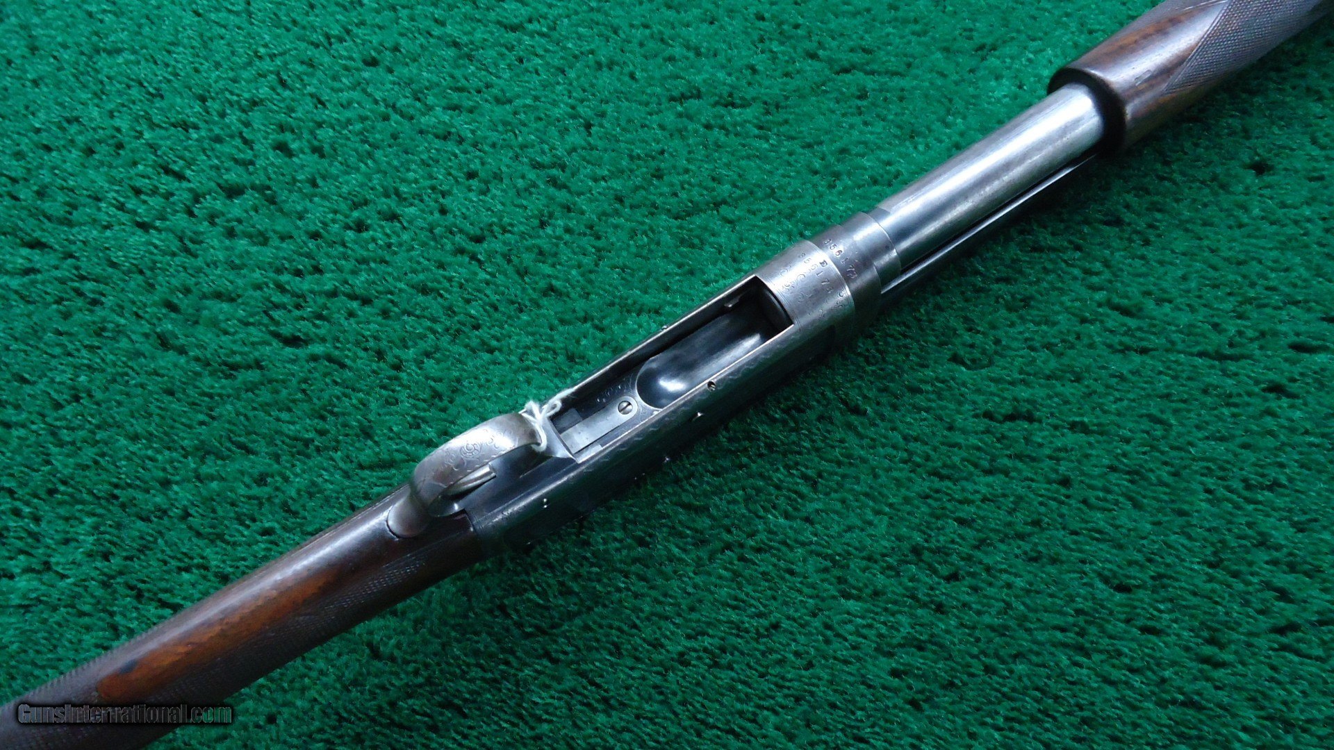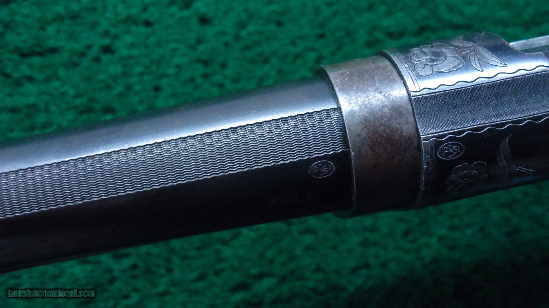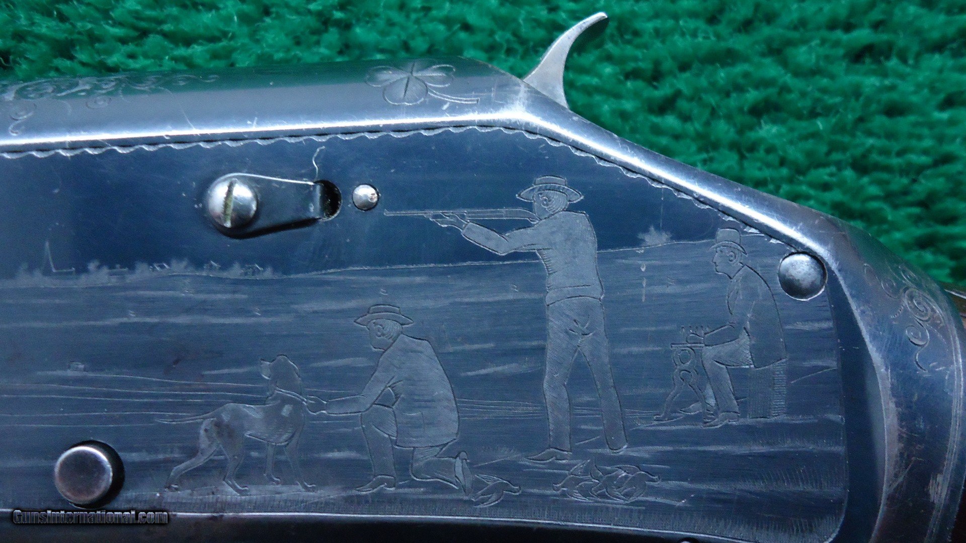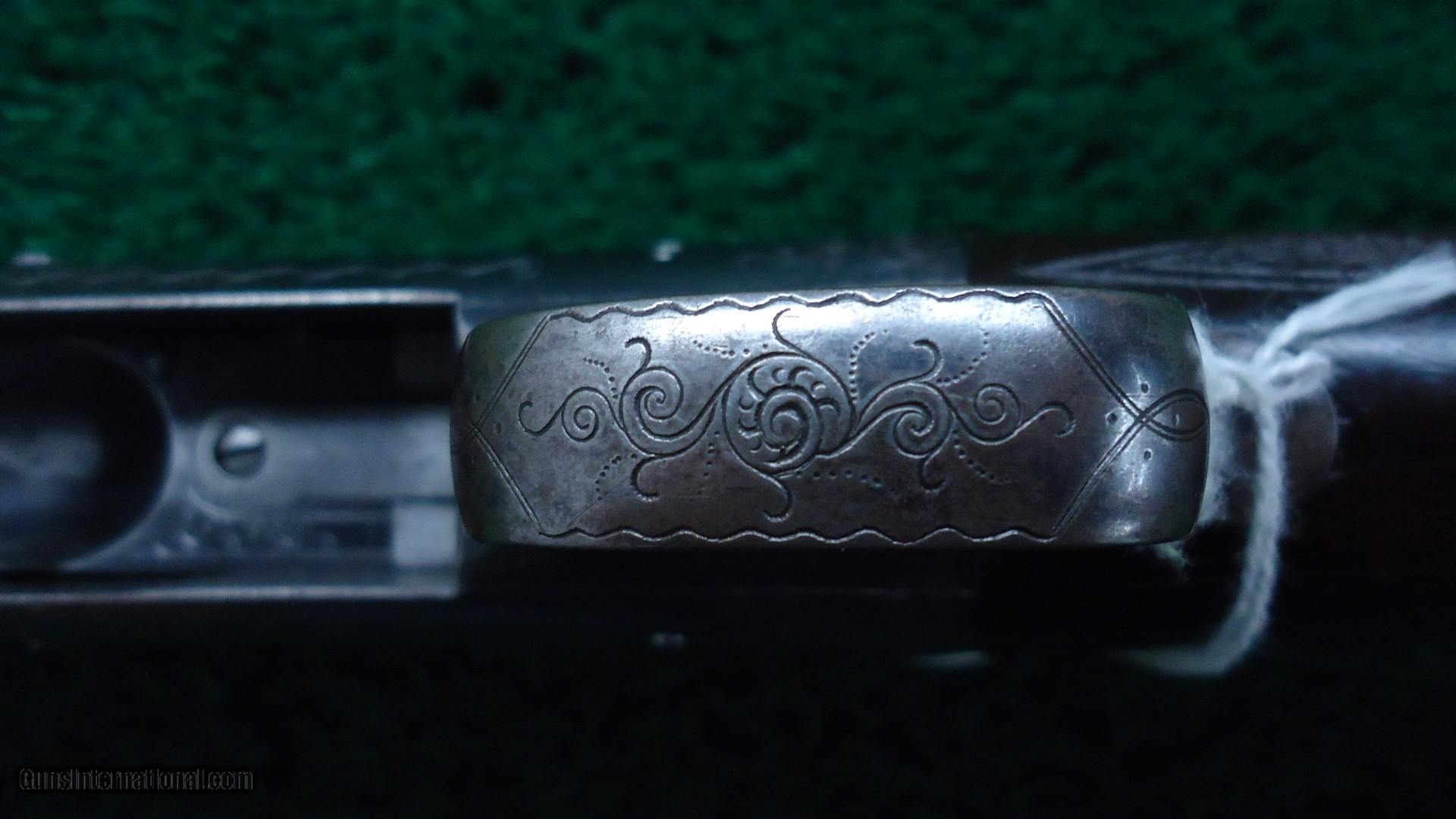 Description: Marked on the breech bolt is "Pigeon Gun". Gun is beautifully engraved with typical scene of 3 gentlemen and a dog shooting live pigeons over a trap ground. There is a rose engraved on the top of the receiver and a pigeon just behind the hammer. On the opposite side of the receiver is more game scenes. It is theorized that John Uhlrich engraved all of these. I don't know if that is true but it is quite possible. A very nice gun with a 30 inch plain matted rib barrel marked Full choke. Original fancy deluxe checkered wood is in very nice condition with sharp checkering and measures 13-1/2 inches to the end of a red recoil pad. Gun is overall very nice with 90% blue starting to tone slightly on the high points of the receiver. A few bad storage marks on the barrel. Other than that it is a pretty nice gun. Leroy Merz Antique Firearms specializes in antique and vintage Winchesters and other fine American firearms. Since 1965 Mr. Merz has taken part in the world of firearms and has been a contributor to many well known reference books. We have hundreds of additional guns in every price range at our home online. Search for Merz Antiques in google. SOLD Curio/Relic: Yes Shotgun Gauge: 12 Gauge |