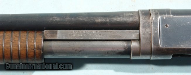 Description: EARLY WINCHESTER MODEL 1897 PUMP 12 GAUGE 32” FULL CHOKE SHOTGUN. Early production manufactured in 1909. 2 ¾” chamber. All matching and original with added Hawkins recoil pad. Slide bar with early “MODEL 1897/WINCHESTER/TRADE MARK” stamp and early long wrist short comb stock. Very good overall with moderately worn blue and stock finish. Perfect working order and excellent bore. Desirable 32” full choke barrel. SOLD Curio/Relic: Yes Shotgun Gauge: 12 Gauge |