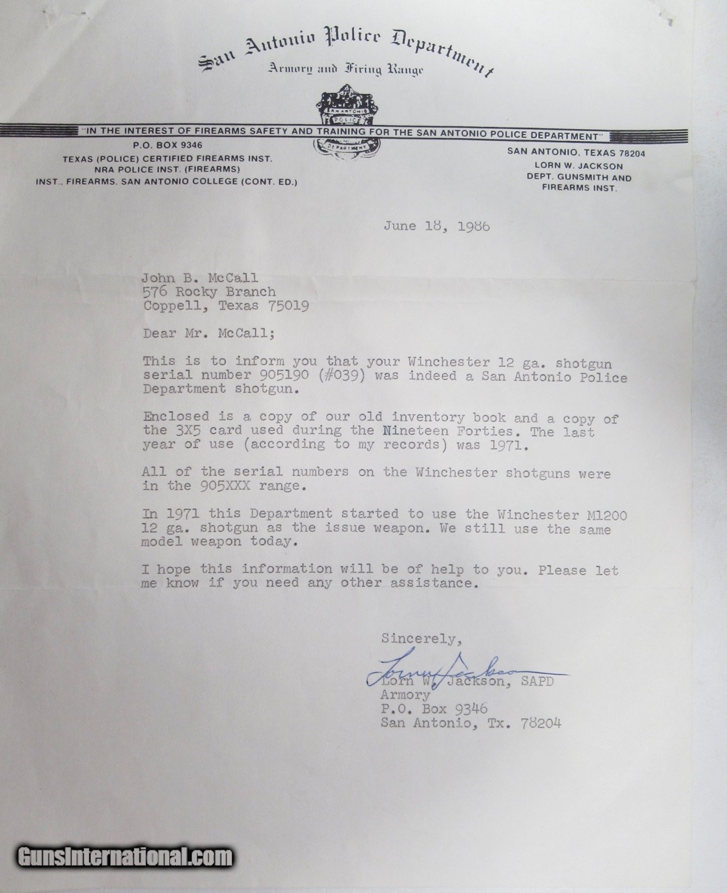 Description: Winchester Model 1897 Riot Shotgun; Serial No. 905190; Made 1942; 12 Gauge; 20” Cyl. Choke Barrel; Left Side of Receiver Marked “SA POLICE NO 39”; Right Side of Stock Marked “SA POLICE NO 39”; Included with Shotgun is a Letter Dated June 18, 1986 from Lorn W. Jackson SAPD Armory Verifying Originality of Weapon and a Copy of the Original Inventory Card; Also a List of Model 97’s from SAPD; These were in use from 1940’s to 1971 When Replaced by M1200 Winchester Shotguns; Most Original Blue Remains; Solid Wood but Butt Stock Shows Use in Rack or Patrol Car; Perfect Bore and Action; 100% Original; See All Photos for Condition; No Texts; Call (254)541-5765 or Email Only; PERSONAL PROPERTY of Harold Wieser; Price: $2,475 + $75 S&H Via USPS PRIORITY MAIL; Payment Address: Harold Wieser - 1466 U.S. Hwy 77 - Rosebud, TX 76570; SEND PAYMENTS VIA USPS PRIORITY MAIL; BEWARE of SCAMS!!! – DO NOT SEND MONEY or CORRESPONDENTS ELECTRONICALLY UNLESS YOU HAVE SPOKEN to HAROLD WIESER FIRST! 254-541-5765 SOLD Manufacturer: Winchester Model: 1897 Serial Number: 905190 |