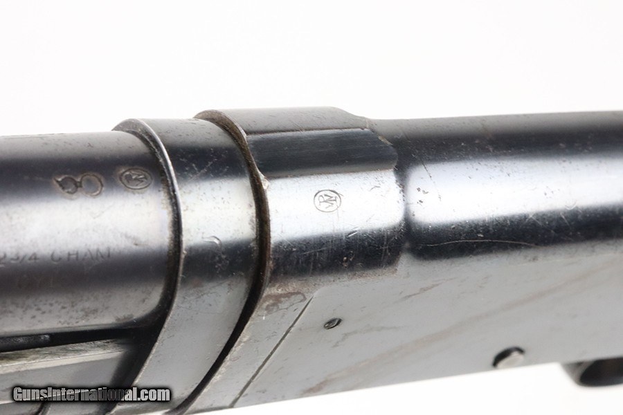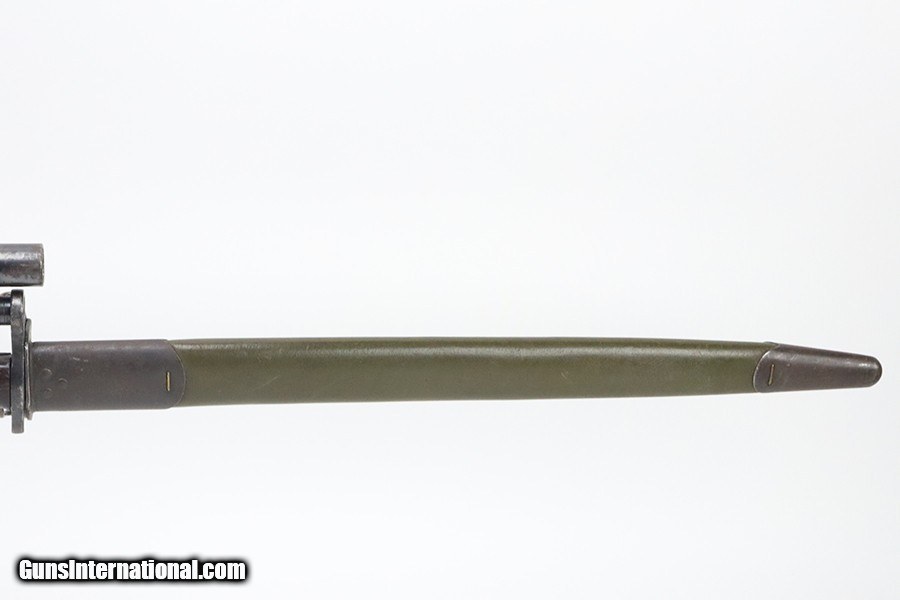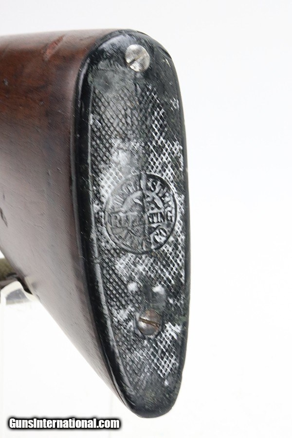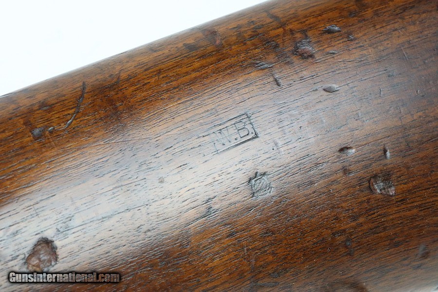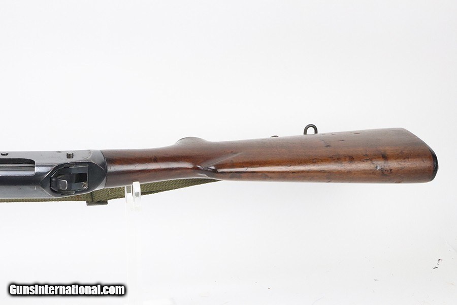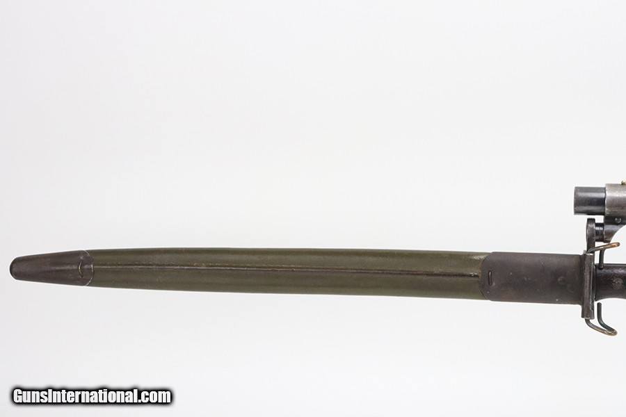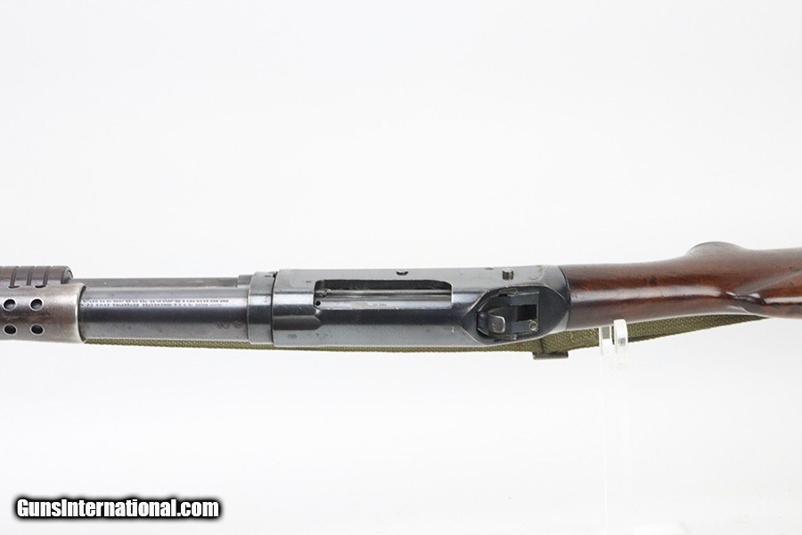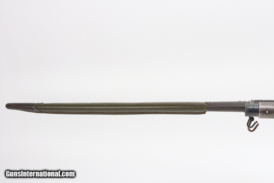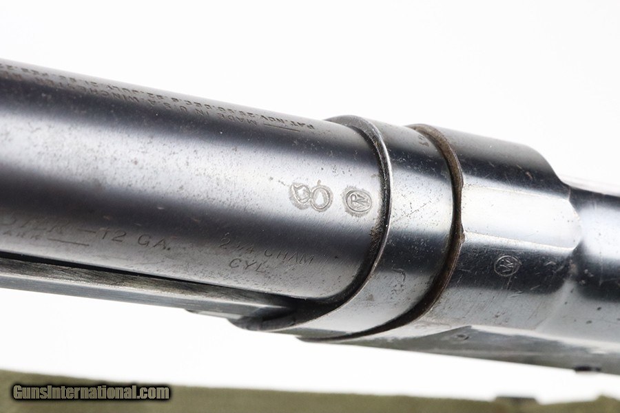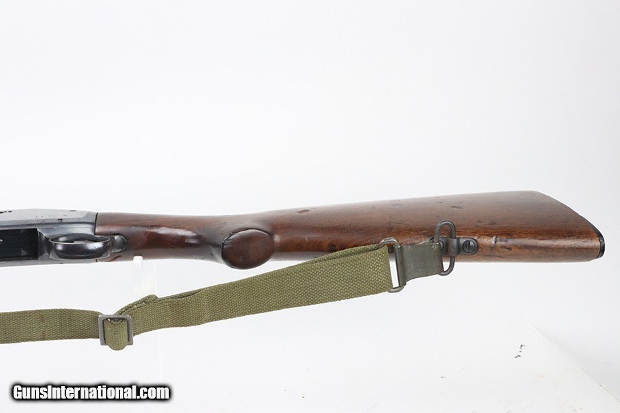 Description: This is a rare and desirable Winchester Model 97 trench shotgun from 1942 with original bayonet and scabbard. This shotgun is in the proper serial number range for WW2 trench examples, and correctly has martially marked receiver. Other correct features include the WB inspector's mark on the stock, with Winchester marked buttplate, a small separation between the muzzle of the barrel and the nose cap of the bayonet lug assembly, a 20in barrel with 'cyl' marking, the mag tube with two sets of holes, stock inletted for sling swivel, unmarked action bar, and more. Unfortunately, there are signs that the sight bead was removed, and this is a later WW2 heat shield so it does look like this heat shield was added or swapped post factory. The bluing on the shotgun is original, but shows a patch of wear on the left side of the receiver and some more thinning on the heat shield/bayo lug. Strong, shiny bore. The stock has various dings and dents but no cracks. Comes with a canvas sling, and the scarce, original bayonet. The bayonet is Winchester made and in great shape, with original scabbard present. SOLD Curio/Relic: Yes Shotgun Gauge: 12 Gauge |
