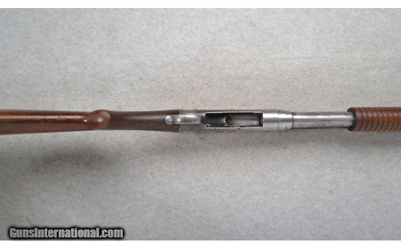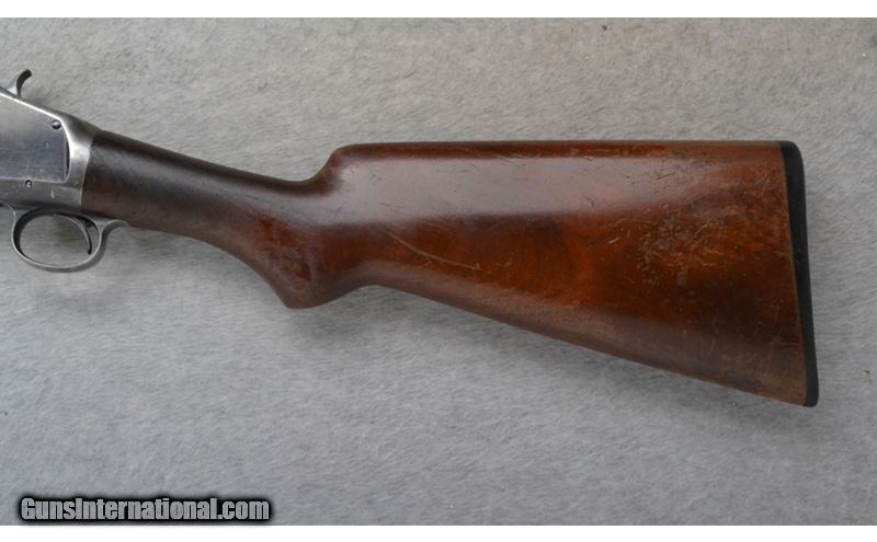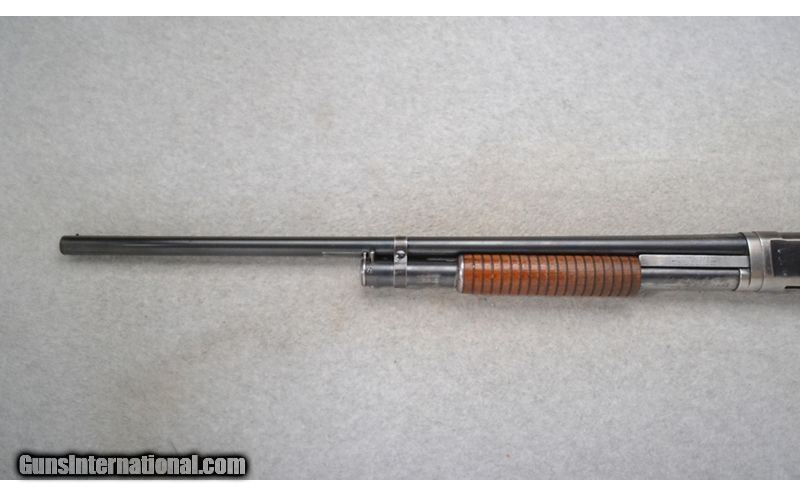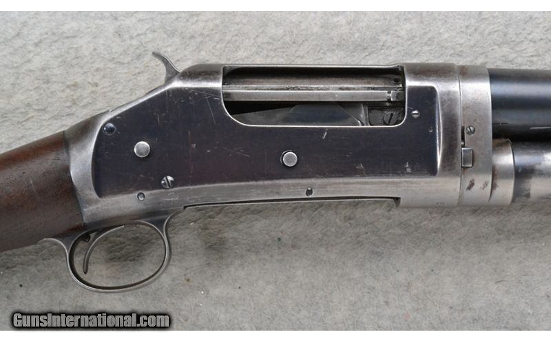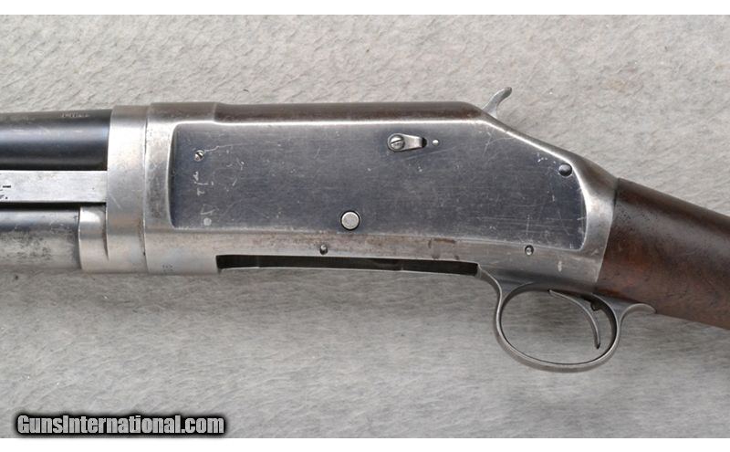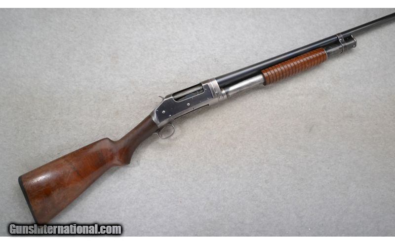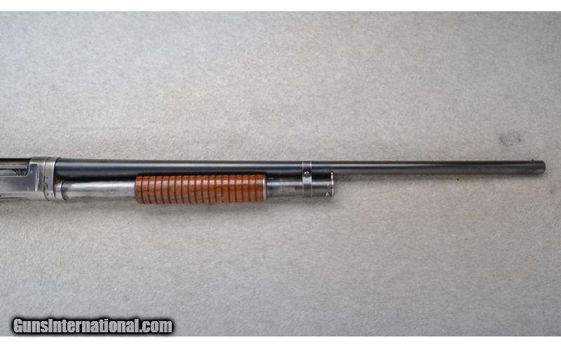 Description: This Winchester Model 1897 is a right hand pump action repeating shotgun in 16 Ga. It has a 28 inch barrel with a brass bead front sight. With a 2.75 inch chamber it has a fixed Full choke. The butt stock is a smooth grip walnut pistol grip. The forearm is a grooved grip walnut. S/N 589706 (1916). 16 Gauge SOLD Curio/Relic: Yes Chambers: 2 3/4 inch. Metal Condition: "Fair. Has blue wear, handling marks and freckling/light rust spots. Wood Condition: Fair. Has wear and handling marks. Bore Condition: Fair. Barrels: 28 inch. Stock Dimensions: LOP 13 1/4 inches. Fore End: Grooved grip walnut. Butt Pad: Winchester checkered black plate. Weight: 7 Lb. 6 Oz. Sights: Brass bead front. Chokes: Fixed Full. Item Location: Richfield, WI |