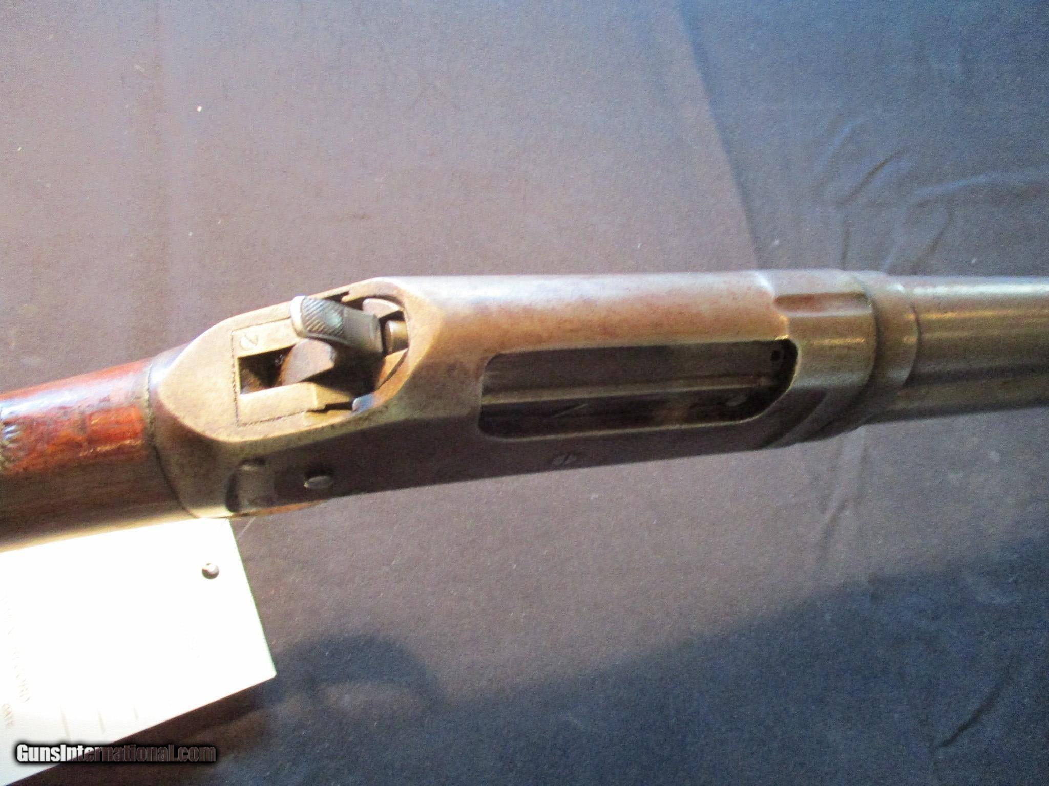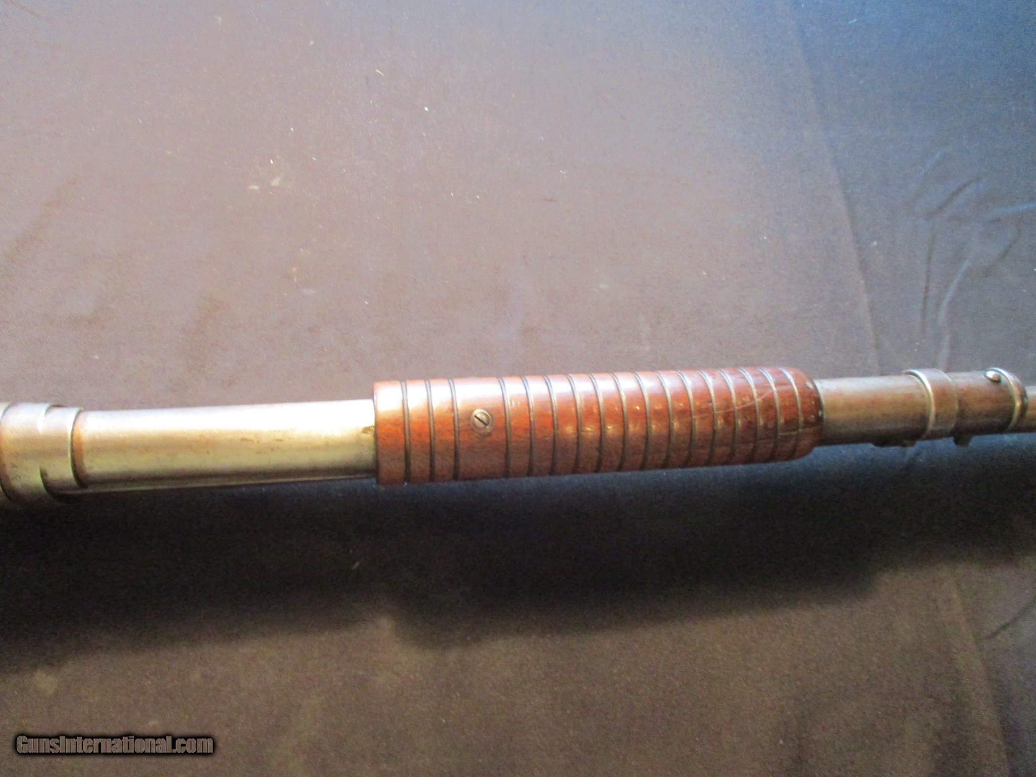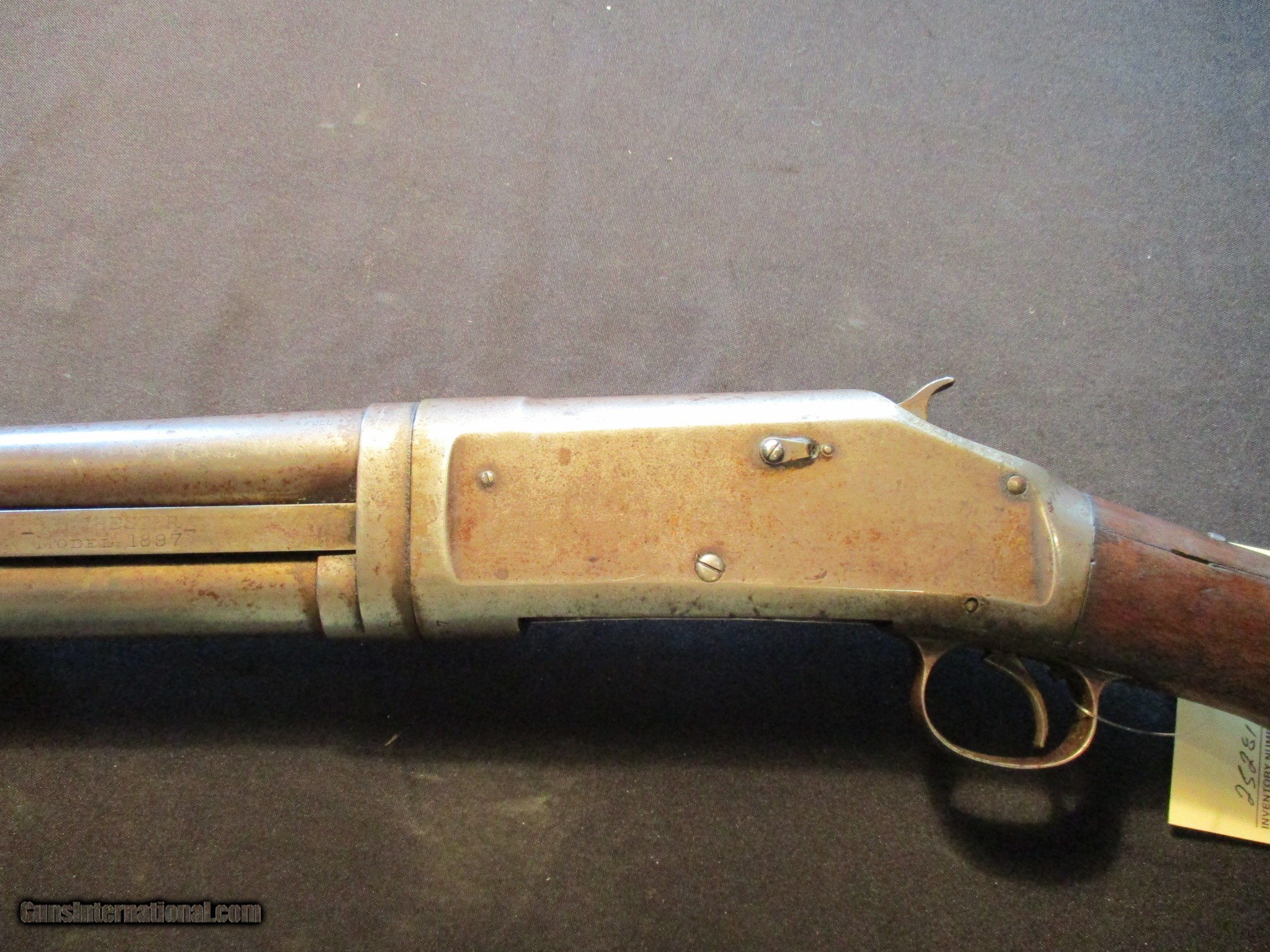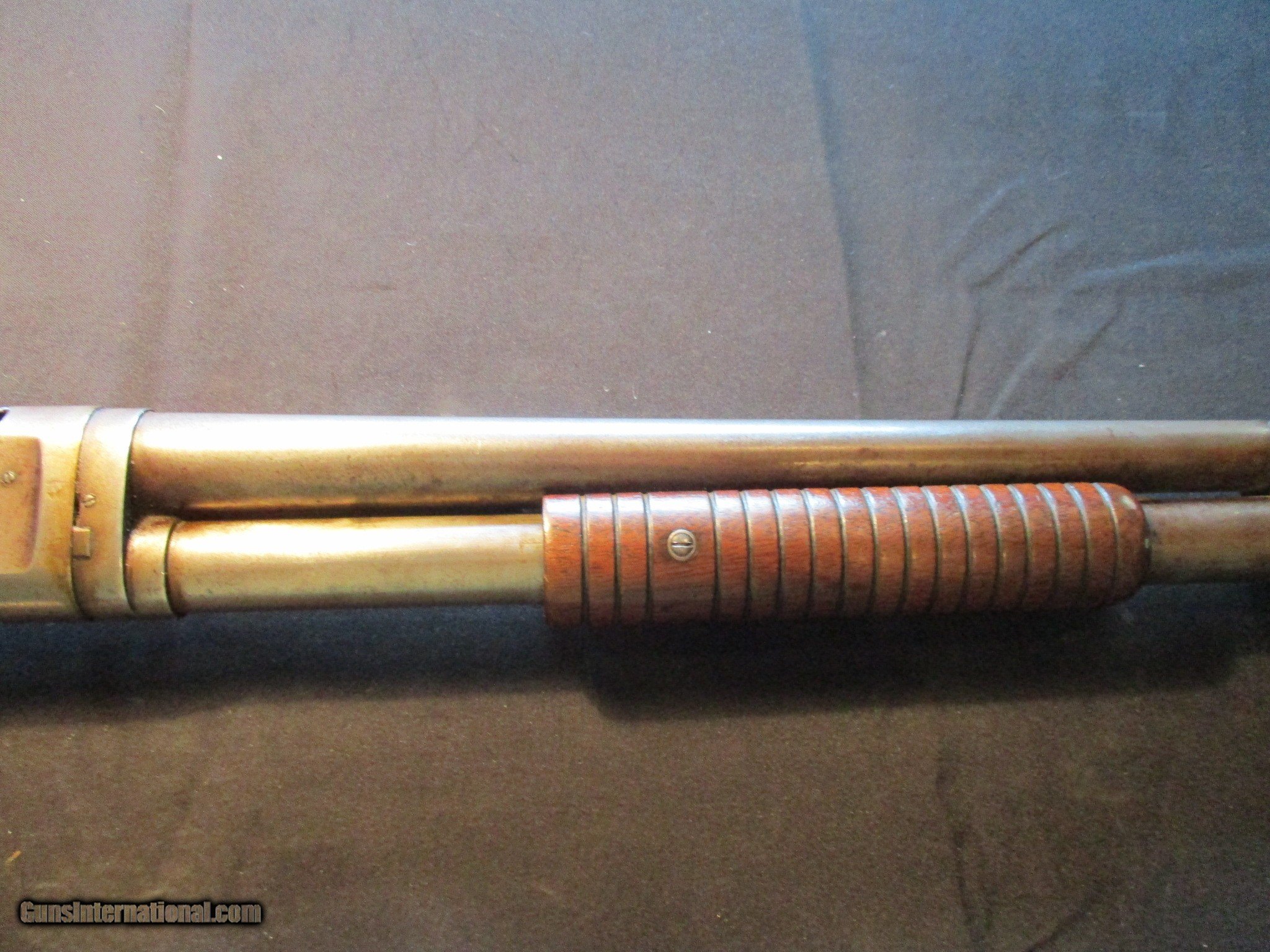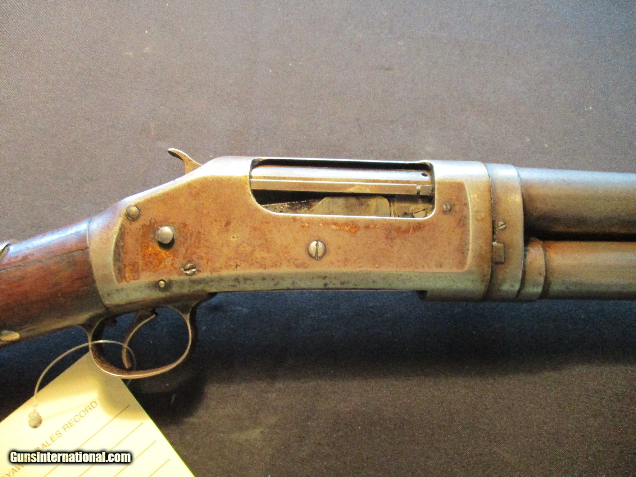 Description: Winchester Model 1897., 12ga, 2.75" chamber, 32" plain barrel, fixed full choke. SN is 1892xx, factory finish on both wood metal. Stock has been cracked and repaired as shown, looks pretty cool, testament to the turn of the century mentality of "Fix" not "replace or throw away". It is a bit loose at the joint, there is a way to tighten them, but I cant remember how. Email me if you would like these pics sent to you, they will come through bigger and better than on the listing page here. We do offer Lay-A-Way. Our standard terms are 25% down, 90 days. Initial deposit is not refundable. Email me with any questions. I am a store front dealer, and I will close s if the gun sells locally. Once it has aI will pull it from my shelves. Please check your local laws to confirm it is legal to own in your state! Buyer pays $25 shipping and insurance to your FFL in the lower 48. AK, HI or PR is extra. I will ship to California, NO PROBLEM! All my guns come with a non firing, 3 day unconditional return privilege, from the day UPS delivers to your dealer. Buyer pays shipping both ways if the gun comes back. I can add a new hard case by PLANO for secure shipping for $25 if the buyer wishes (highly recommended, cheap insurance, really helps keep the UPS monster from eating my guns!). No sales tax on guns ship out of Kansas, guns sold in Kansas are subject to Kansas sales tax. I am a licensed FFL, and will include a copy of my FFL with the gun for your dealers records. I will ship to a C&R if the gun is eligible. I will ship to California, but you need to confirm the gun is legal where you are, California or other. I am always looking for good clean, old original Winchesters to buy, consign, or trade, especially pre '64's model 70's and model 54's. WE ALSO TRADE FOR CLASSIC CARS AND TRUCKS! Email me with any questions, and good luck! SOLD |