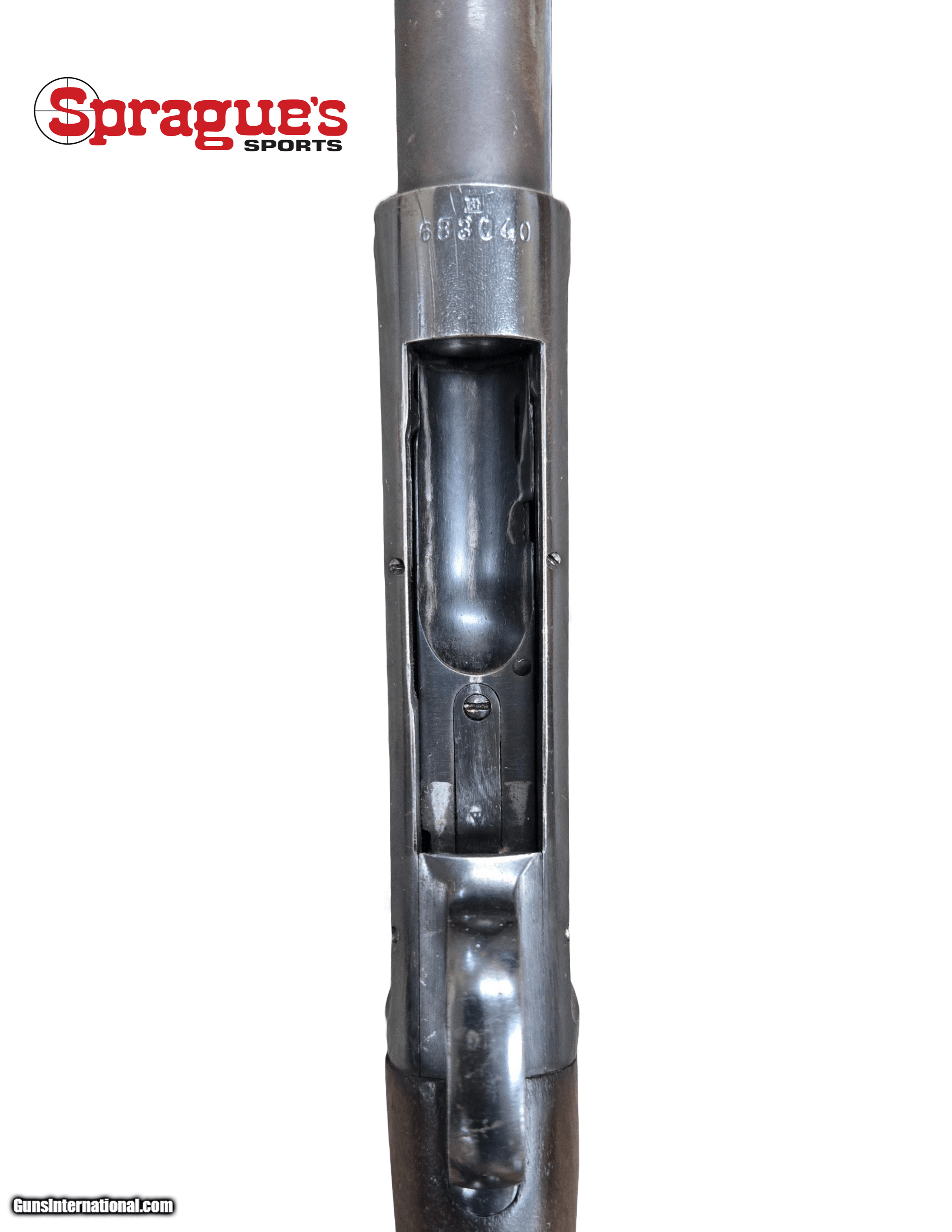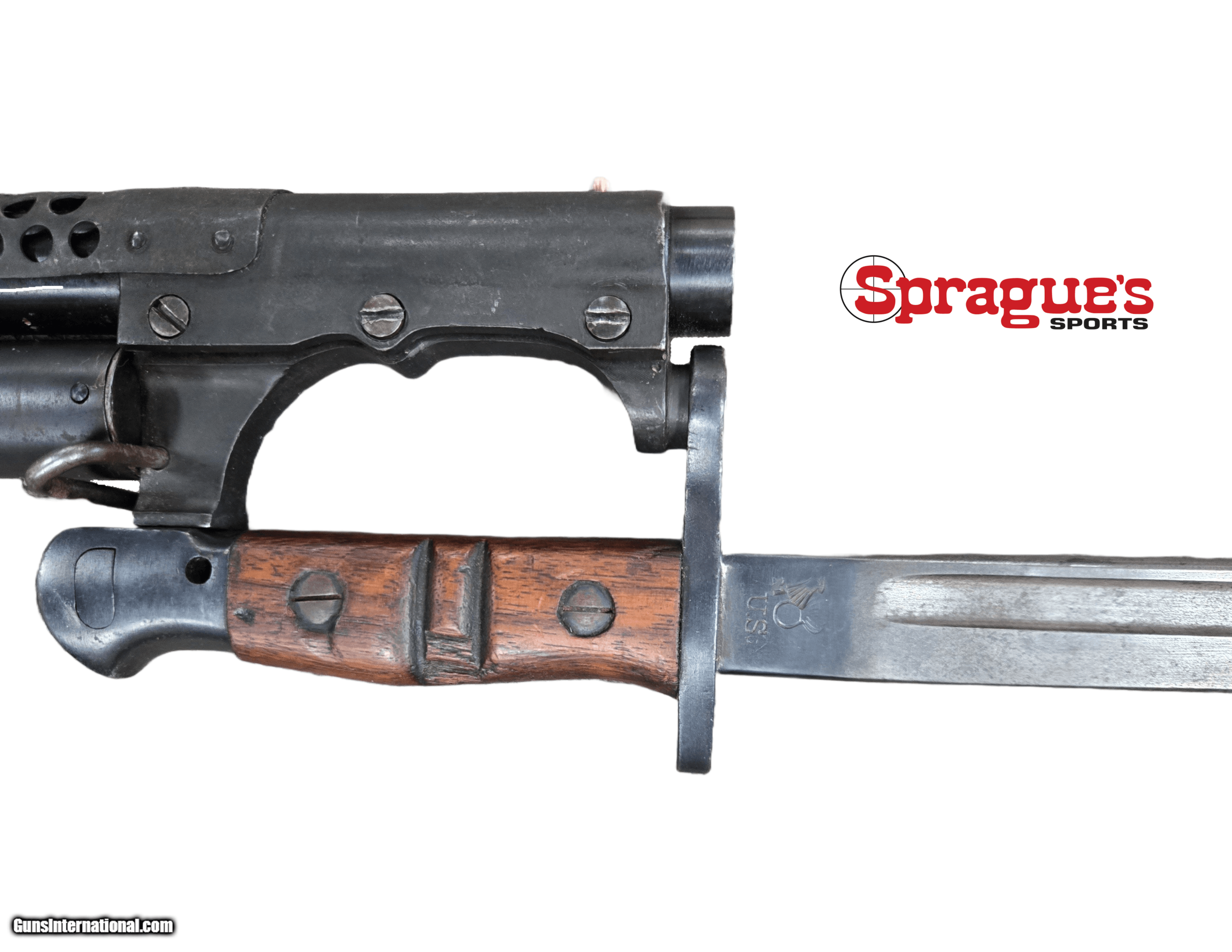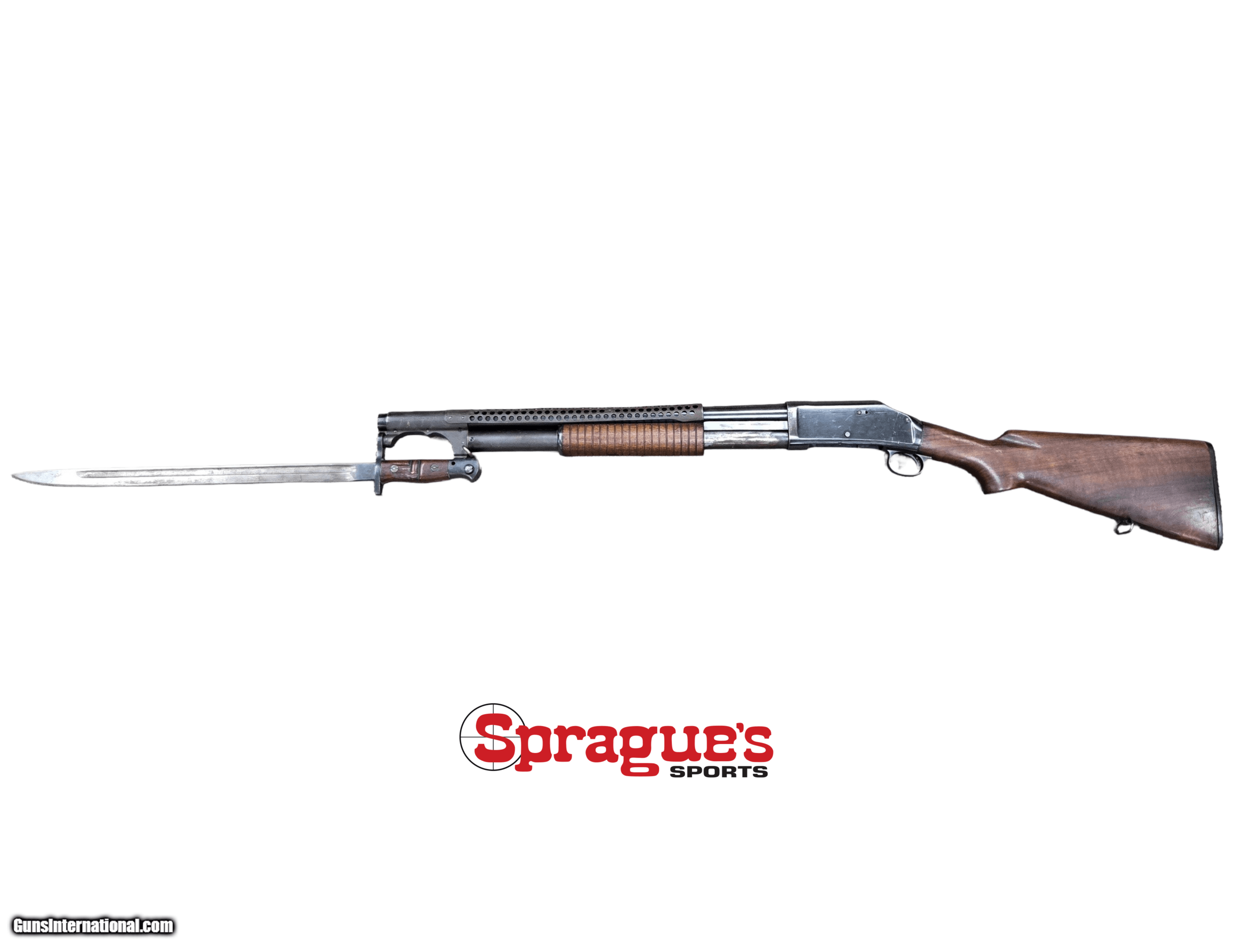 Description: Winchester Model 1897 Trench Configured . Serial no. E683040 12ga, 20" bbl with factory marked Cyl choke. Blue / Parkerized finish, walnut stock manufactured in 1918, subsequently reconfigured as a trench shotgun with added WWI era 6-hole ventalated heat shield/bayonet lug assembly marked: 'PAT.JAN. 15&MAR.19.1918. 13 3/4" lop. Condition: Very good as refinished and reconfigured with some of the finish, cycling and edge wear, smooth brown patina on the balance. Scattered freckling with some patches of light pitting. Wood is very good with some minor dents and scratches and smail crack in the buttplate. Mechanically excellent. Also included is a US marked Remington 1917 bayonet. This gun belonged to a US Army pilot and saw action in Viet Nam per family history. SOLD Curio/Relic: Yes |