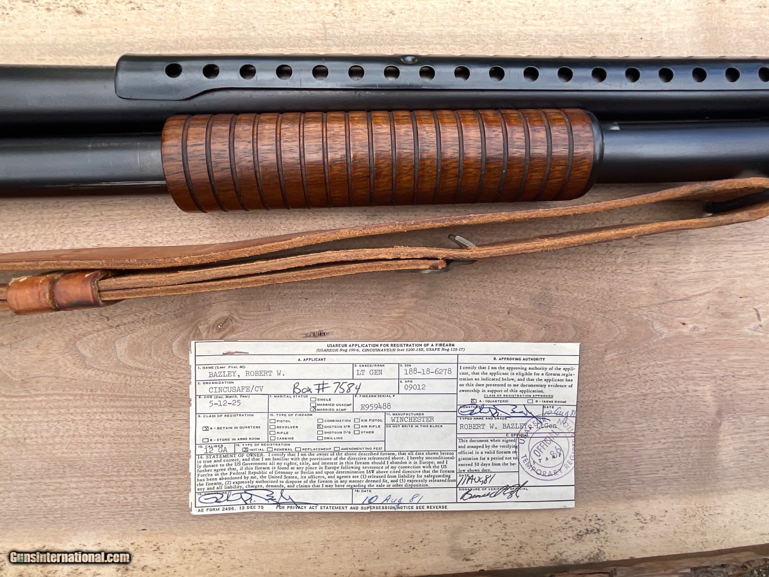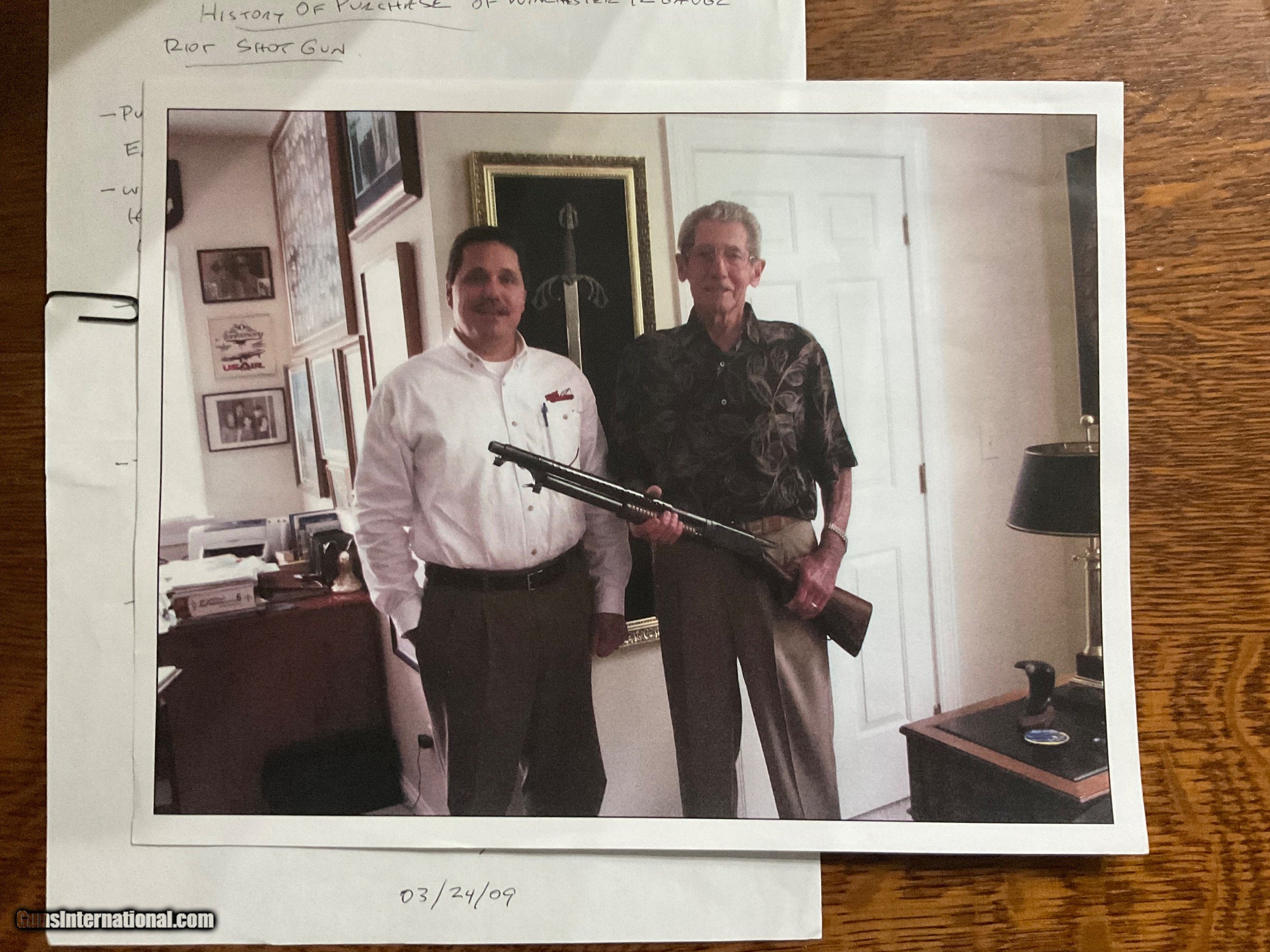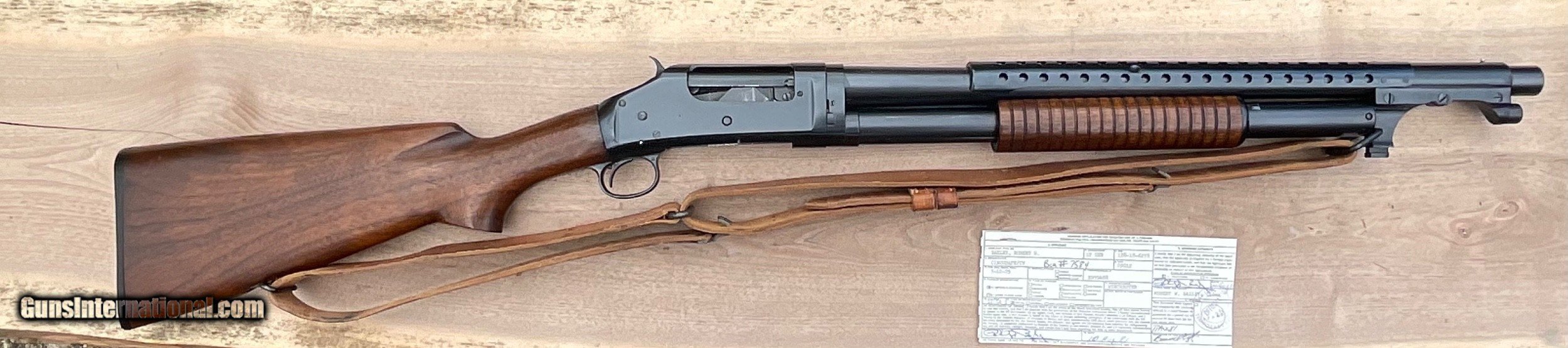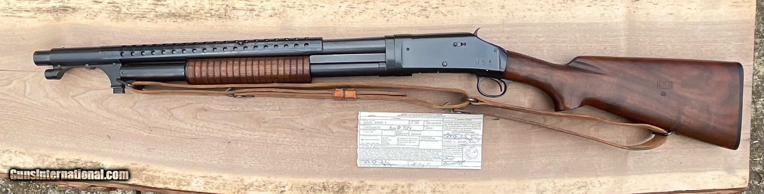 Description: Offered for sale is a benchmarck example of the WW2 Winchester M1897 Trench shotgun. 100% original Trench gun that was privately purchased by a career Air Corps General at a RAF base in England. Included is a signed letter from the General detailing the ownership and purchase of the weapon. Also included is a signed Weapons Registration card serial numbered to the shotgun. The shotgun has matching numbers and nearly all of its beautiful Winchester blueing. The stock is mint and correctly marked with the GHD/Crossed Cannons cartouche. The sling is marked BOYT 44 and is in super condition as well. These combat shotguns have been appreciating very well and almost always sell for big dollars at the large venues. Truly an impossible to upgrade example of the Winchester M1897 WW2 Trench. The collector in the picture was a friend of mine who recently passed away. He purchased this shotgun directly from the General in 2009. SOLD Manufacturer: Winchester Model: 1897 |