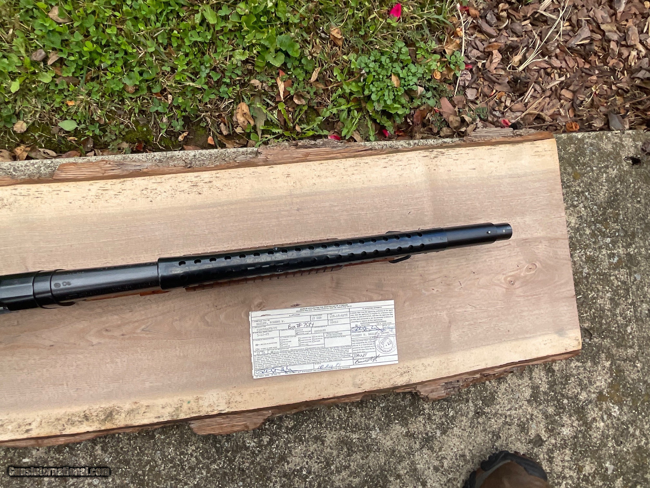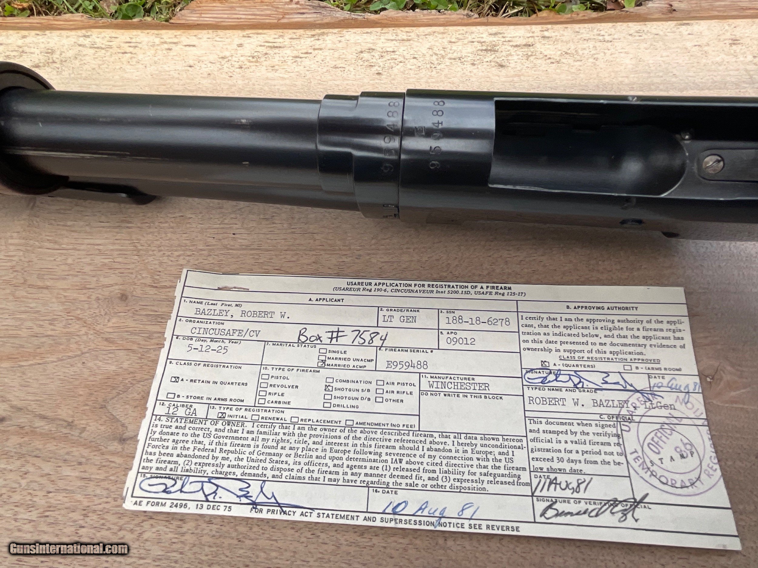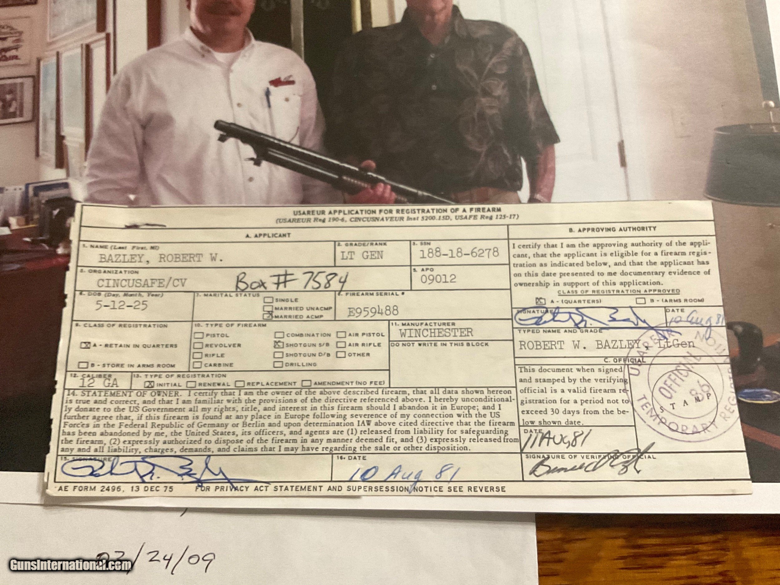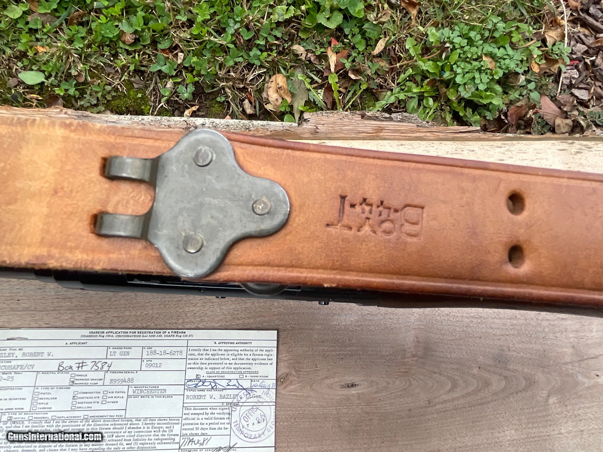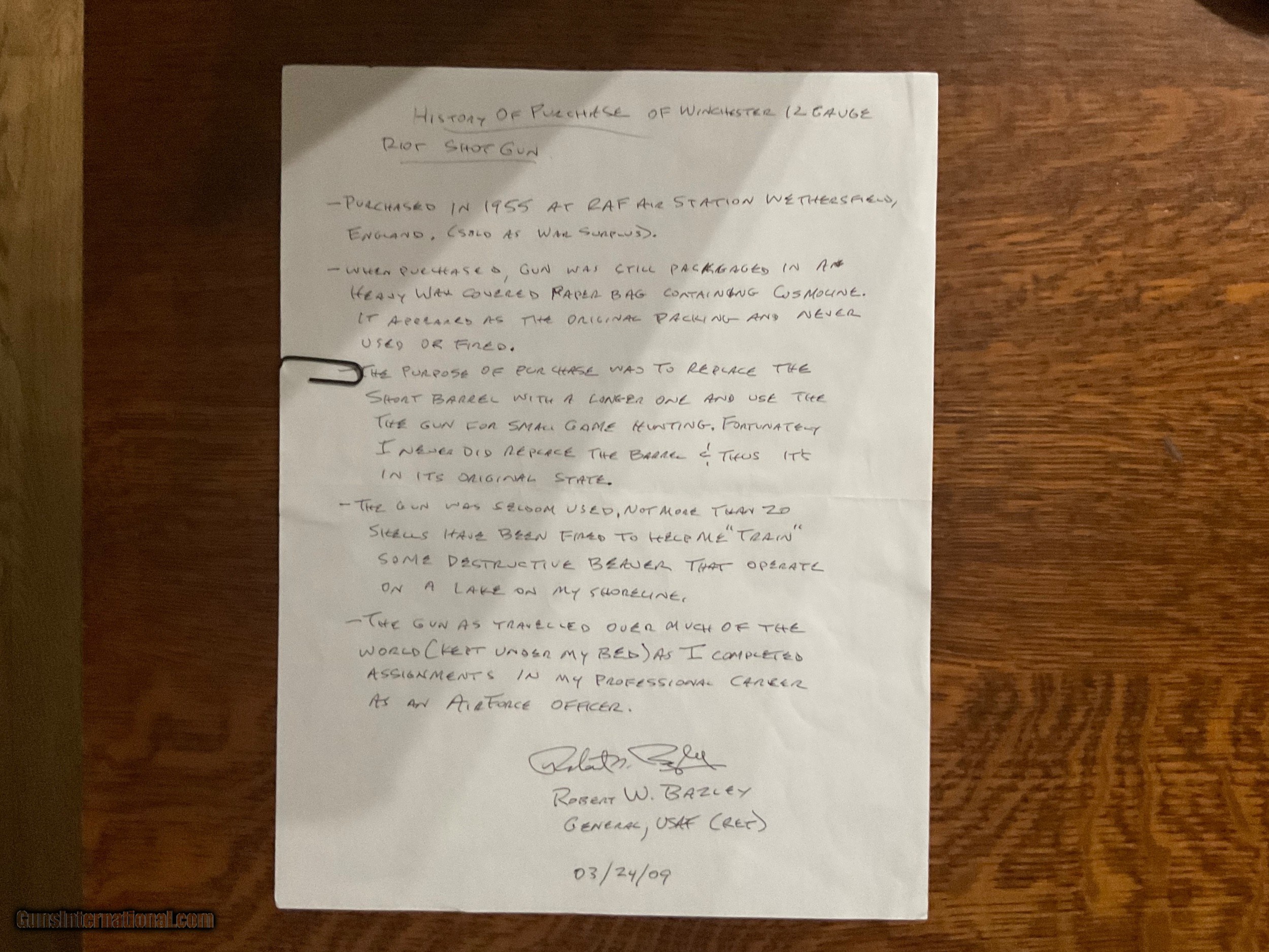 Description: Offered for sale is a benchmarck example of the WW2 Winchester M1897 Trench shotgun. 100% original Trench gun that was privately purchased by a career Air Corps General at a RAF base in England. Included is a signed letter from the General detailing the ownership and purchase of the weapon. Also included is a signed Weapons Registration card serial numbered to the shotgun. The shotgun has matching numbers and nearly all of its beautiful Winchester blueing. The stock is mint and correctly marked with the GHD/Crossed Cannons cartouche. The sling is marked BOYT 44 and is in super condition as well. These combat shotguns have been appreciating very well and almost always sell for big dollars at the large venues. Truly an impossible to upgrade example of the Winchester M1897 WW2 Trench. The collector in the picture was a friend of mine who recently passed away. He purchased this shotgun directly from the General in 2009. SOLD Manufacturer: Winchester Model: 1897 |