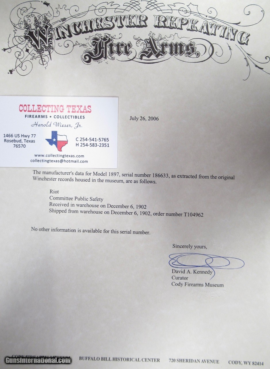 Description: Winchester Model 1897 – 12 Gauge – 20” Riot Gun; Serial No. 186633; Shipped Dec. 6, 1902 with Left Side of Receiver Marked Per Factory Letter “COMMITTEE PUBLIC SAFETY”; These Guns were used in Galveston, Texas after Hurricane of 1900 by Citizens of Galveston; Good Honest Example with replaced fore end; Good Action; fair bore; LIQUIDATING PERSONAL COLLECTION; Price: $2,500 + $60 S&H; Price includes insured shipping; return policy: three days inspection from the date the items received; full refund of shipping both ways ONLY IF THE ITEM IS MISREPRESENTED SOLD Manufacturer: Winchester Model: 1897 Serial Number: 186633 |