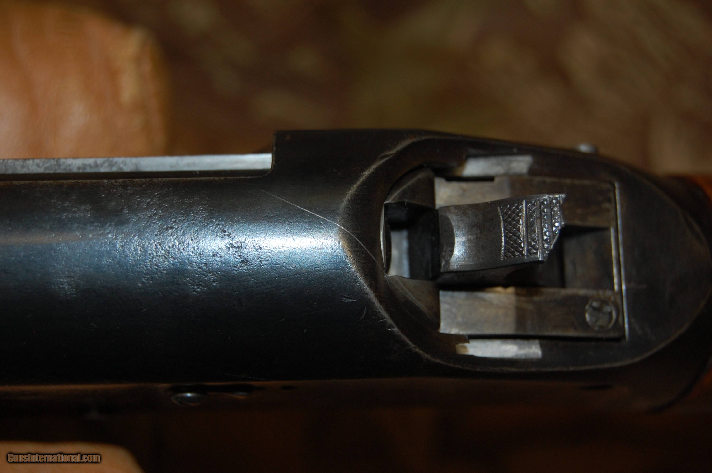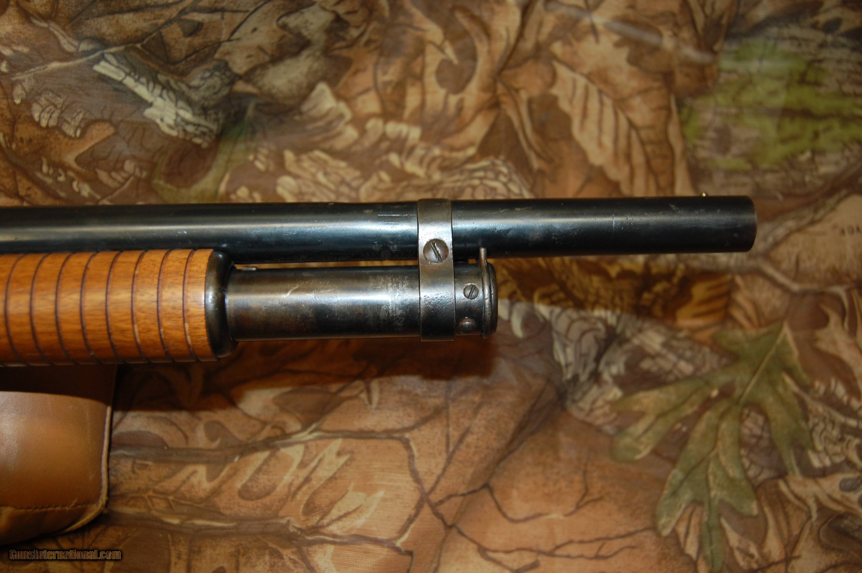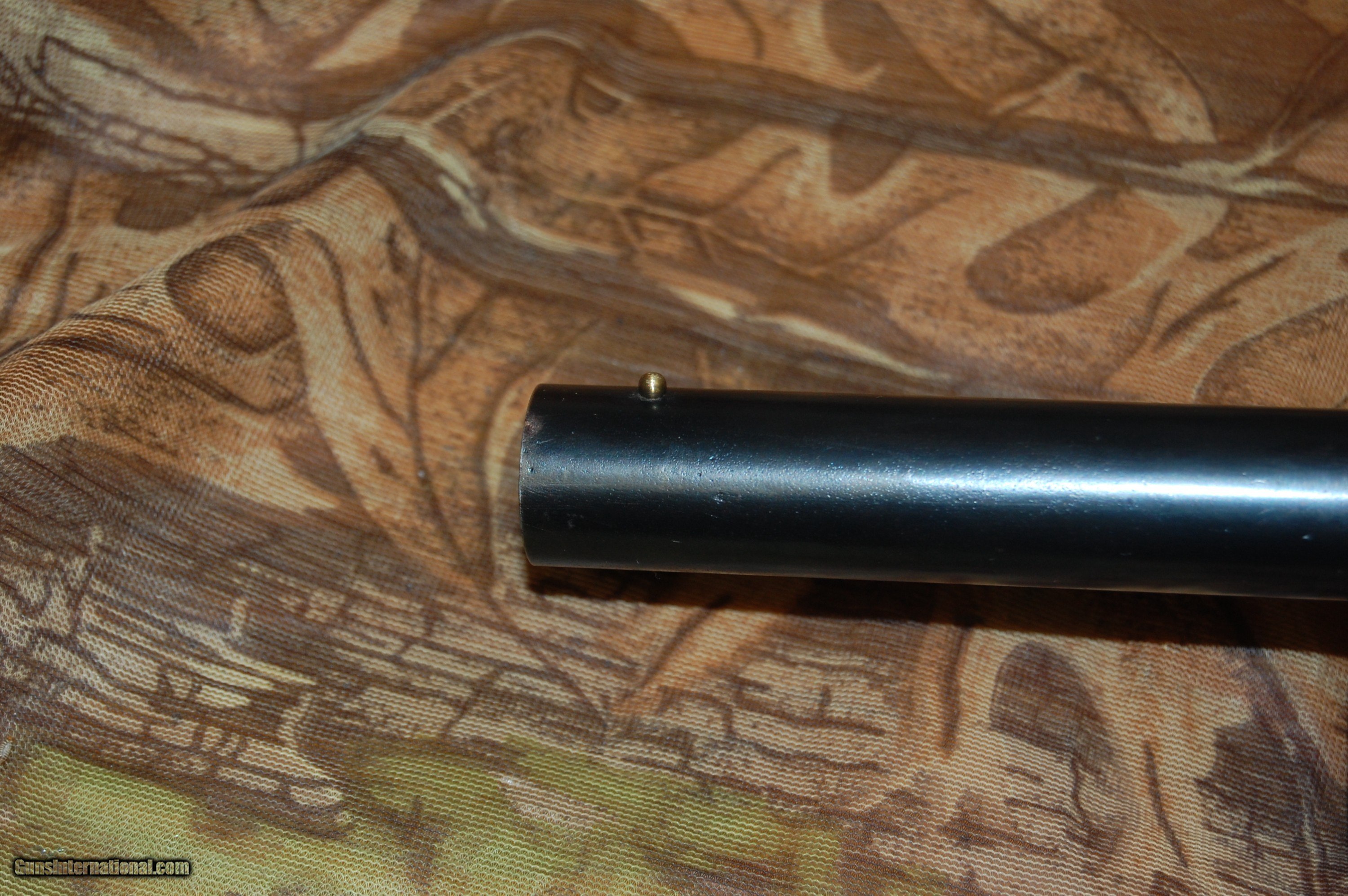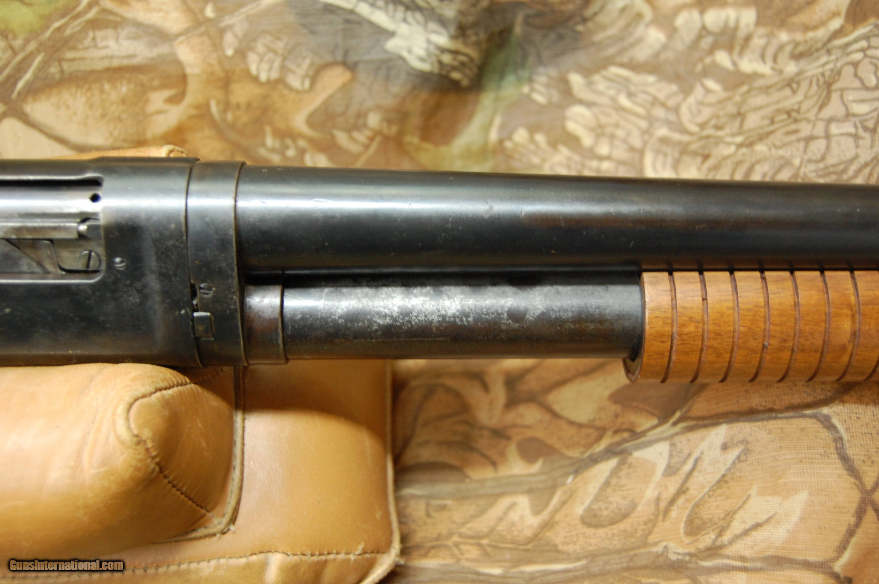 Description: Winchester Model 97 Shotgun 12 gauge. Takedown model, visible hammer, and a plain pistol grip stock. The stock and forearm have been replaced with new wood some time ago. The hammer has a chip broken off the rear. The barrel has been cut off to 20” long and that gives it a cylinder bore. There is an indentation in the bottom of the barrel to the rear of the barrel band. Also, there is a lot of pitting in the barrel. The shotgun does shoot and function. See photos for metal condition. Serial number 737054 was made in 1923. $495.00 plus shipping. SOLD Manufacturer: Winchester Model: 97 Serial Number: 737054 Barrel Length: 20 Bore: 12 Gauge Condition: Fair to good Action: Pump |