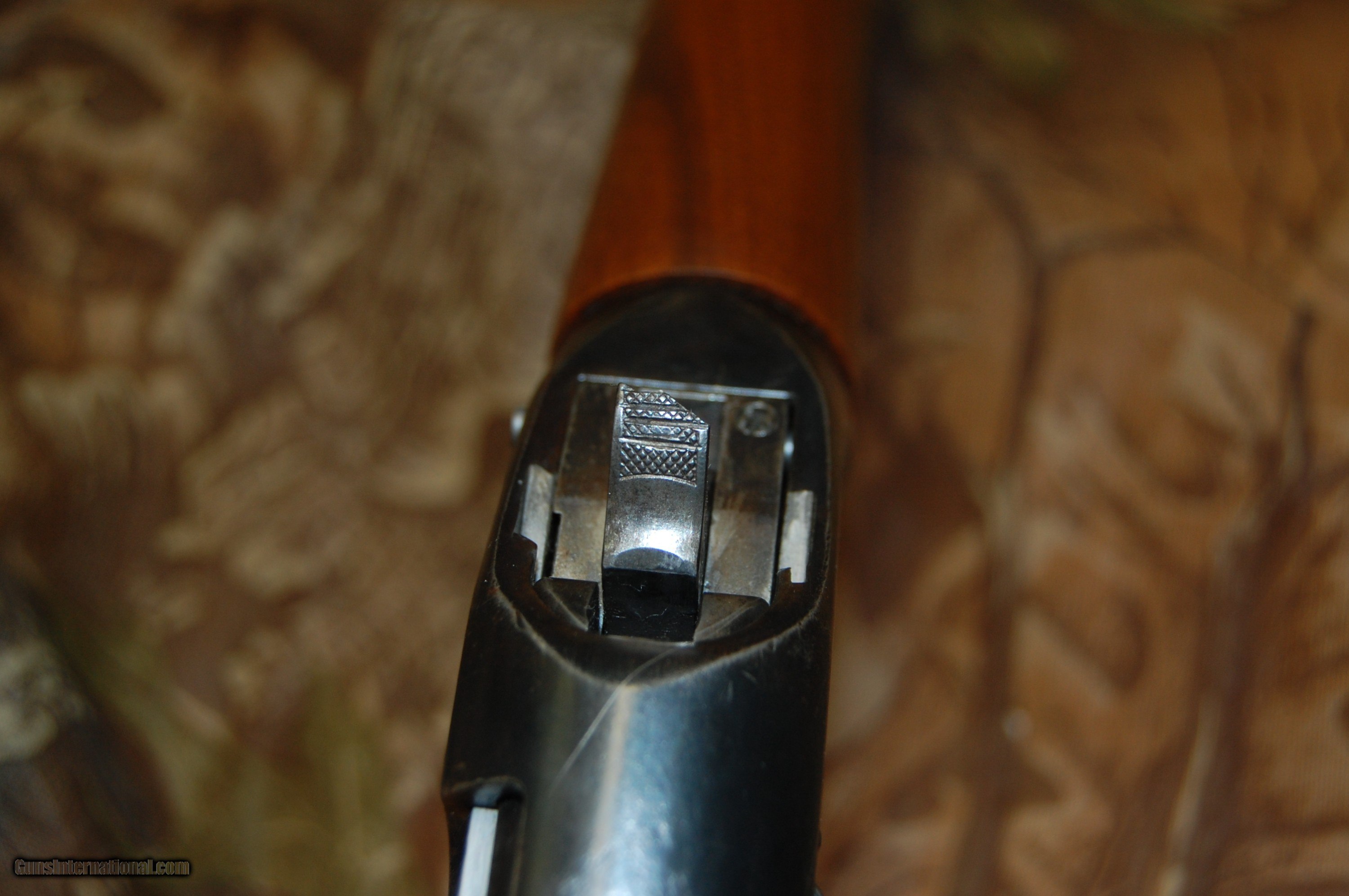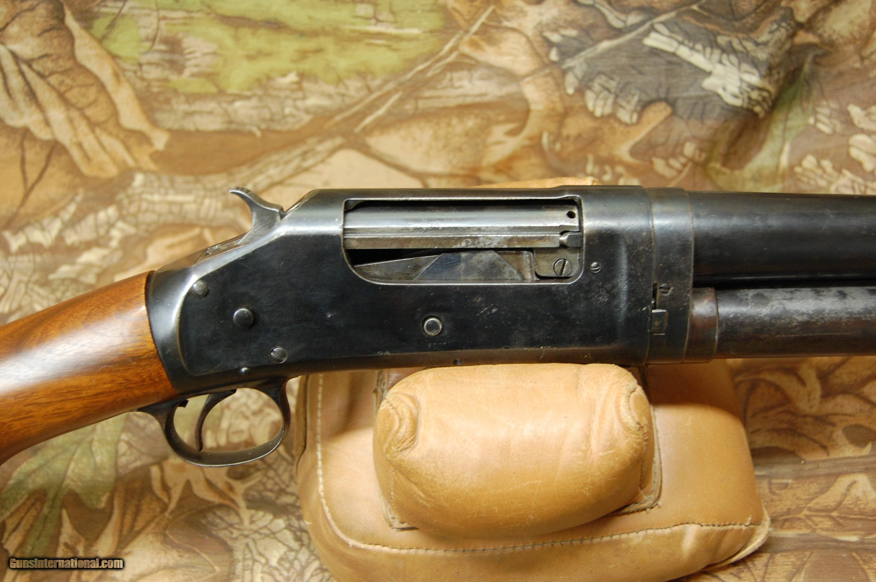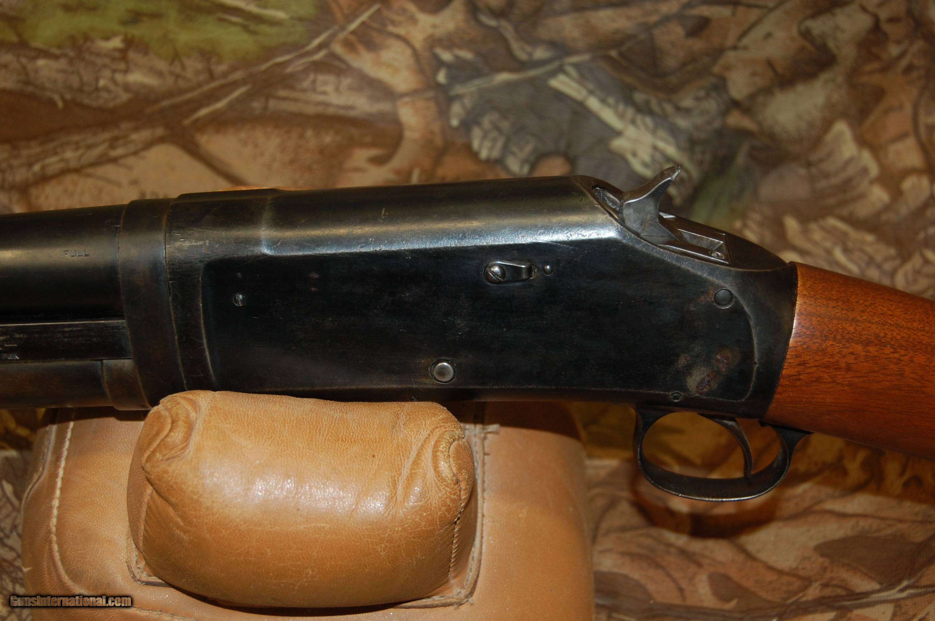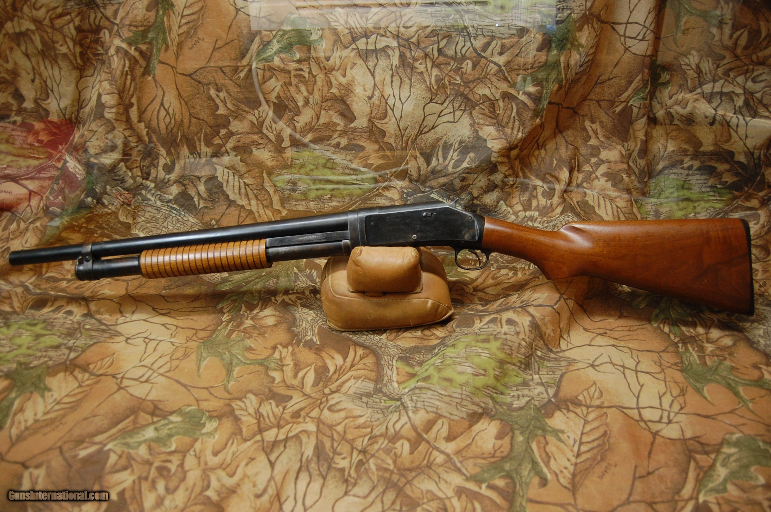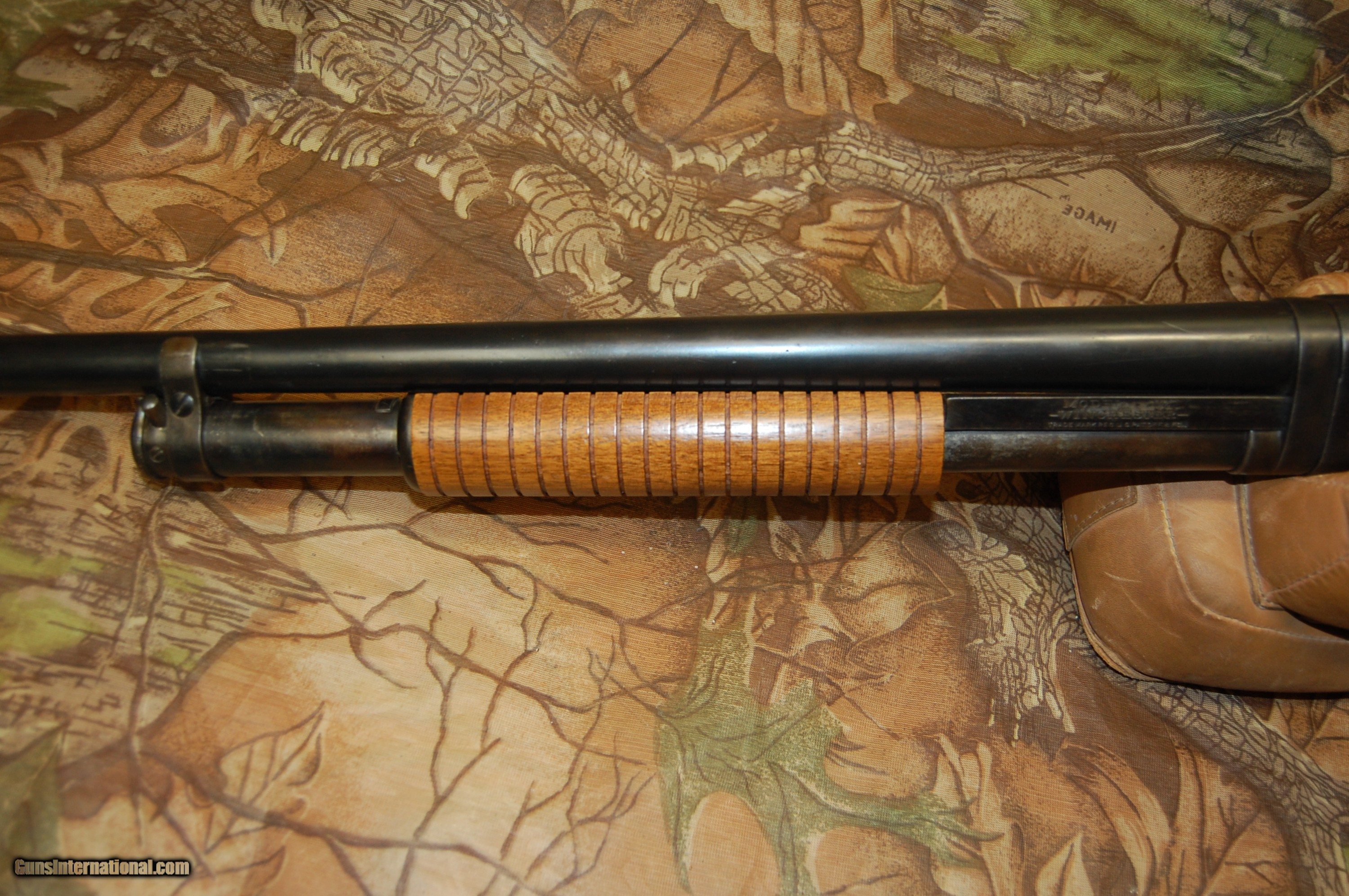 Description: Winchester Model 97 Shotgun 12 gauge. Takedown model, visible hammer, and a plain pistol grip stock. The stock and forearm have been replaced with new wood some time ago. The hammer has a chip broken off the rear. The barrel has been cut off to 20” long and that gives it a cylinder bore. There is an indentation in the bottom of the barrel to the rear of the barrel band. Also, there is a lot of pitting in the barrel. The shotgun does shoot and function. See photos for metal condition. Serial number 737054 was made in 1923. $495.00 plus shipping. SOLD Manufacturer: Winchester Model: 97 Serial Number: 737054 Barrel Length: 20 Bore: 12 Gauge Condition: Fair to good Action: Pump |