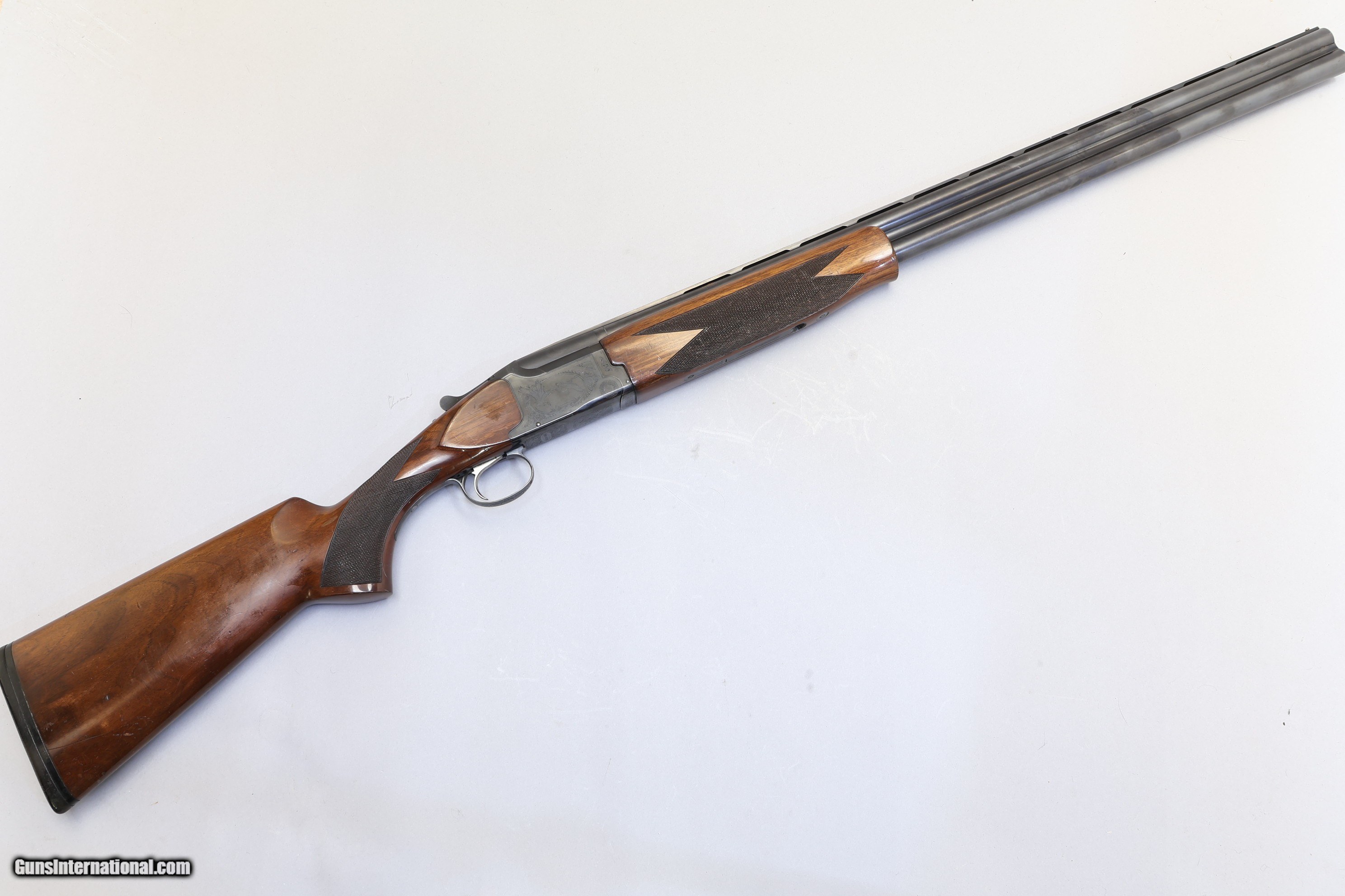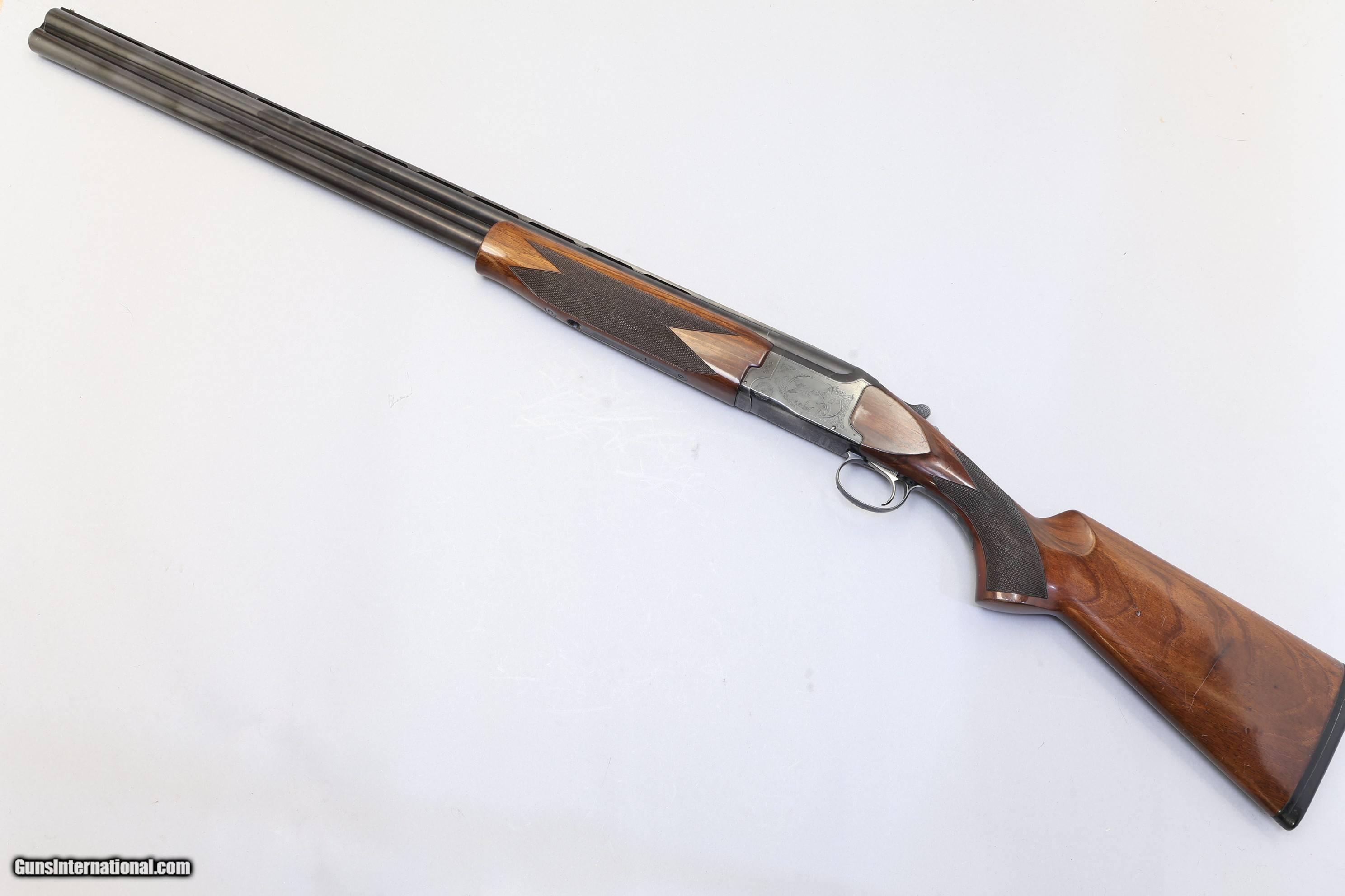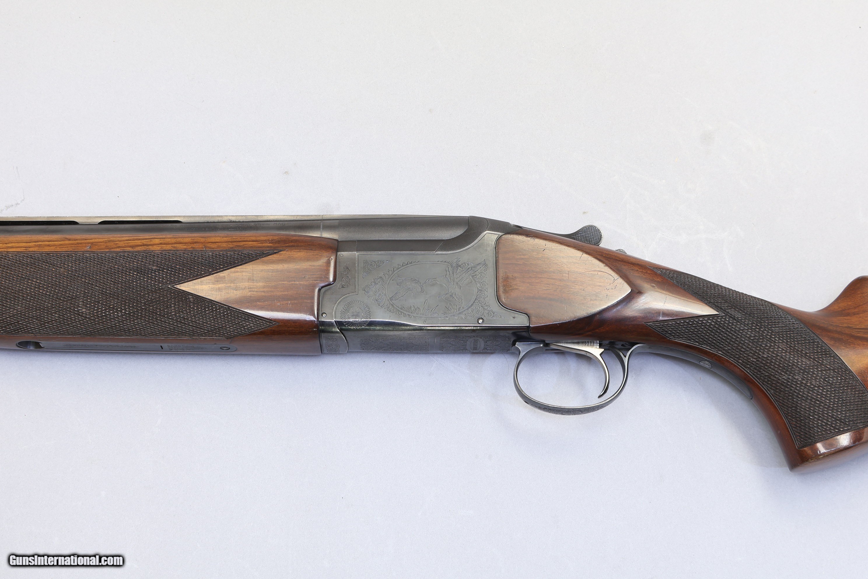 Description: 3" Chambers | Multi choke B: IM & T: Mod | Ventilated tapered rib 5/16" - 1/4" The Winchester 5000 Waterfowl is a Japanese-made over/under 12 Ga built for dependable performance in the field. It has a solid and practical design with a smooth single trigger and automatic safety for easy use. The wood stock and blued metalwork give it a classic look and feel that suits long days outdoors. This shotgun is very tidy with wood that remains solid, showing some scratches on the left side and a small chip near the safety latch. The checkering is still sharp, the receiver has attractive game scenes and scroll engraving, and the barrels are in very good condition with only light bluing wear and minor surface marks. The action is tight, the ejectors work well, and it comes with the original Winchester rubber recoil pad.