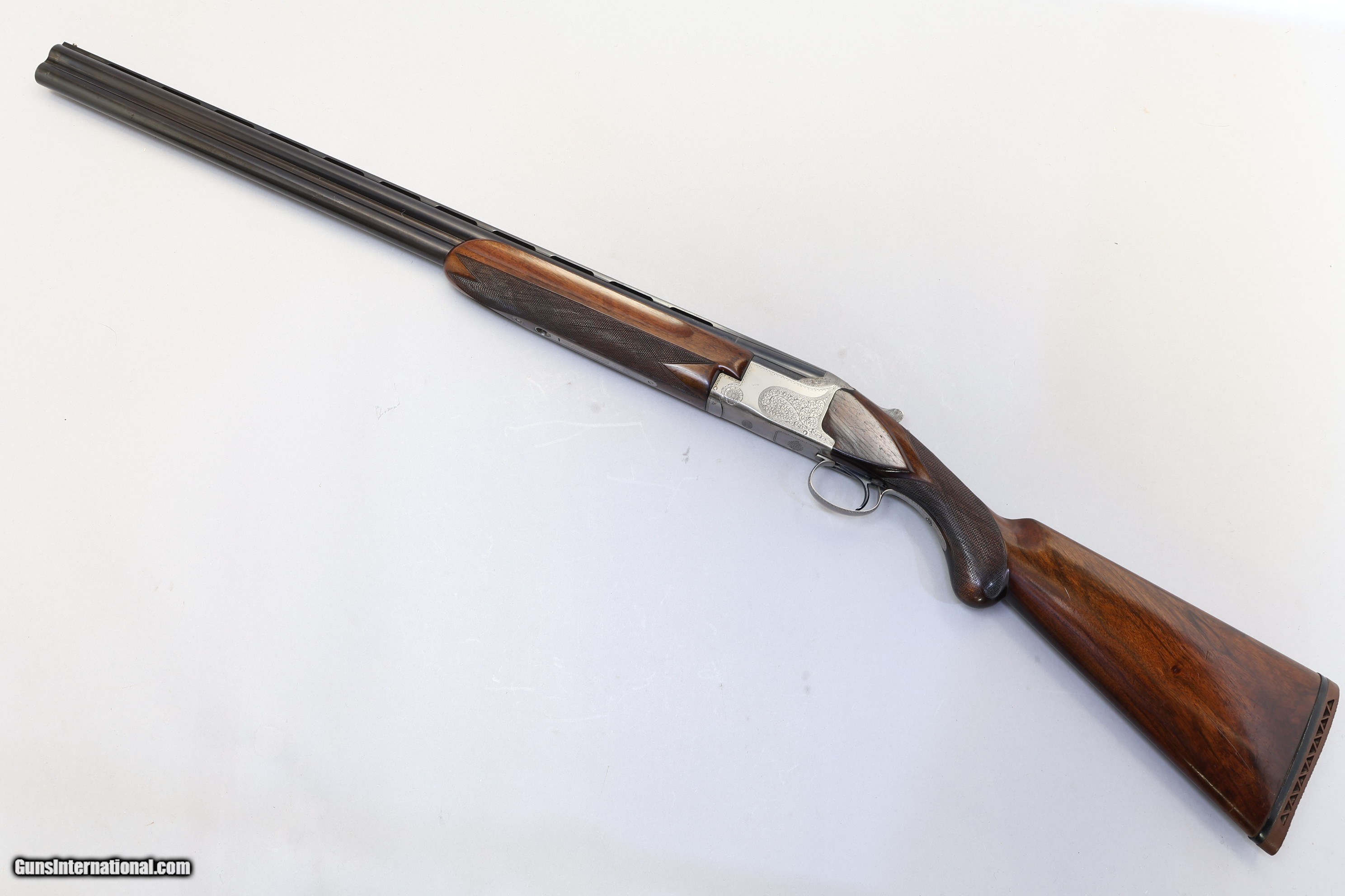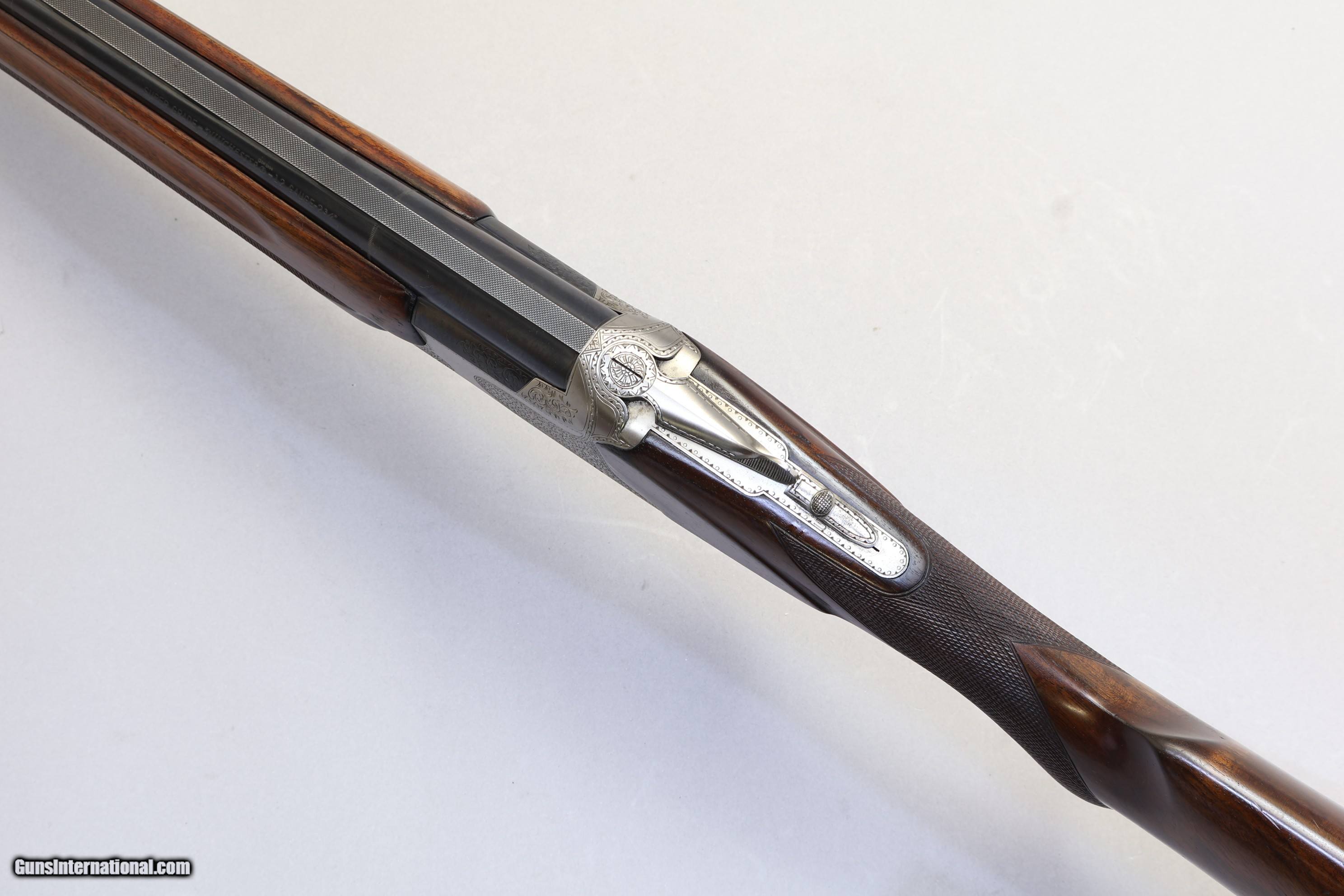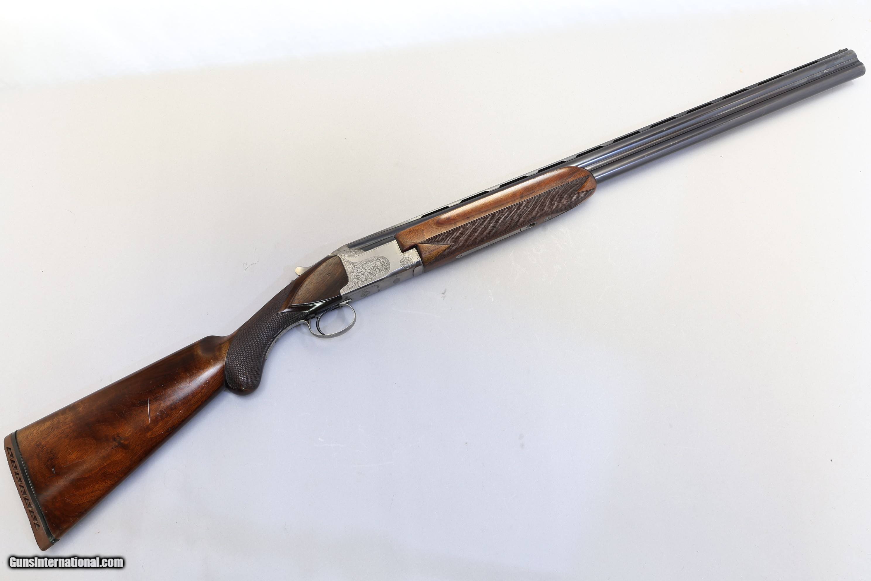 Description: Winchester Super Grade Over/Under Ejector, 12 Ga, 28" Barrels Winchester Super Grade Over/Under in 12 Ga, a classic Japanese-crafted O/U designed for lively handling and dependable field performance. Its ventilated tapered rib promotes fast target acquisition, while the crisp single selective trigger and strong ejectors support confident, rapid follow-up shots. Stunning example with beautiful dark walnut and lovely scroll engraving, complemented by a brass bead sight. Barrel bluing is fully intact with only light surface marks, the break?action is clean, and the ejectors are firing well. Dating to 1975 in Japan, it wears 28" barrels over 2 ¾" chambers with a ventilated tapered 8mm–6mm rib and fixed chokes—bottom Modified and upper Full. Overall length is 45 3/10". The Prince of Wales stock shows a slight right?hand cast, with LOP 14 1/2" (13 7/8" to wood), DAC 1 7/8", and DAH 2 3/4". A rubber recoil pad with sharp chequering offers secure shoulder purchase without detracting from the gun’s refined appearance.