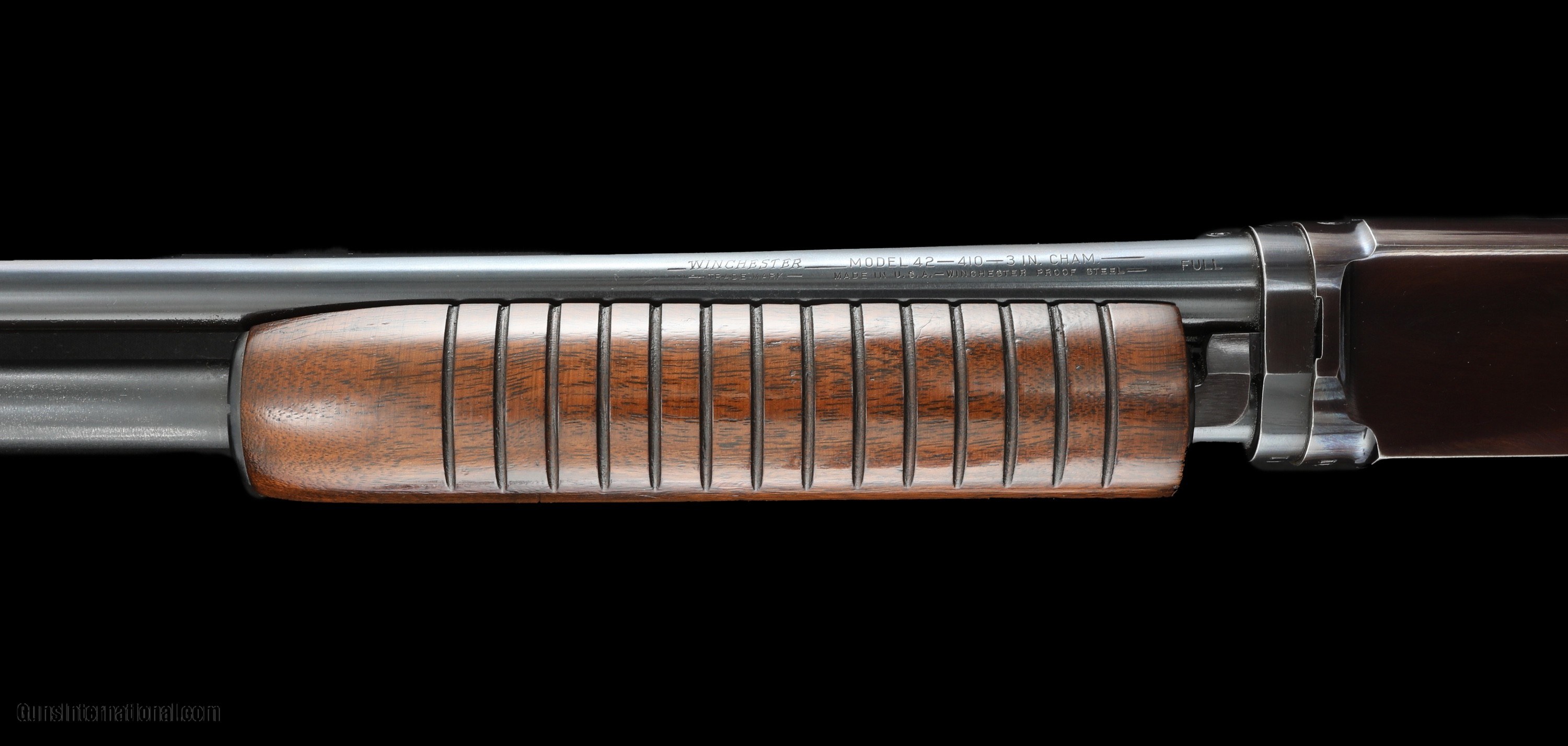 Description: Excellent high original condition Model 42. 26" Plain barrel, full choke, 3" chamber gun. Built in 1963. Gun is excellent and crisp showing limited use. Retains more than 97% original finishes throughout. Bore is brilliant. Mechanics are perfect. Wood is nice and crisp with only very minor marks. This fine 42 is priced at $1795 plus shipping to your FFL. Please dont hesitate to contact me with any questions or reasonable offers at (704) 280- 2382 or via PM on this site. SOLD Curio/Relic: Yes Shotgun Gauge: .410 Gauge Manufacturer: Winchester Model: Model 42 Serial Number: 154811 Barrel Length: 26 Chambers: 3 Condition: Excellent to near mint Metal Condition: Excellent to near mint Wood Condition: Excellent to near mint Bore Condition: Brilliant and shiny Stock Comb: 1-1/2 Stock Heel: 2-3/8 Butt Pad: Original Winchester HRBP LOP: 14 Weight: 5lbs. 13oz. Chokes: Full |
