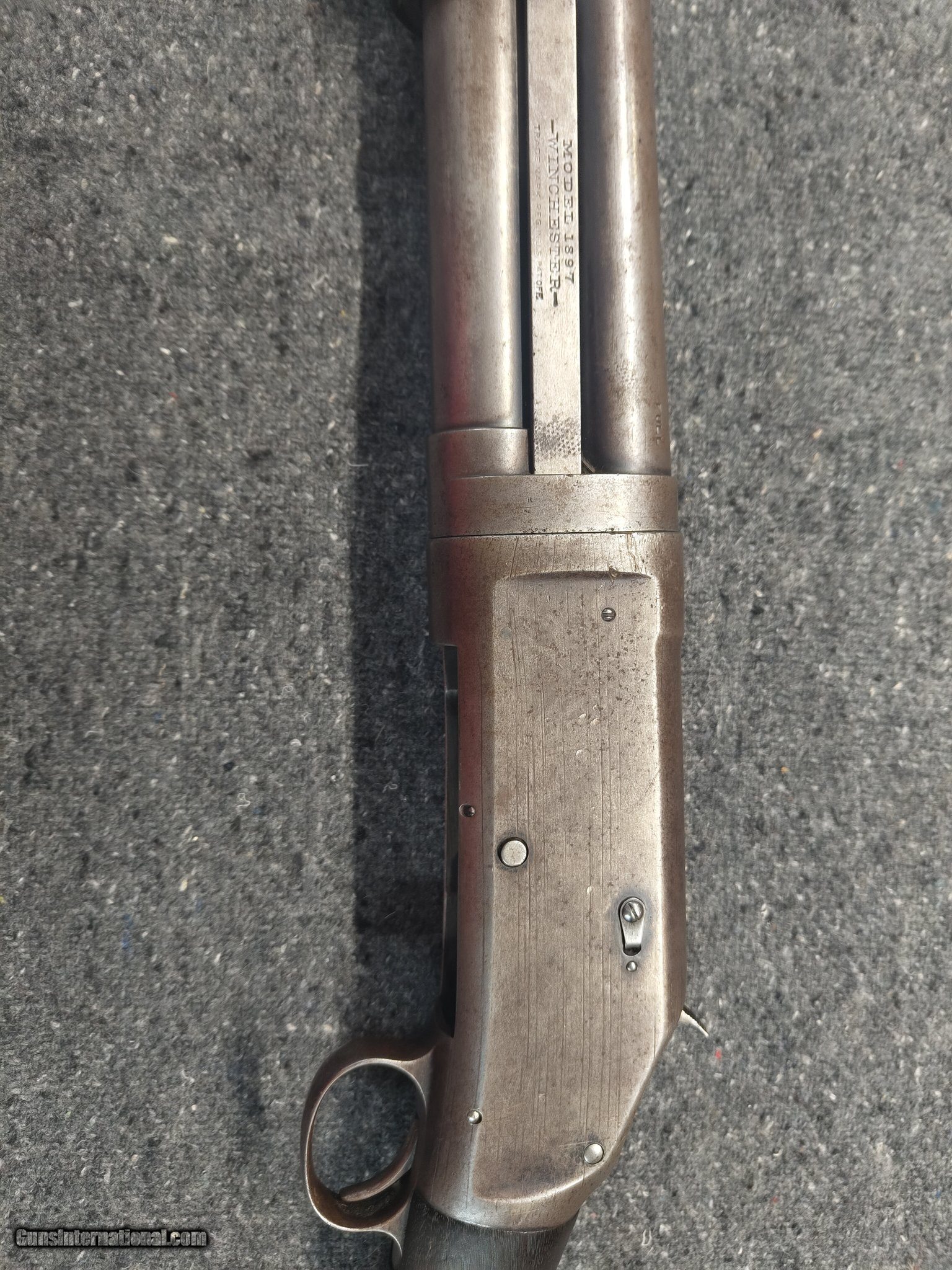 Description: Guns Listing ID: 1277658 The Winchester 1897, designed by John Browning, is a pump action, tube fed 12- or 16-gauge shotgun, variants of which have been used by the US military in varying capacities since World War II. This example is a 12 gauge variant, used in fair condition. There is some remaining original finish. The stock and wood on the pump have minor cosmetic damage and the bore is clean. SOLD Manufacturer: WINCHESTER Model: MODEL 1897 Condition: Used - Non-Certified Barrels: 30 BARREL Gauge Info: 12 GA |