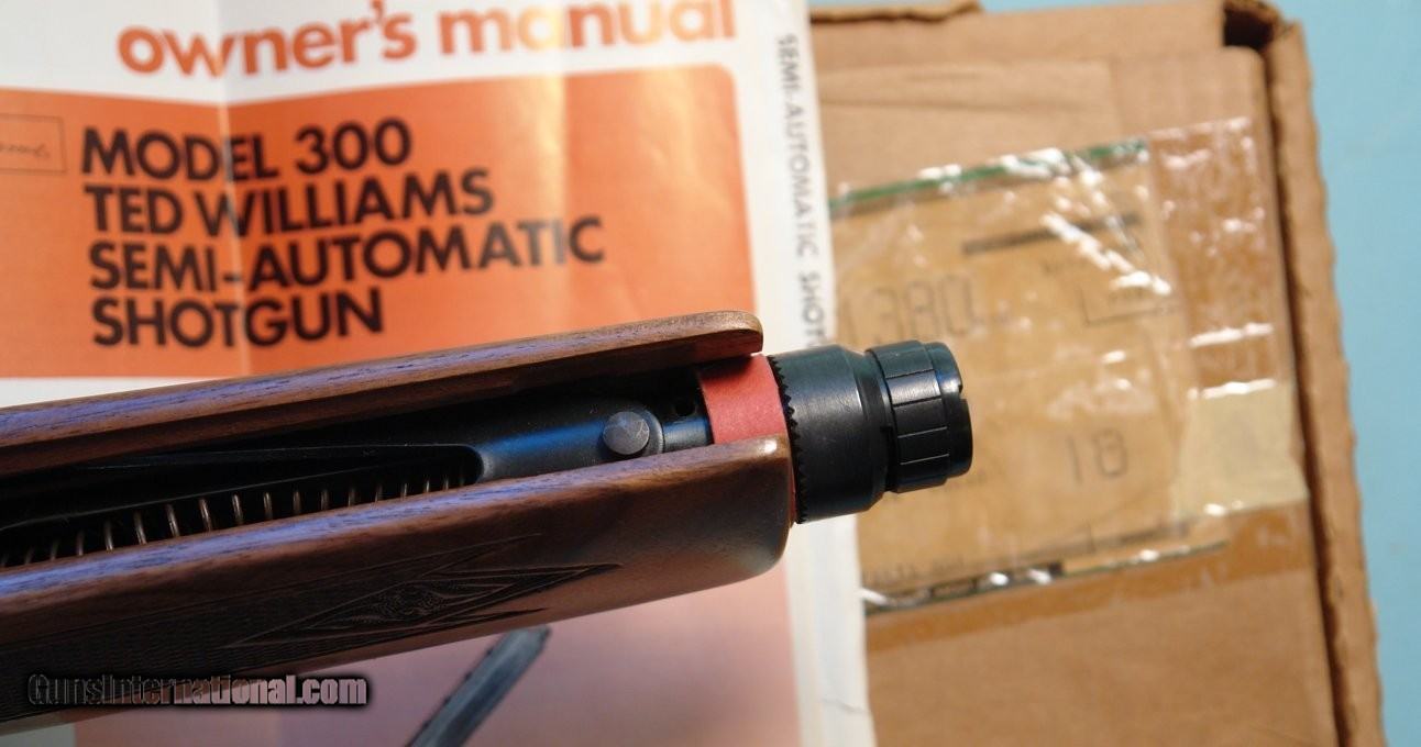 Description: UNFIRED ORIGINAL WINCHESTER FOR SEARS TED WILLIAMS MODEL 300 SEMI-AUTO 2 ¾” 20 GA. 27” VARIABLE CHOKE SHOTGUN CIRCA 1975 IN ORIGINAL BOX W/INSTRUCTIONS MANUAL. As new. Looks unfired and unused. New condition. Even has the cardboard shipping washer for forend cap thread protection. Have to take off in order to assemble. Matching box with original shipping labels still on it and original packing materials inside. SOLD Shotgun Gauge: 12 Gauge |