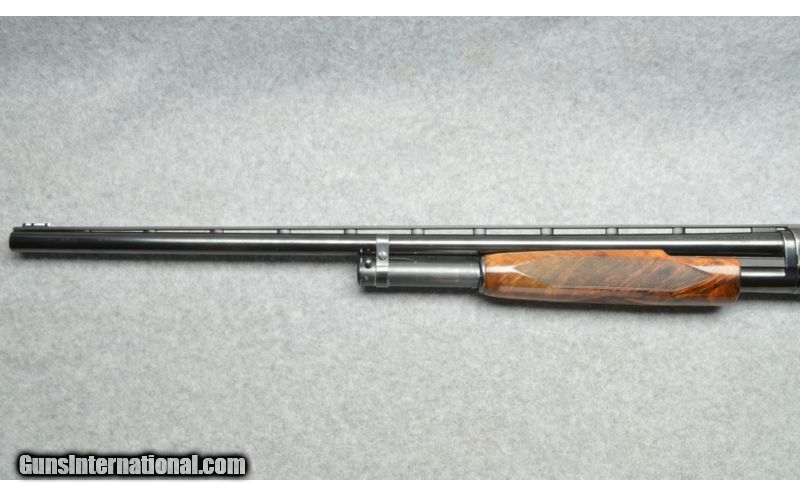 Description: SOLD Curio/Relic: Yes Manufacturer: 1949 manufacture date. Caliber Info: 12 Ga. Chambers: Pump action, four round tubular magazine. Metal Condition: Good to very good. Small surface scratches on the left side of the receiver. Wood Condition: Very good, three small dents observed. Bore Condition: Very good, clean and shiny. Barrels: 30 inch round blue barrel. Triggers: Single stage trigger. Stock: Checkered pistol grip, high gloss stock with very nice burl pattern. Stock Dimensions: 14 1/4 inch length of pull. Fore End: Checkered high gloss fore-end matches the stock. Butt Pad: Black rubber recoil pad. Weight: 8 1/2 pounds. Sights: White bead at the muzzle, small white bead mid vent rib. Chokes: Fixed choke, Full. Item Location: Berlin, MA |