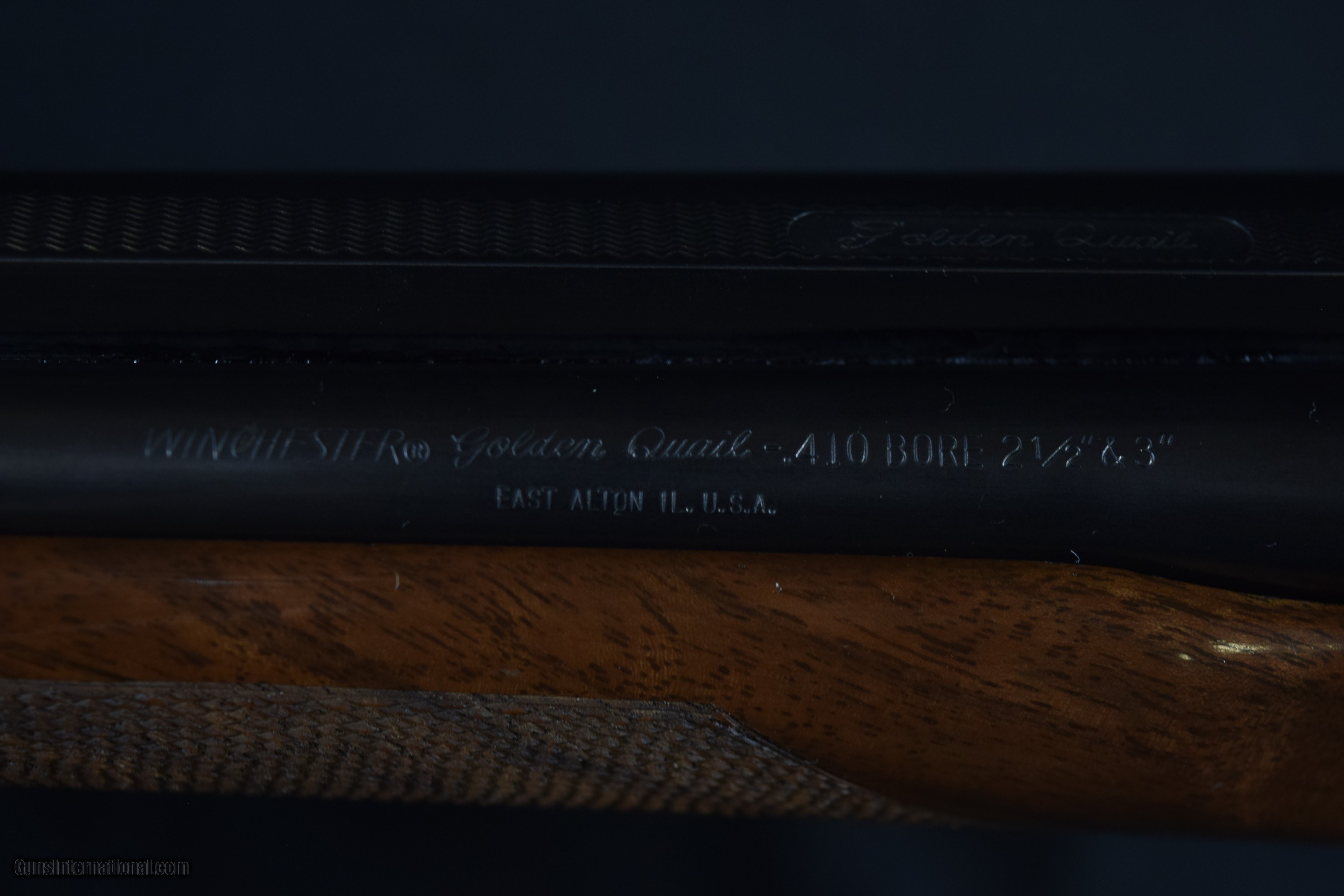 Description: The Winchester Golden Quail 410Ga 25.5" shotgun is a beautifully crafted firearm that combines classic design with modern functionality. This shotgun is specifically designed for quail hunting enthusiasts who appreciate fine craftsmanship and exceptional performance. This item comes with the original case. Overall condition is great with some scratching to the stock Pre-Owned - Winchester Golden Quail 410Ga 25.5"