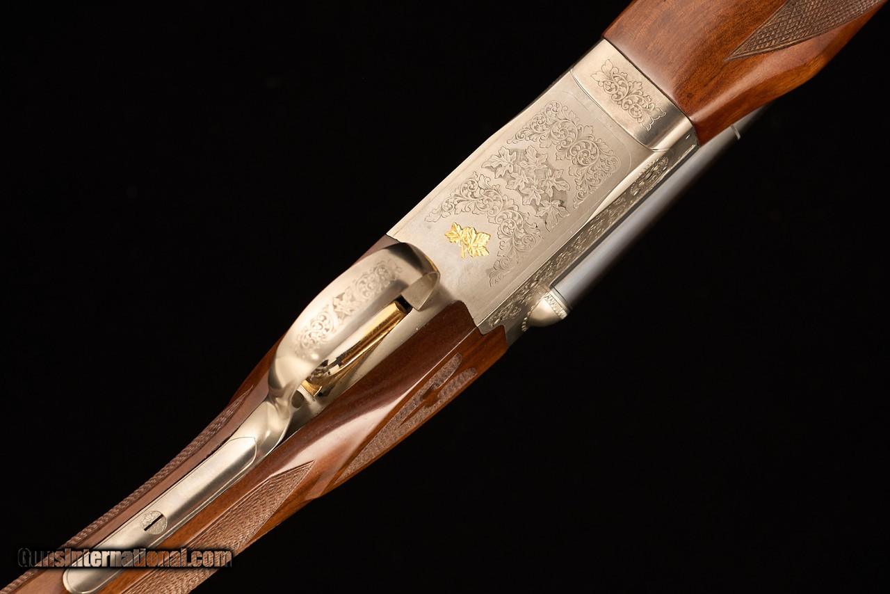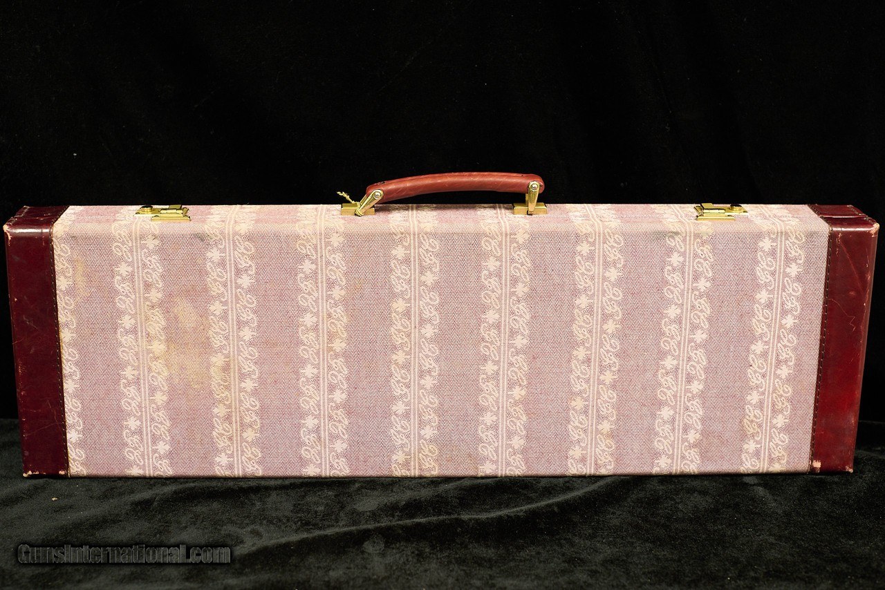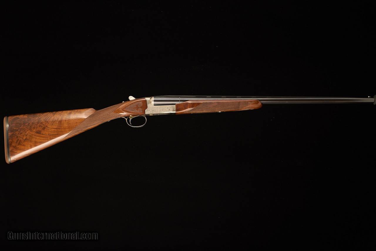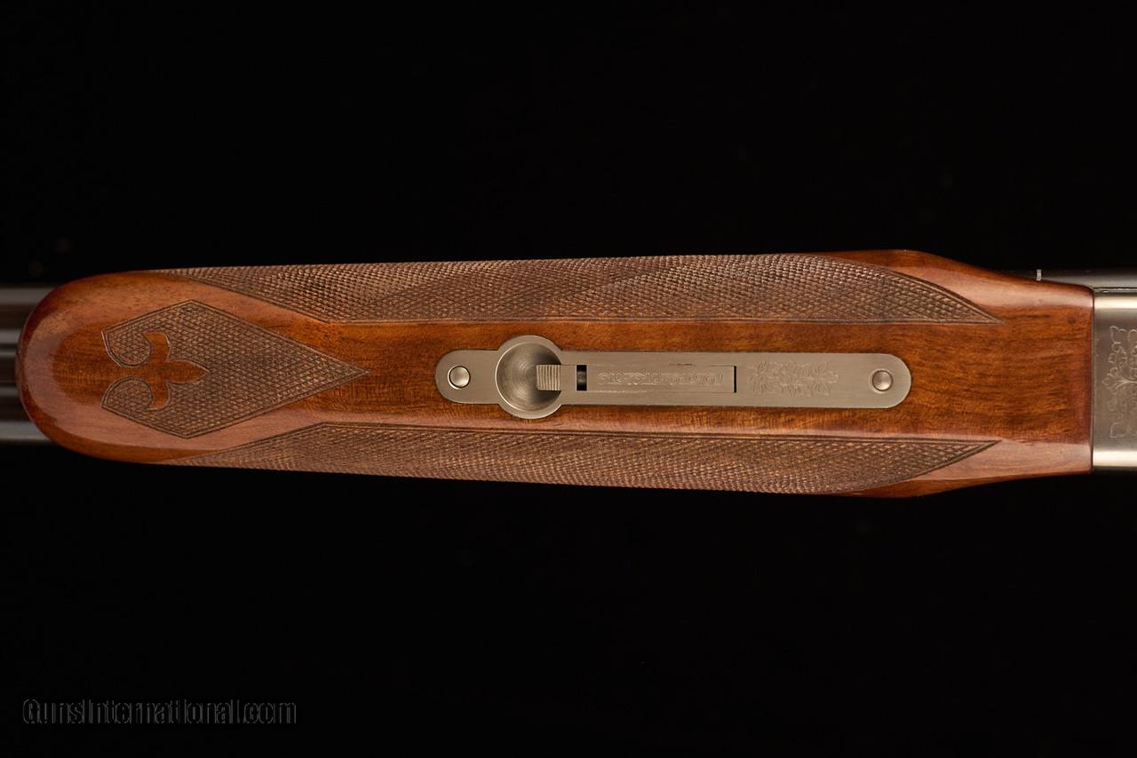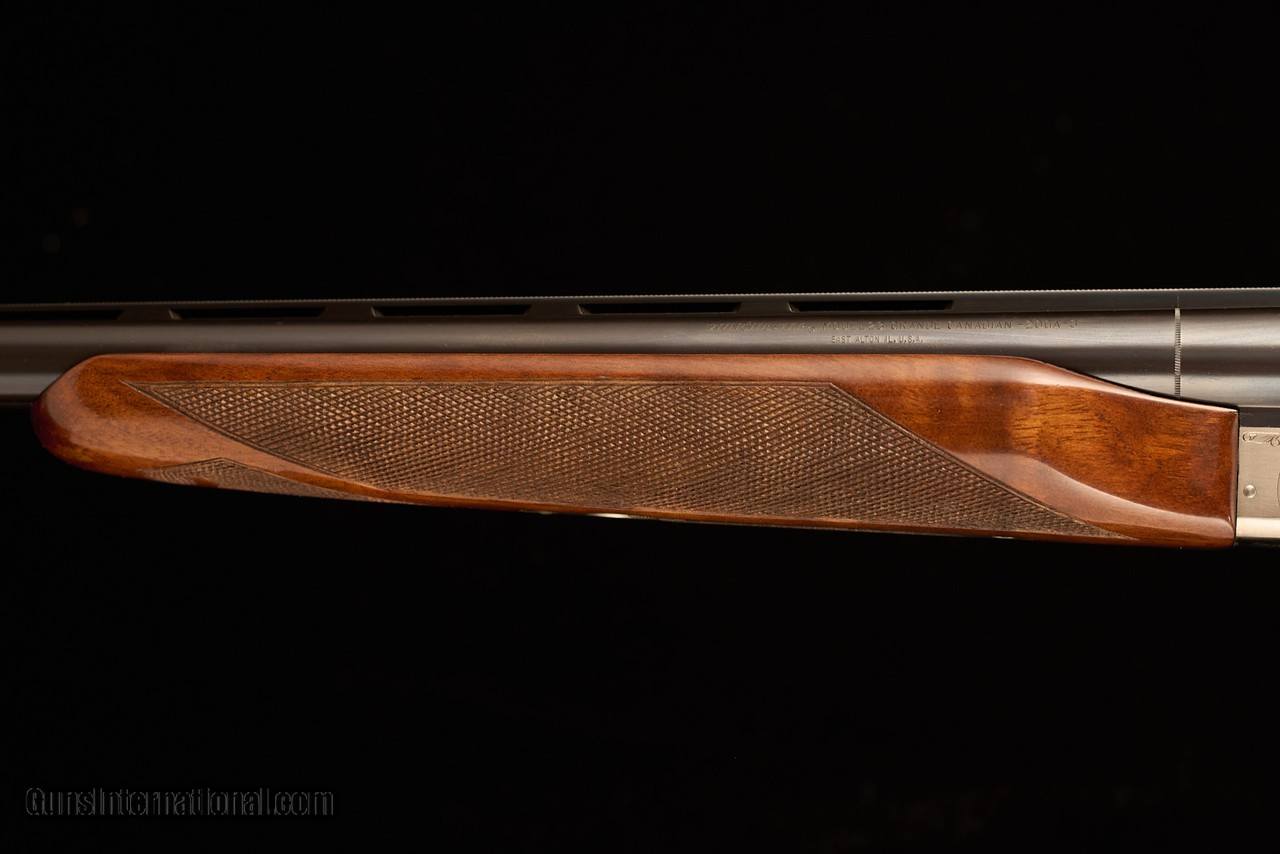 Description: Winchester Model 23 Grande Canadian side by side 20 bore ejector gun with 25 ½” barrels. The gun is choked improved cylinder and modified. Length of pull of 14 3/8” to a brown Winchester recoil pad. Straight hand grip, mechanical single selective gold-plated trigger, auto safety, sculpted action, raised matted vent rib with a white front bead, fleur-de-lis checkered beavertail forend and wrist with mullered borders. The gun is housed in maker’s case. Marked “GRANDE CANADIAN” on the top rib and the left barrel. The chambers are proofed and measure 3”. Engraved with medium black leaf scroll and maple leaves. Relief engraved two gold maple leaves on the underside. Coin finished action and furniture. Exhibition grade walnut stock. In excellent overall condition. Both bluing on the barrels and the bores rate excellent. Crisp and clean checkering and the stock shows minor scratches compression marks. Mid-bead missing. Top lever remains right of center, barrels on face, and ejectors in time. Serial #: GC402 Barrel length: 25 ½” Weight: 7 lbs 1 oz LOP: 14 3/8” DAC: 1 7/16” DAH: 2 3/8” Cast: 1/16”, off Bore diameter, right/left: .617”, .617” Choke, right/left: .008”, .014” (IC, M) Minimum wall thickness, right/left: .037”, .038” Manufacturer: None Marked Caliber Info: 20 Gauge Barrels: 25.5 Action: Side by Side Triggers: Single Selective Gauge: 20 Gauge Stock Comb: 1 7/16 Stock Heel: 2 3/8 Stock Cast: 1/16" off LOP: 14 3/8 Rib: Vented Chokes: IC/M Price: $3,600.00 Contact Seller |