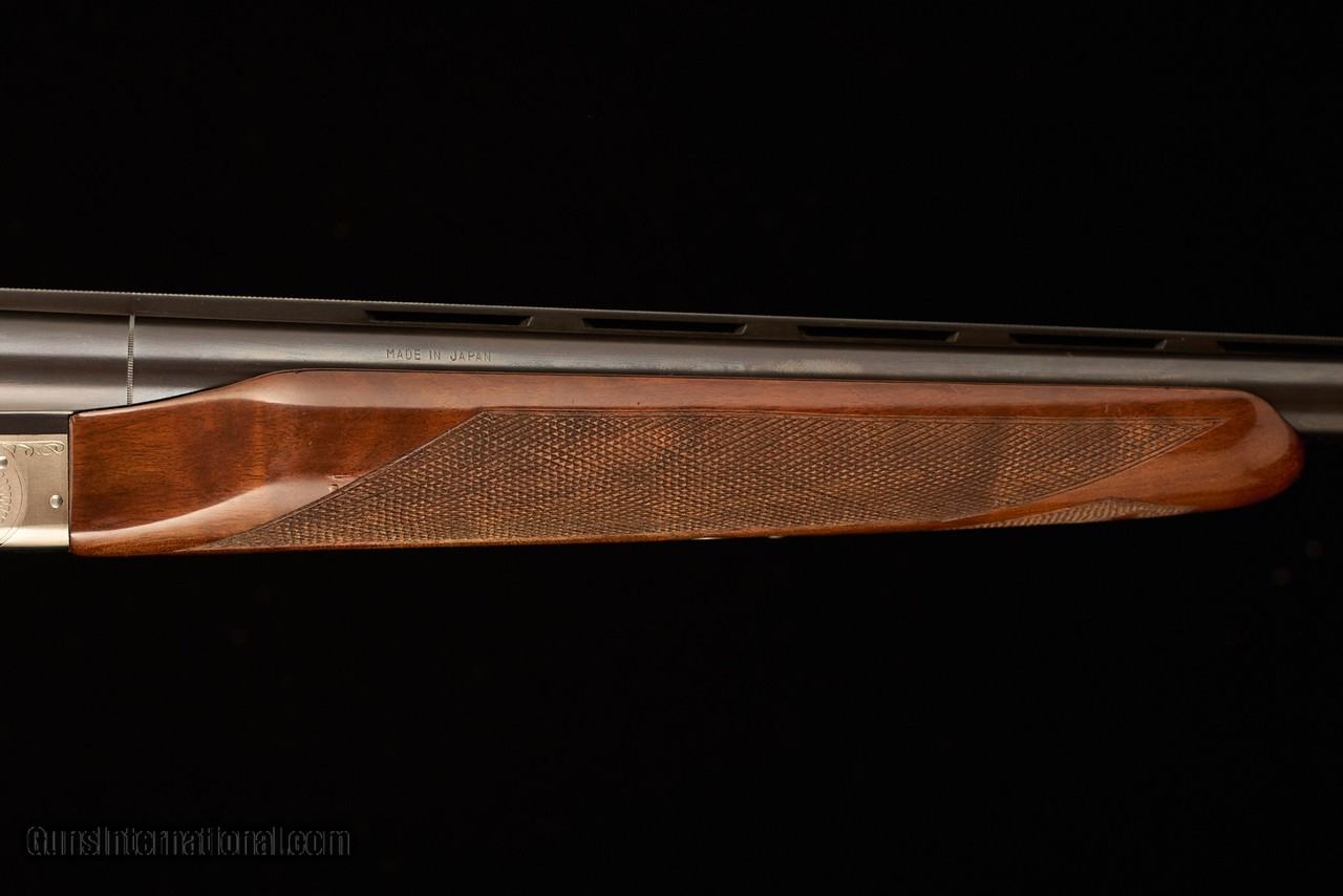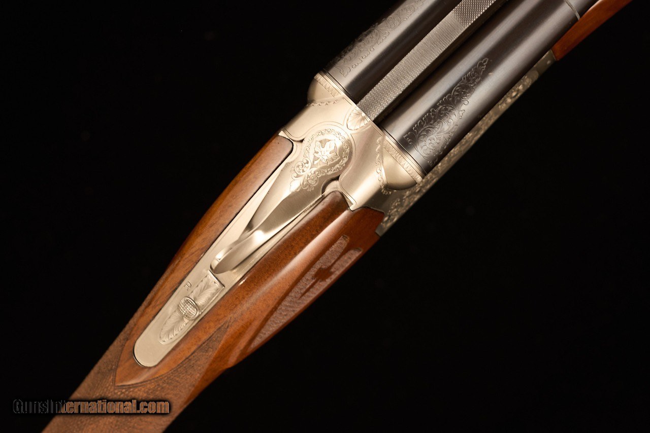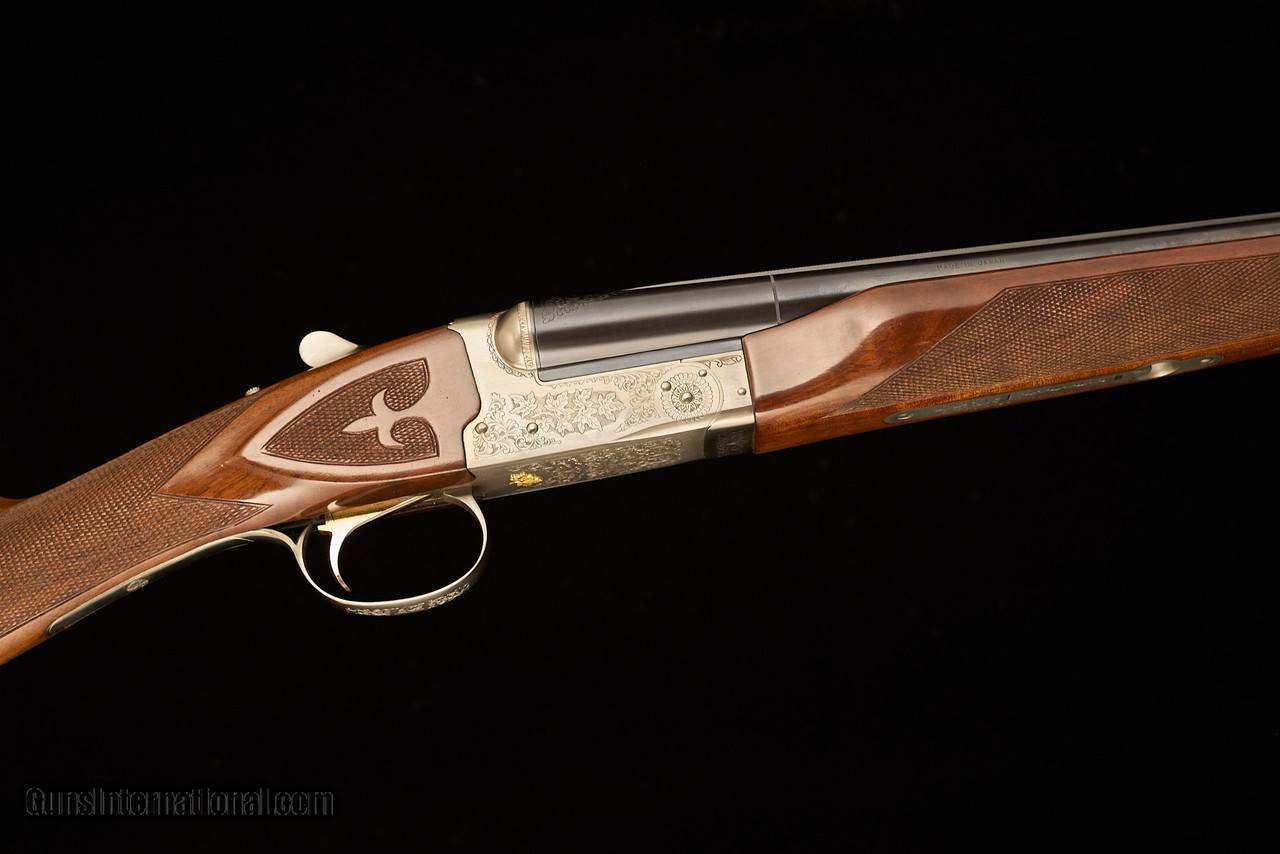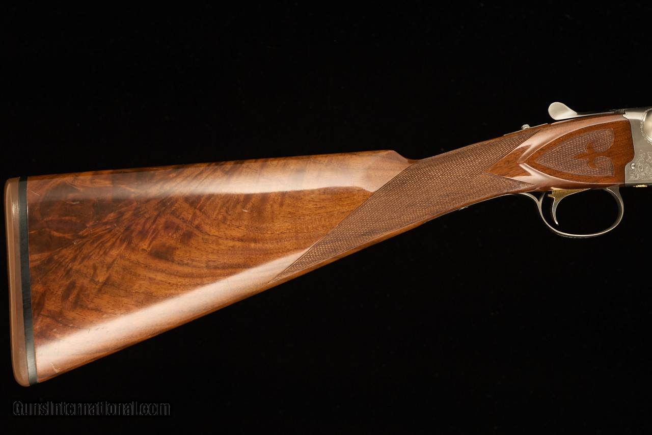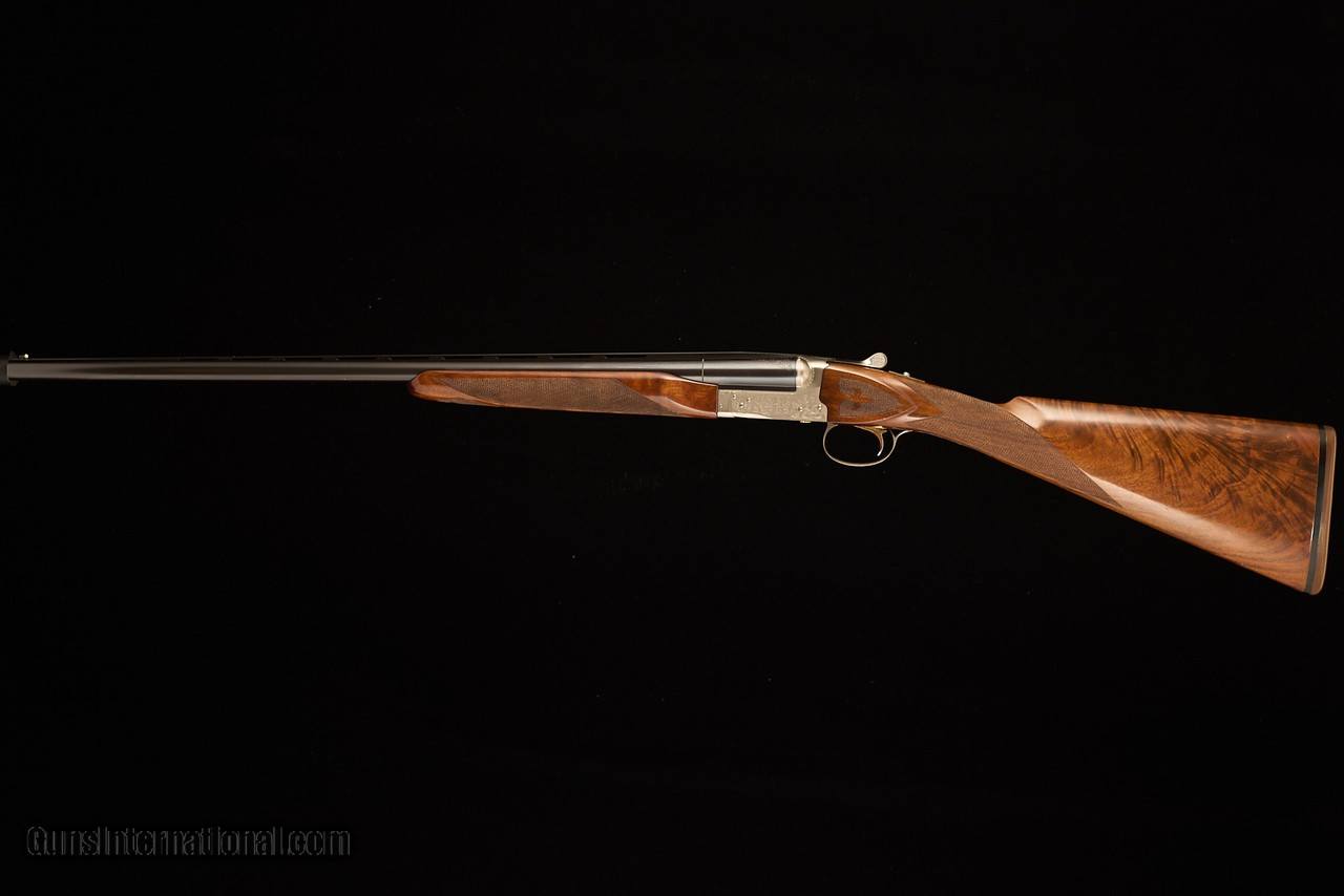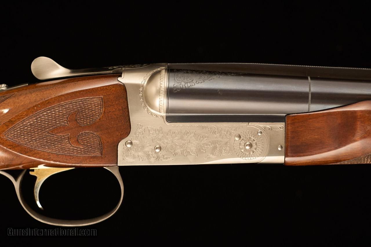 Description: Winchester Model 23 Grande Canadian side by side 20 bore ejector gun with 25 ½” barrels. The gun is choked improved cylinder and modified. Length of pull of 14 3/8” to a brown Winchester recoil pad. Straight hand grip, mechanical single selective gold-plated trigger, auto safety, sculpted action, raised matted vent rib with a white front bead, fleur-de-lis checkered beavertail forend and wrist with mullered borders. The gun is housed in maker’s case. Marked “GRANDE CANADIAN” on the top rib and the left barrel. The chambers are proofed and measure 3”. Engraved with medium black leaf scroll and maple leaves. Relief engraved two gold maple leaves on the underside. Coin finished action and furniture. Exhibition grade walnut stock. In excellent overall condition. Both bluing on the barrels and the bores rate excellent. Crisp and clean checkering and the stock shows minor scratches compression marks. Mid-bead missing. Top lever remains right of center, barrels on face, and ejectors in time. Serial #: GC402 Barrel length: 25 ½” Weight: 7 lbs 1 oz LOP: 14 3/8” DAC: 1 7/16” DAH: 2 3/8” Cast: 1/16”, off Bore diameter, right/left: .617”, .617” Choke, right/left: .008”, .014” (IC, M) Minimum wall thickness, right/left: .037”, .038” Manufacturer: None Marked Caliber Info: 20 Gauge Barrels: 25.5 Action: Side by Side Triggers: Single Selective Gauge: 20 Gauge Stock Comb: 1 7/16 Stock Heel: 2 3/8 Stock Cast: 1/16" off LOP: 14 3/8 Rib: Vented Chokes: IC/M Price: $3,600.00 Contact Seller |