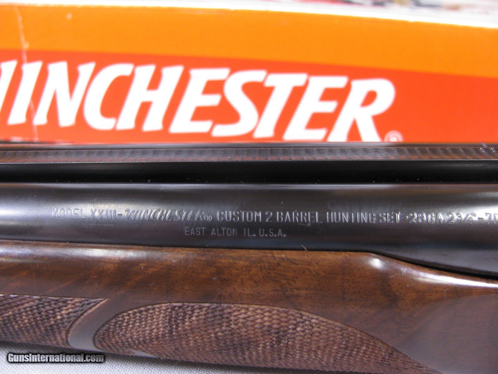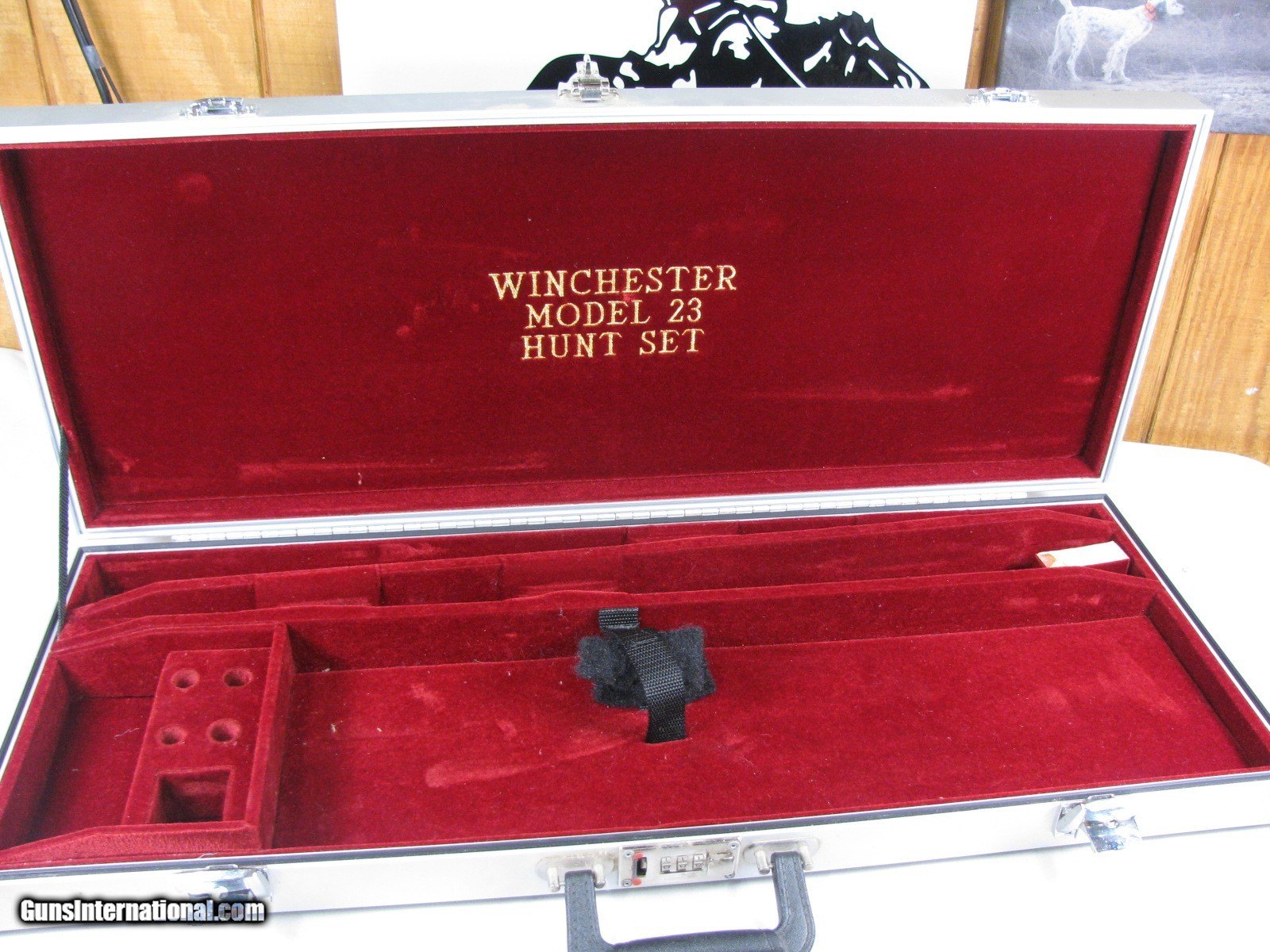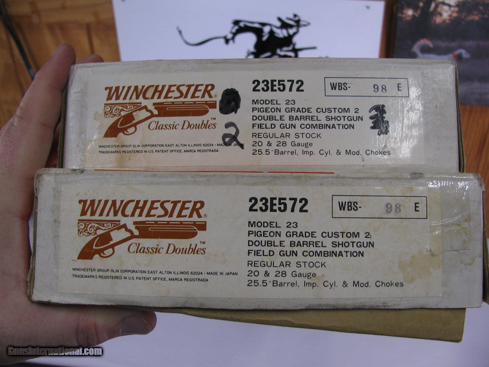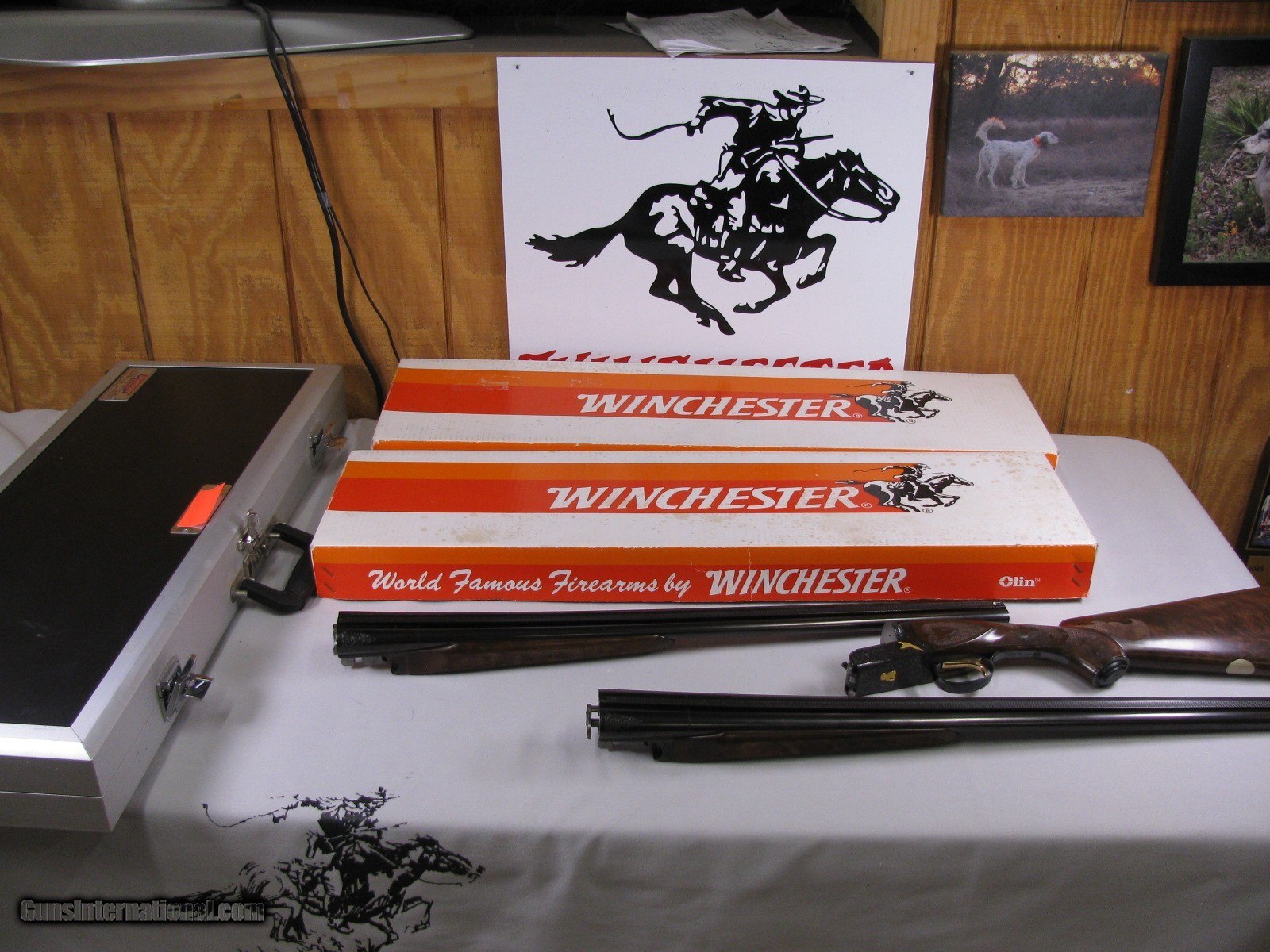 Description: 7823 Winchester 23 Hunt set WBS 28 gauge 26 bls ic/mod, 20 gauge 26 bls ic/mod, gold raised relief PHEASANT/QUAIL, Mr Olins black lab KING BUCK raised relief gold with duck in mouth, 1959 Fed Duck Stamp, fleur-des-lies checkering, AAA+++FANCY HIGHLY FIGURED WALNUT.99% condition, Custom Americase with Winchester 23 Hunt Set imbordered in case, silver snaps, beaver tail pistol grip with cap, solid rib, ejectors, single select trigger, AS NEW. Correct sterilized boxes, Very hard to find NONE FINER. SOLD Shotgun Gauge: 28 Gauge |