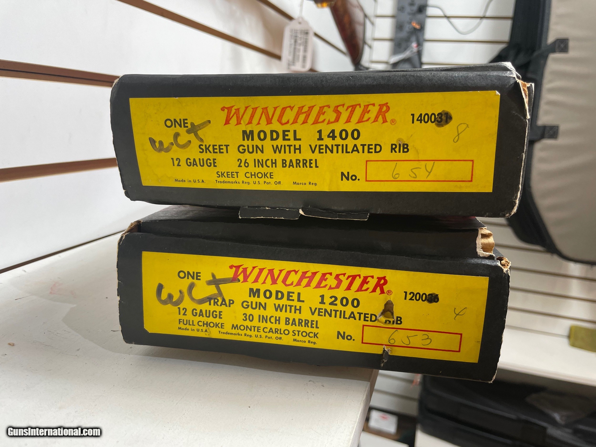 Description: Pair of Winchester Shotgun Limited Edition Clay Tournament Matched Pair WCT Model 1200 Tournament Trap 30" fixed Full choke unfired WCT Model 1400 Tournament Skeet 26" fixed Skeet choke These shotguns were only available as prizes for Gun Champions at Winchester sponsered shoots. These 2 are sequentially numbered WCT 67 653 and WCT 67 654. WCT special edition sets have extra gold embellishments on their fore-end caps, trigger assembly pins etc, as well as exceptional wood upgrades. According to a past "Shotgun World" article, these shotguns were built in the Winchester custom shop and have been hand fitted and accented with the gold caps and other upgrades, They have never been offered for sale to the public, but were tournament prizes or promotions. The numbers all start with WCT nn on one line then the sequence number on the line just below it. The 1400 model is one number over the 1200 model. Even though they are different models the numbers are sequention. These were a very limited number of these sets made and are highly prized and rarely seen for sale by the recipients. Original boxes included in the sale. cannot be split up must be sold as a pair Buyer pays shipping Millers Gun Center Located in New Castle, Delaware "Home of TAX-Free shopping" No Credit Card Fees prizes for Gun Champions at Winchester original boxes unfired SOLD Serial Number: WCT67653 & WCT67654 |