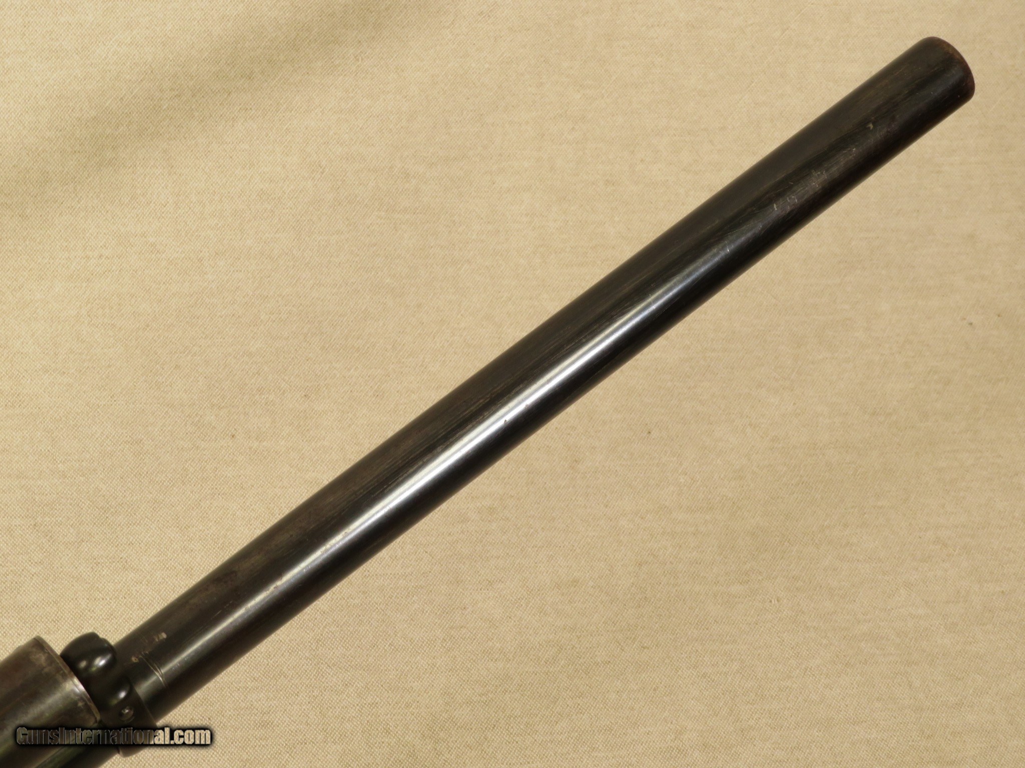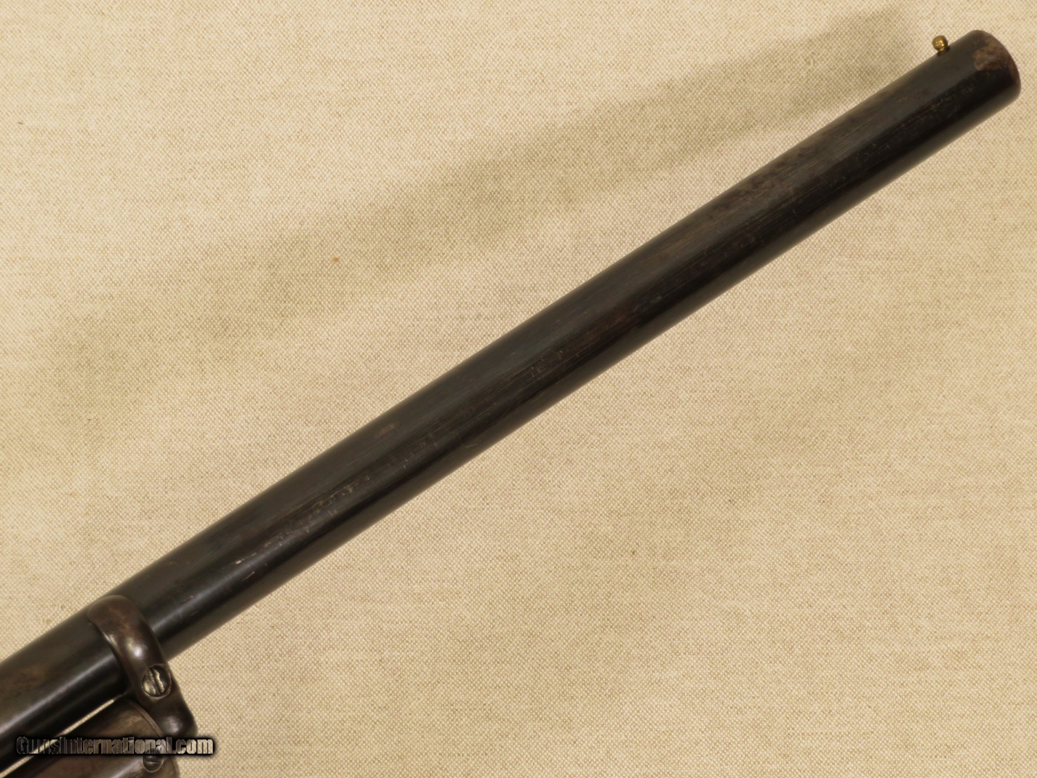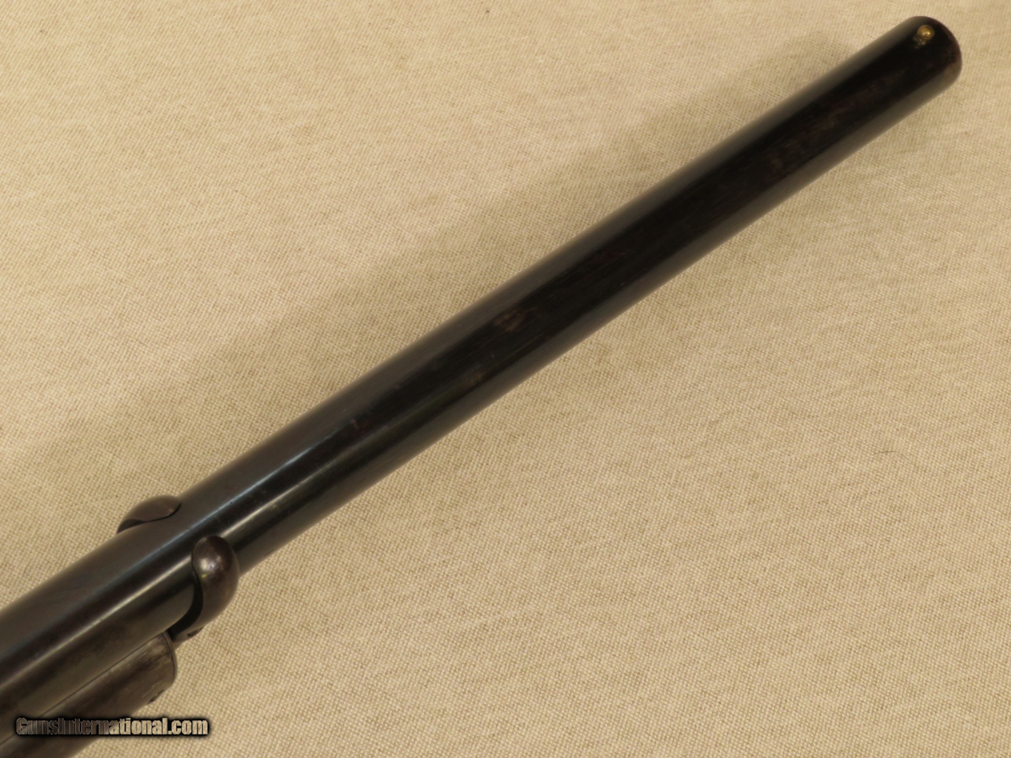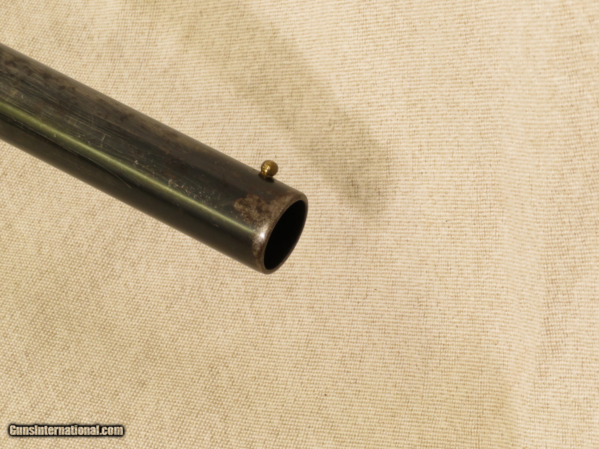 Description: The 1893 was Winchester's first pump action shotgun and was originally designed for black powder shells. However, by the late 1890's shells loaded with smokeless powder were becoming more and more common. Unfortunately, the original Model 1893 was not strong enough to handle these stronger loads. Winchester introduced an improved version of the 1893 to handle these new smokeless rounds which it re-designated the Model 1897. Fearing lawsuits, Winchester issued one of the first national product recalls in the United States, encouraging all owners of the Model 1893 to return their guns to the factory in exchange for brand new Model 1897's. Of the approximately 34,000 units produced, many were returned and scrapped by Winchester. Today, while it is not impossible to find a surviving Model 1893, they are far from common and it can be a challenge to locate survivors in decent condition. We rarely see these and most have been well-used with little or no finish remaining and/or are inoperable. This particular example has survived with a lot of its original finish and is in good working order. While this is one of the better 1893's we've seen in quite some time, the barrel which was originally 30" choked full has been trimmed down to 28" with no choke remaining. Otherwise, this is a very nice example. The bore is in Good condition but shows scattered pitting thoughout. The action works nicely as well. A hard to find Winchester that would fill a spot in a Winchester 1897/pump gun collection. PRICE: $995 We are Antique & Modern Firearms in Lexington, KY, dealer of fine firearms since 1974. PH. 859-276-1419 We Buy, Sell and Trade Firearms & Knives. Have a Individual Firearm, Firearms Collection, or Firearms Estate to sell, let us know, we can buy or consignment sell it for you. (sales at am-firearms) SOLD Antique: Yes Shotgun Gauge: 12 Gauge Manufacturer: WINCHESTER Model: 1893 Serial Number: 4563 Barrel Length: 28 Chambers: 2-5/8 |