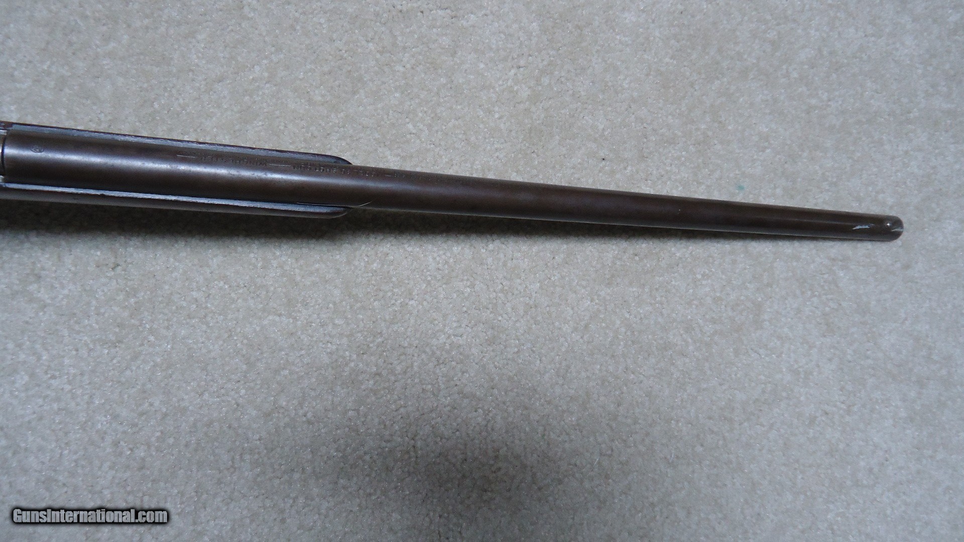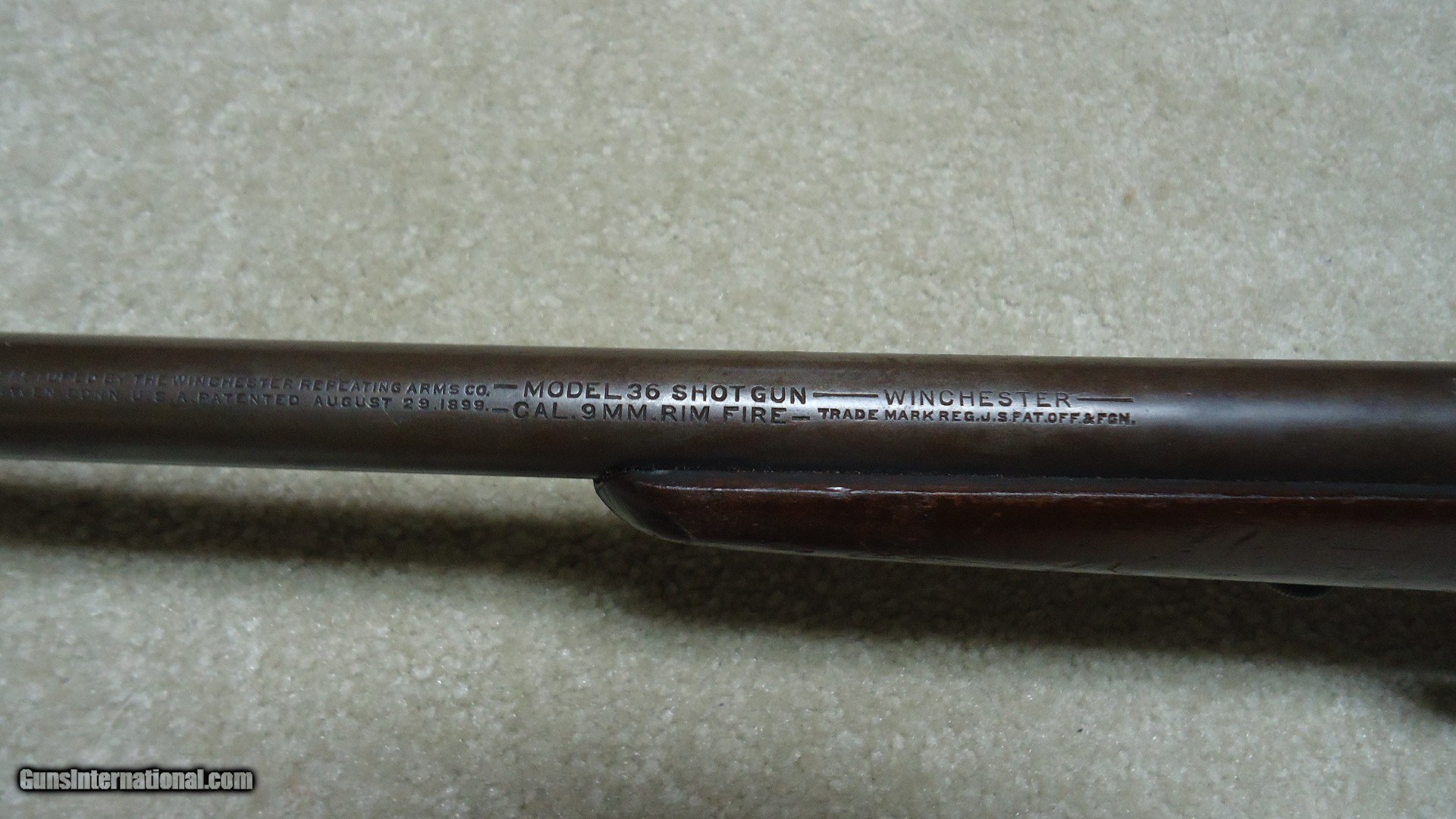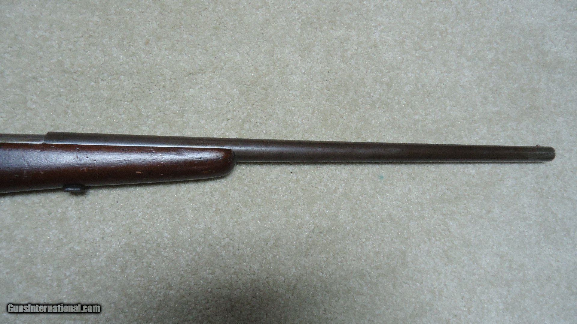 Description: SCARCE MODEL 36 SINGLE SHOT BOLT ACTION 9MM RIMFIRE SHOTGUN, MADE 1921-1929. These little guns are best described by George Madis in The Winchester Handbook as follows: In a departure from the trend to smokeless powder, Winchester produced the Model 36 single shot shotgun, intended for use only with black powder. Two rimfire shot cartridges were made by Winchester for the Model 36; the 9MM SHORT, or single charge, and the 9MM LONG, or double charge cartridge. Both of these shells were loaded with number nine shot. A ball cartridge was also offered. This little shotgun was considered a "garden gun" and an all around gun for boys or men. (Sounds a little sexist by today's standards...does that mean girls and women were forbidden from using the Model 36?) A total of 25781 of these were made when it was discontinued in 1929- no doubt the stock market crash and following Great Depression killed this odd little shotgun. When found today, they are usually in horrible condition as they were "garden guns" used for that purpose and usually didn't see the care and cleaning of the owner's other sporting guns. This one is one of the better examples I've seen as it has the original gum wood stock which is not cracked or chipped and retains good original wood finish. The barrel blue has aged and thinned to brown with excellent markings intact. the bore is basically bright with a few dark spots that will probably brush out. Has the correct bead front sight and no provision for a rear sight. Exc. mechanically and retains the original hard rubber butt plate. A true unique Winchester oddity! SOLD Curio/Relic: Yes Manufacturer: Winchester Model: MODEL 36 Serial Number: N/A Condition: VG |