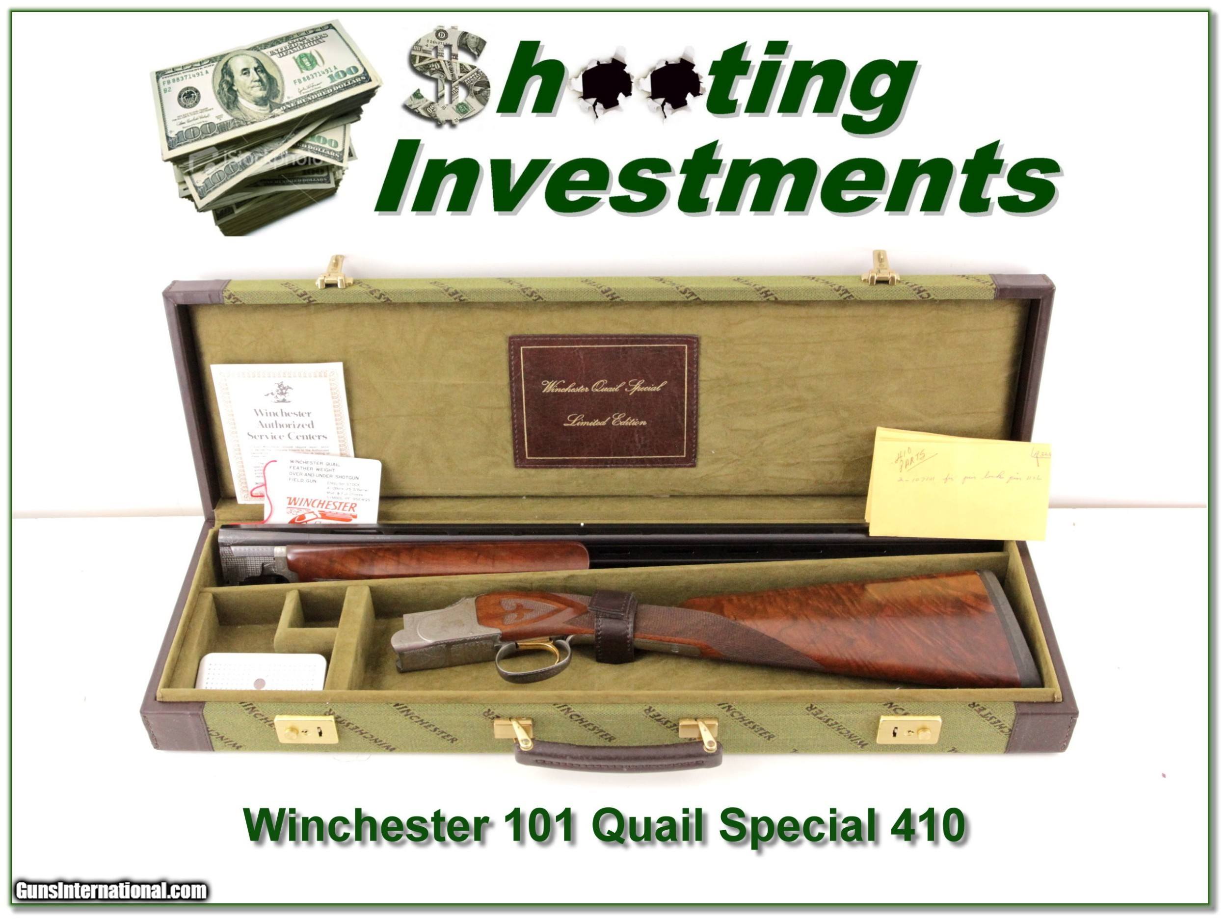 Description: This is beautiful and limited-edition Winchester 101 Quail Special in the hardest to find 410 bore. It has outstanding wood and I find no signs of use. It has 25.5in barrels choked full and full. It comes as seen in original case with hang tag. I am selling this one on consignment and as such lay-a-way can’t be used. It does of course have the standard 3-day inspection. Shipping with insurance is $69. Please email me with any questions or larger pictures. (Consign your quality firearms with Shooting Investments for only 12%! Let me know if you have any you would like to sell!) 19-1393 Payment: Payment is by Money Order, Cashiers Check or Personal Check. I can now also accept MasterCard and Visa with a 3% convenience fee. PayPal can be used for some items but never firearms. Please let us know if you would like to pay via PayPal. Shipping: The shipping charge will be listed in each description. It is $39 for most long guns and $29 for most handguns. Some heavy guns or those insured for over $2000 will be higher. Shipments to Alaska and Hawaii are higher because air shipment is required. Most firearms are shipped on Tuesday and Thursday and usually in 5 days of receipt of payment. We package all shipments carefully and insure them. For long guns you can purchase a new Plano case for $19. They now cost us $22 when buying 100 at a time. Optics are shipped Priority Mail and most other non-firearm shipments are shipped First Class. Returns: Our return policy is simple. If for any reason you are not pleased with your purchase, you may return your item for a full refund of purchase price. Ammunition cannot be returned. It is important to us that you are happy. Guns cannot be fired or dissembled before returning them and they must be returned in the same condition as received. Notification of a return must occur with-in 3 days of receipt at your dealer. Shipping, convenience and dealer fees are not refundable and are the responsibility of the buyer. Lay-a-way: If needed, we offer a 60 day lay-a-way option on most firearms. It is 1/3 now, 1/3 in 30 days and 1/3 in 60 days. Lay-a-way firearm sales are final and if not completed the first payment cannot be returned. Consigning your firearms with Shooting Investments: We will help you get top dollar for your firearms. While most local guns shops charge 20% or more, our fee is only 12% with a minimum of $75. At your local gun shop it might take months to sell. Selling on-line provides instant access to thousands of interested buyers. You won’t find any other on-line dealer willing to sell your firearms for only 12% or listing every gun on 3 separate s. Selling through an House typically costs the seller 15% and the buyer an addition 15% (so 30%) and you have to wait several months to sell and longer to receive funds. If properly priced, we will sell your firearms in a few weeks. Send us an email or give us a call and we’ll explain how easy it is for you to get top dollar. Trading: Trading for use is really just buying your gun to re-sell. If you have a gun you want to trade, please email a picture and we will let you know what we can give or it. You will always get more if we sell it for you on consignment. Help for California Buyers: We are happy to ship to California. It is the buyer’s responsibility to make sure any item you buy is legal in your state. We are also happy to help with your purchase of a firearm from someone other than us. If you see a gun you would like to buy but the seller can’t or won’t ship to California they can ship to use and we’ll then ship it to your California dealer. The cost for this service is only $30 + shipping. Let us know if we can help! SOLD |
