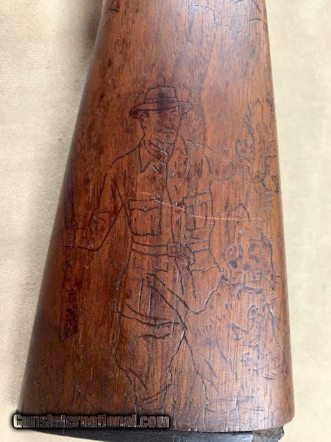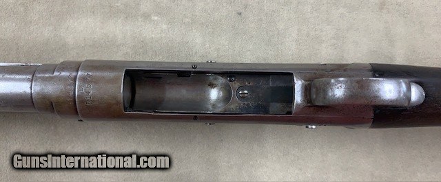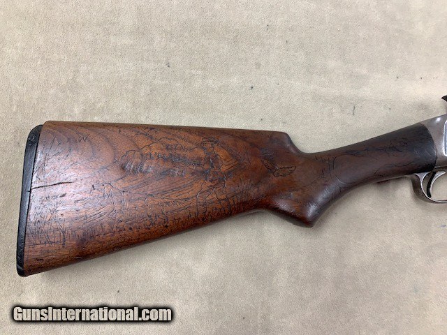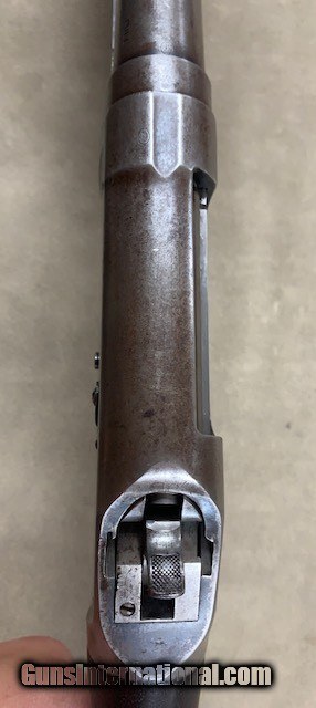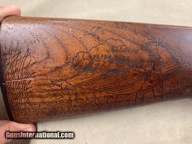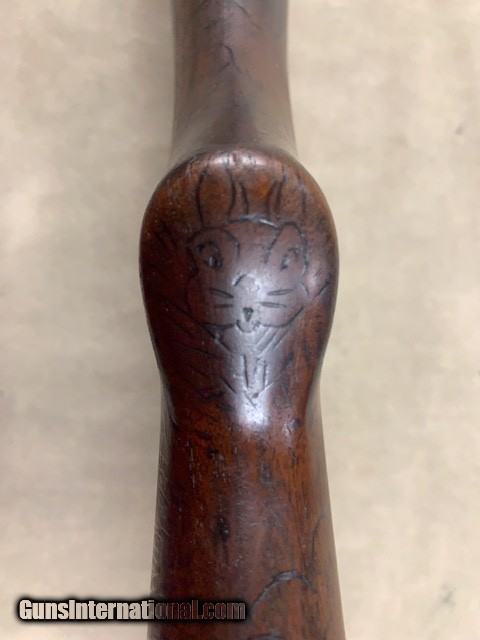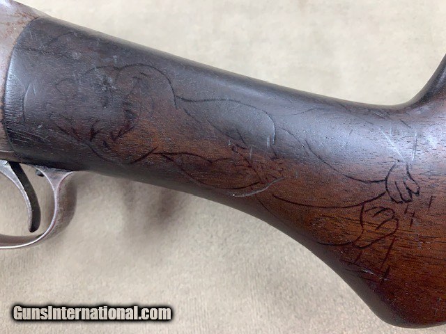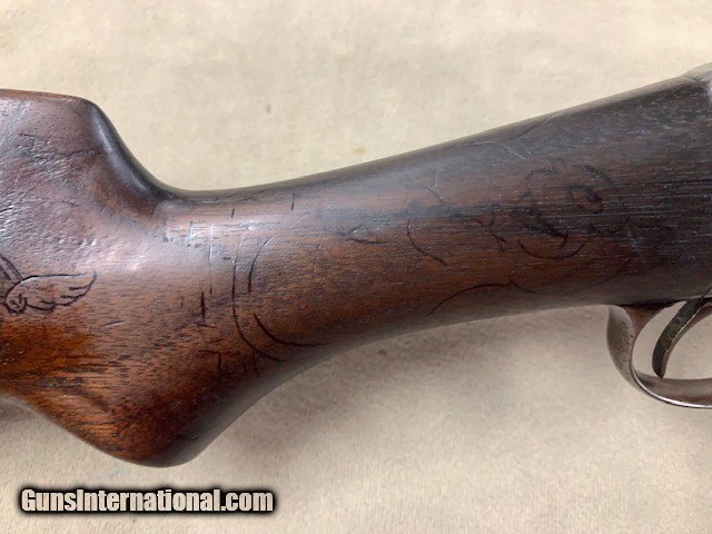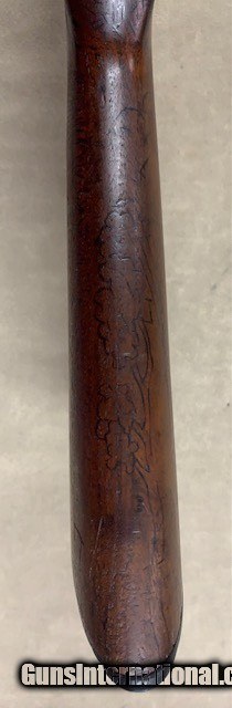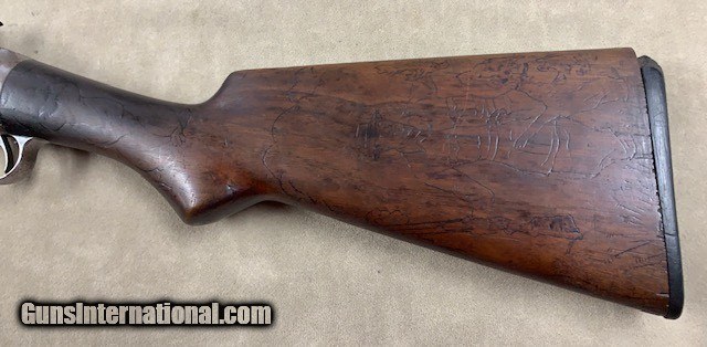 Description: An early model 1897 Winchester with a 30 inch full choke barrel that was manufactured in 1911. Bore and 2.5 INCH chamber are excellent condition. Not much finish mostly an even patina - would be a good candidate for refinishing. Stock has some carving (see photos) which appear to have been done by someone with a bit of talent. These guns usually not found with the original short chambers like this one. SOLD Curio/Relic: Yes Shotgun Gauge: 12 Gauge |