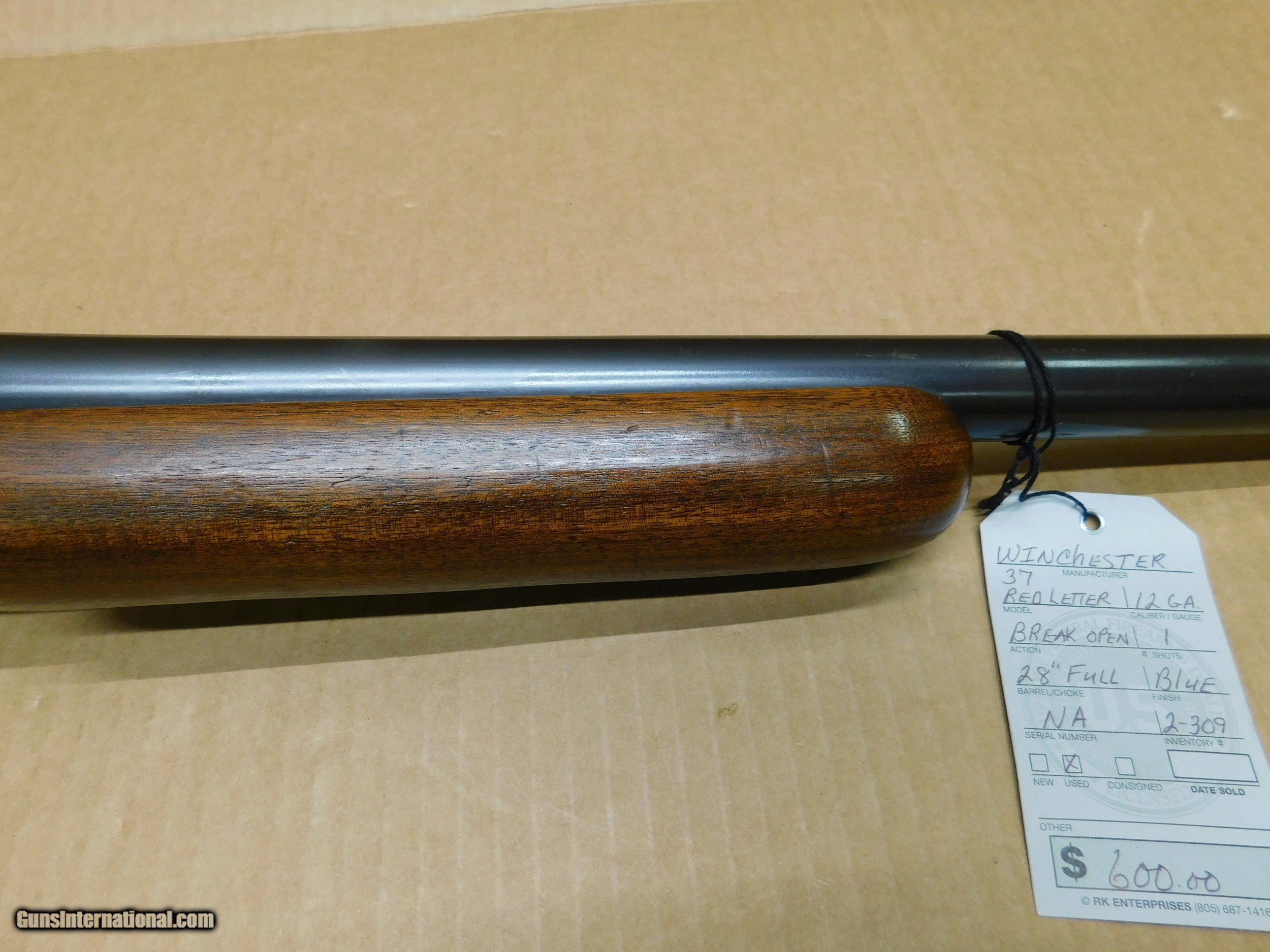 Description: Winchester, Model 37 "Red Letter" 12 gauge single shot break open shotgun It is has a 28" full choke blued barrel, and retains 80% of its finish No serial number SOLD Manufacturer: Winchester Model: 37 Serial Number: NA Bore: good Condition: Used Metal Condition: good Wood Condition: good Bore Condition: good Barrels: 28 Barrel Type: round Action: Break Open Triggers: Standard Gauge Info: 12 Stock: Wood Butt Pad: Plastic Finish: Blue Sights: None Chokes: Full |