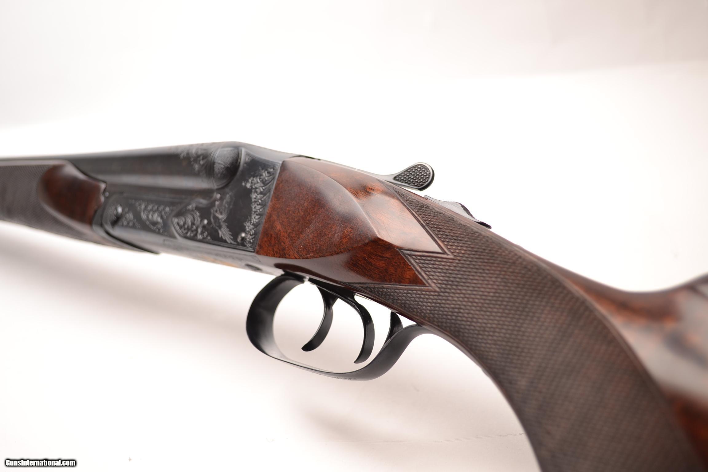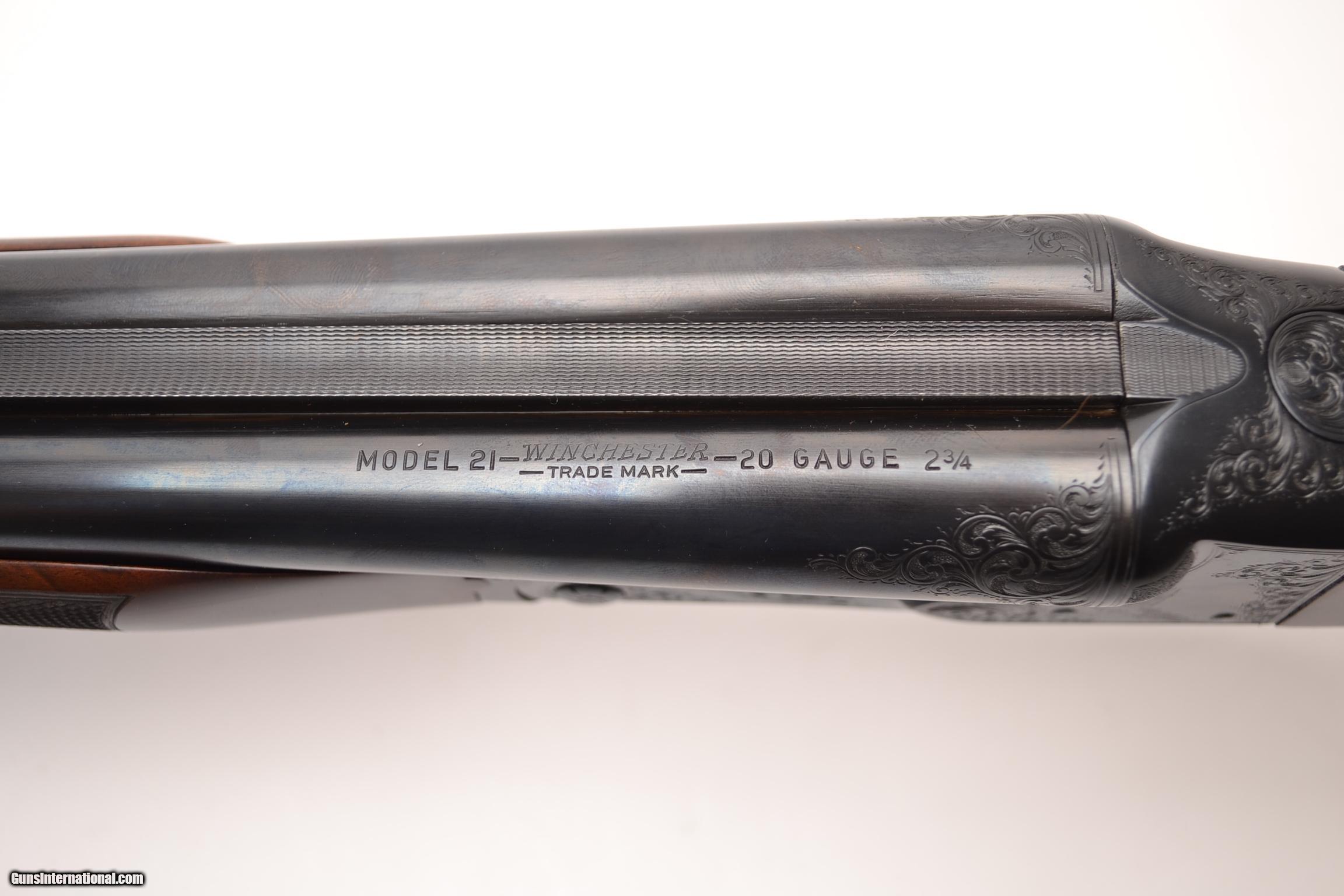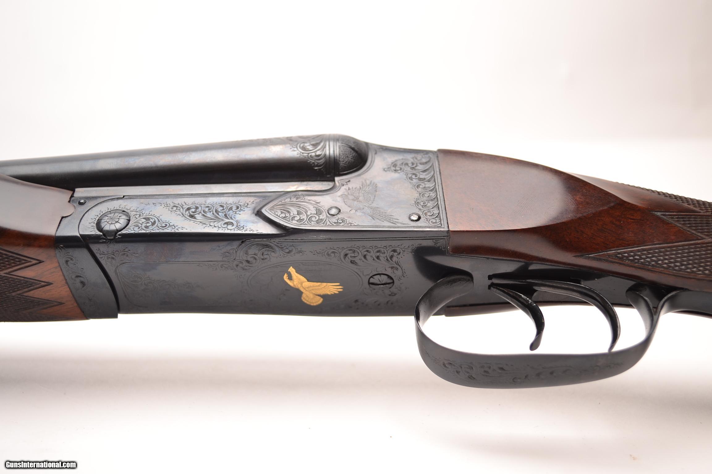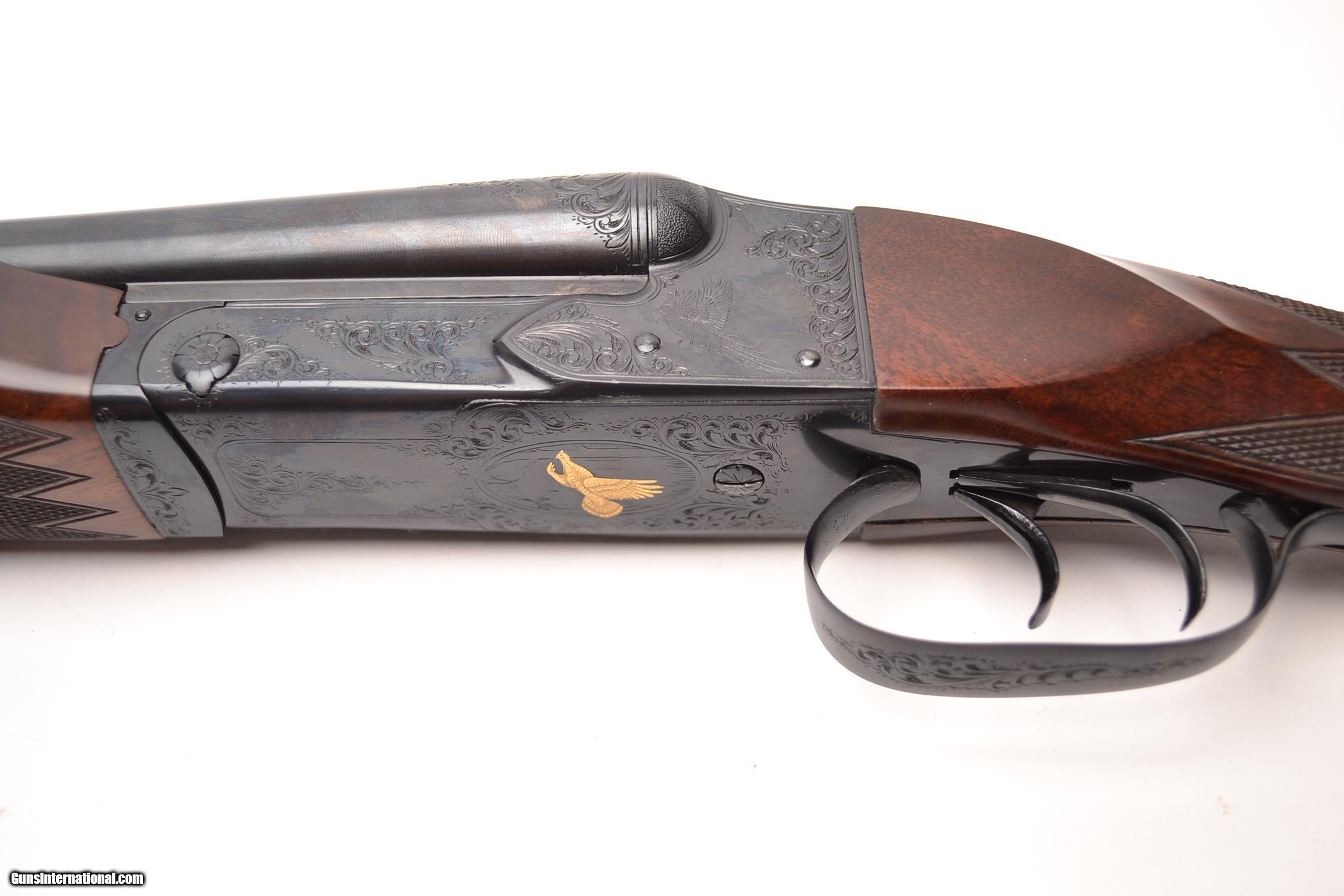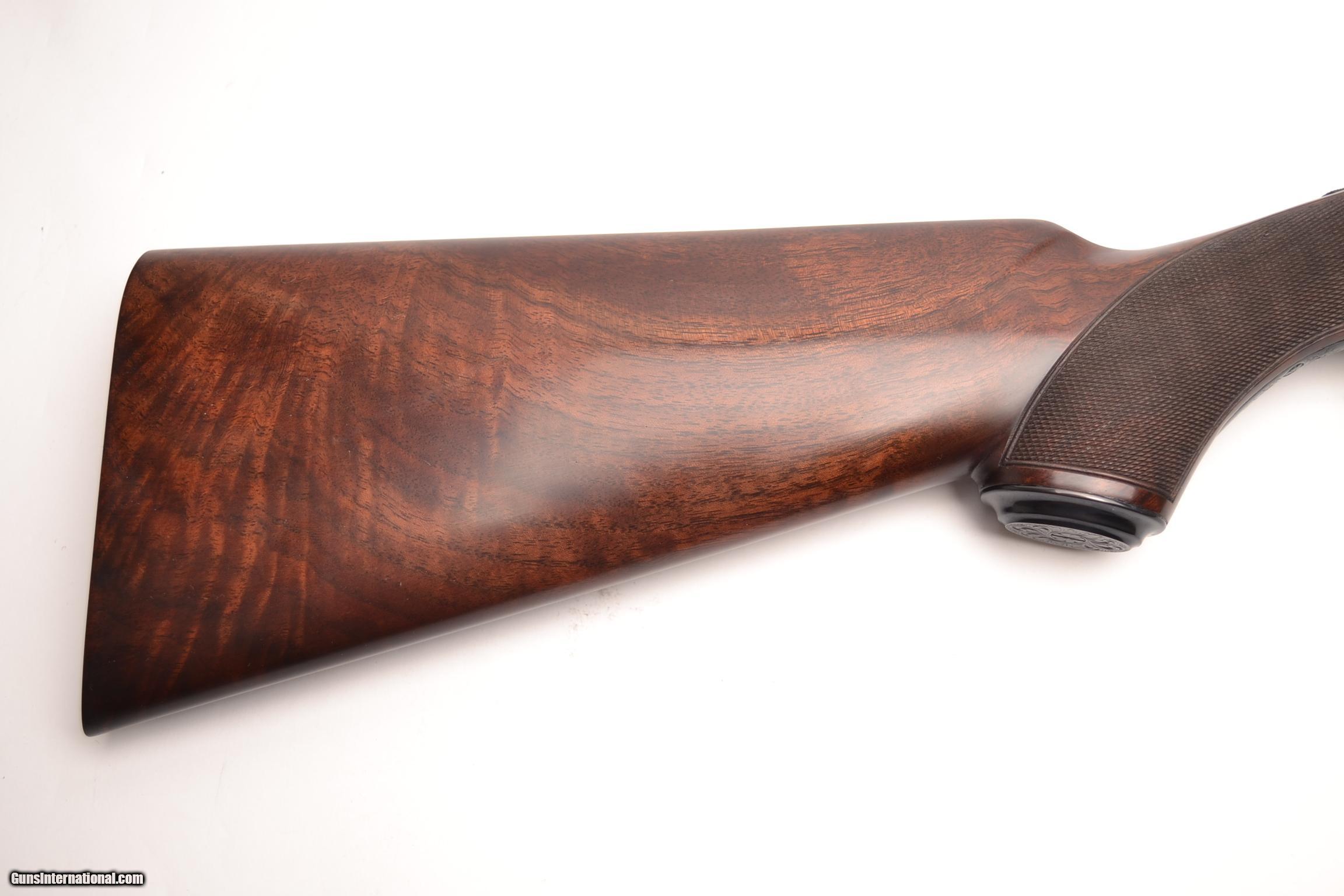 Description: Winchester Model 21, 20ga., 28” barrels choked F/M. Capped pistol grip, checkered butt, double triggers, auto ejectors. This is a very rare gun with a beavertail forend, multi-point checkering, early gun with a nicely figured black walnut, This is a special order gun factory engraved by George Ulrich with beautiful game scenes on the side and a flushing gold grouse on the bottom. This is a great gun from an old collection and is in as new condition. Seldom found with upgraded features and double triggers and auto ejectors. Inv: 29358 14 ¼” LOP Price: $13,995 SOLD |
