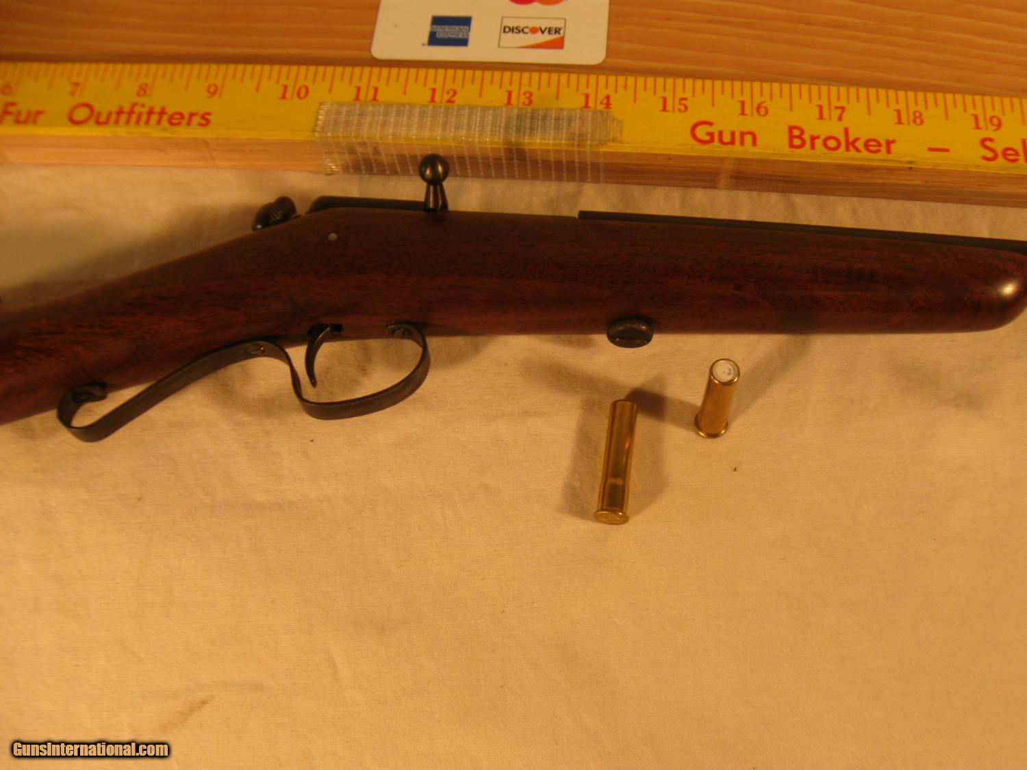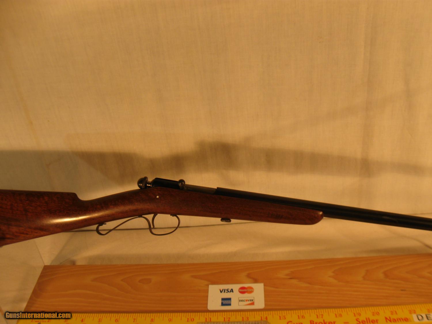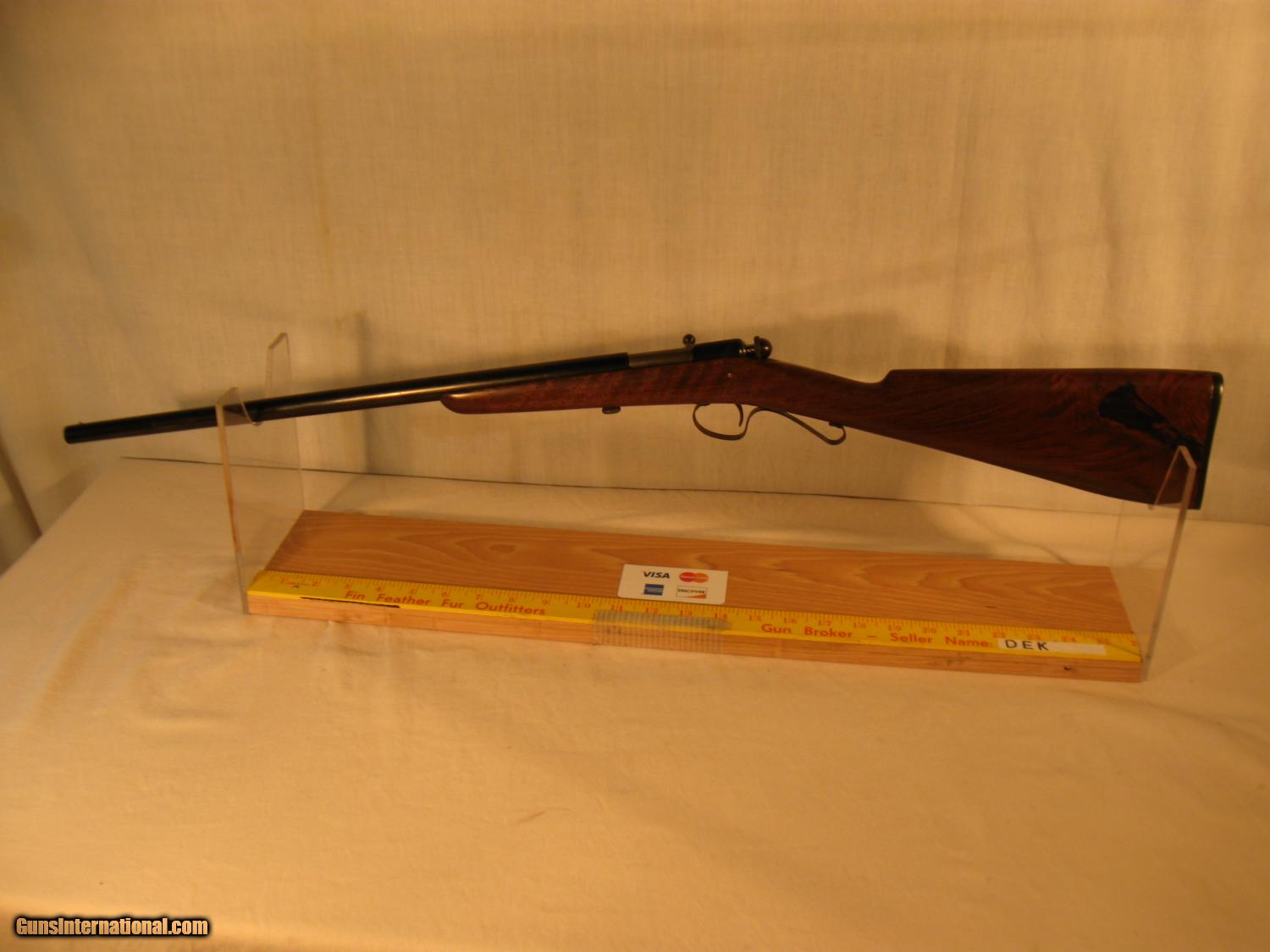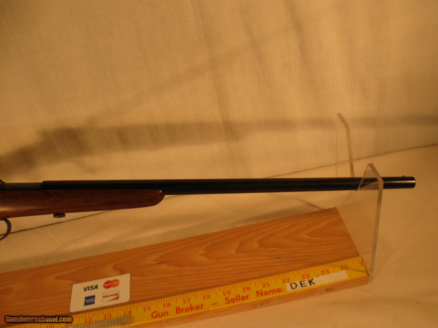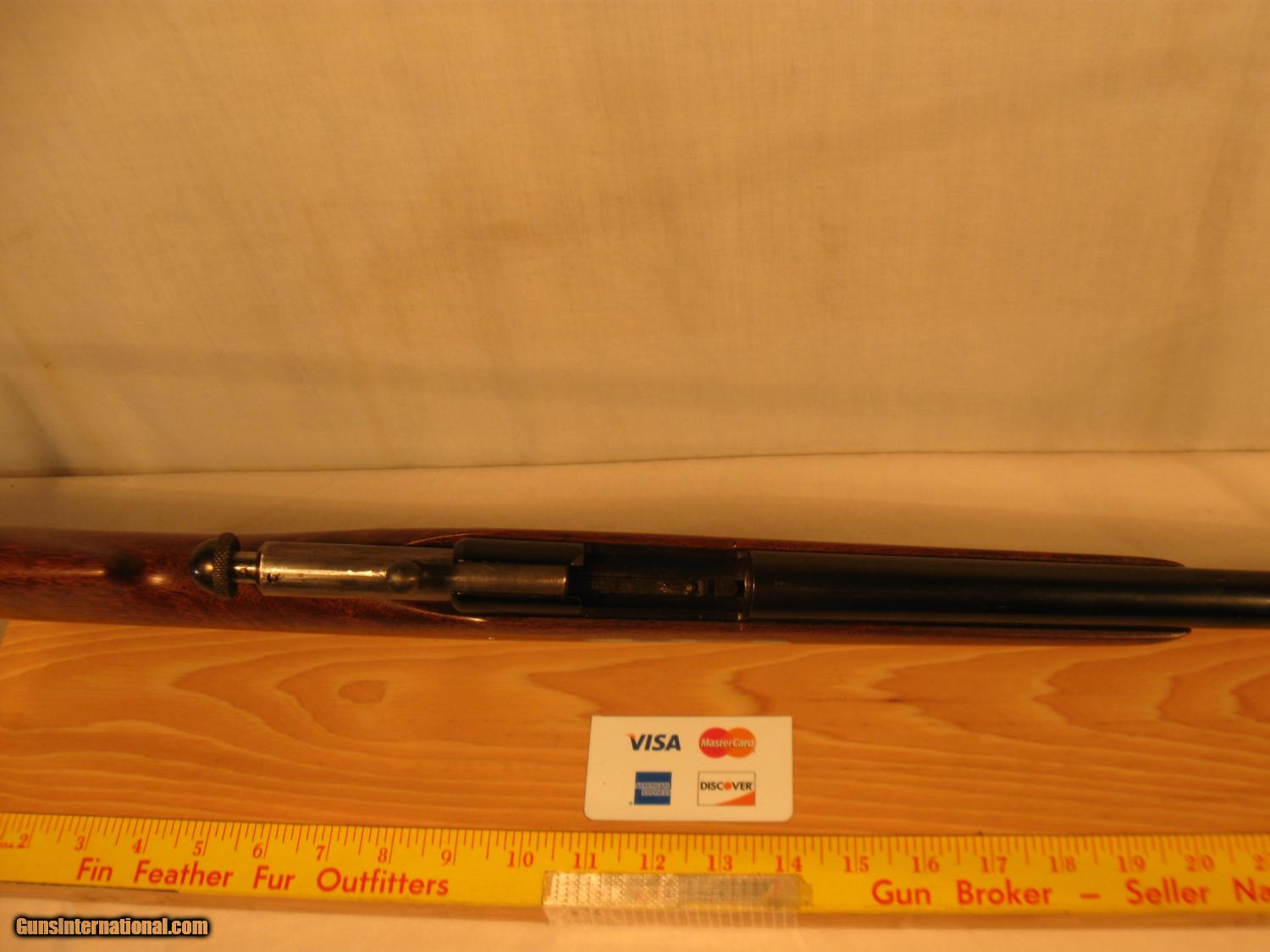 Description: Winchester Model 36 single shot bolt action 9mm RF shotgun. Sometimes called the garden gun or indoor skeet gun. This gun has bee restocked in a nice piece of American Walnut and reblued. There are some traces of pits on the barrel. This gun has a 17 1/2" barrel and is very attractive, but no longer a collector's item. Can ship to C&R. Plastic accepted at 3%. SOLD Curio/Relic: Yes |