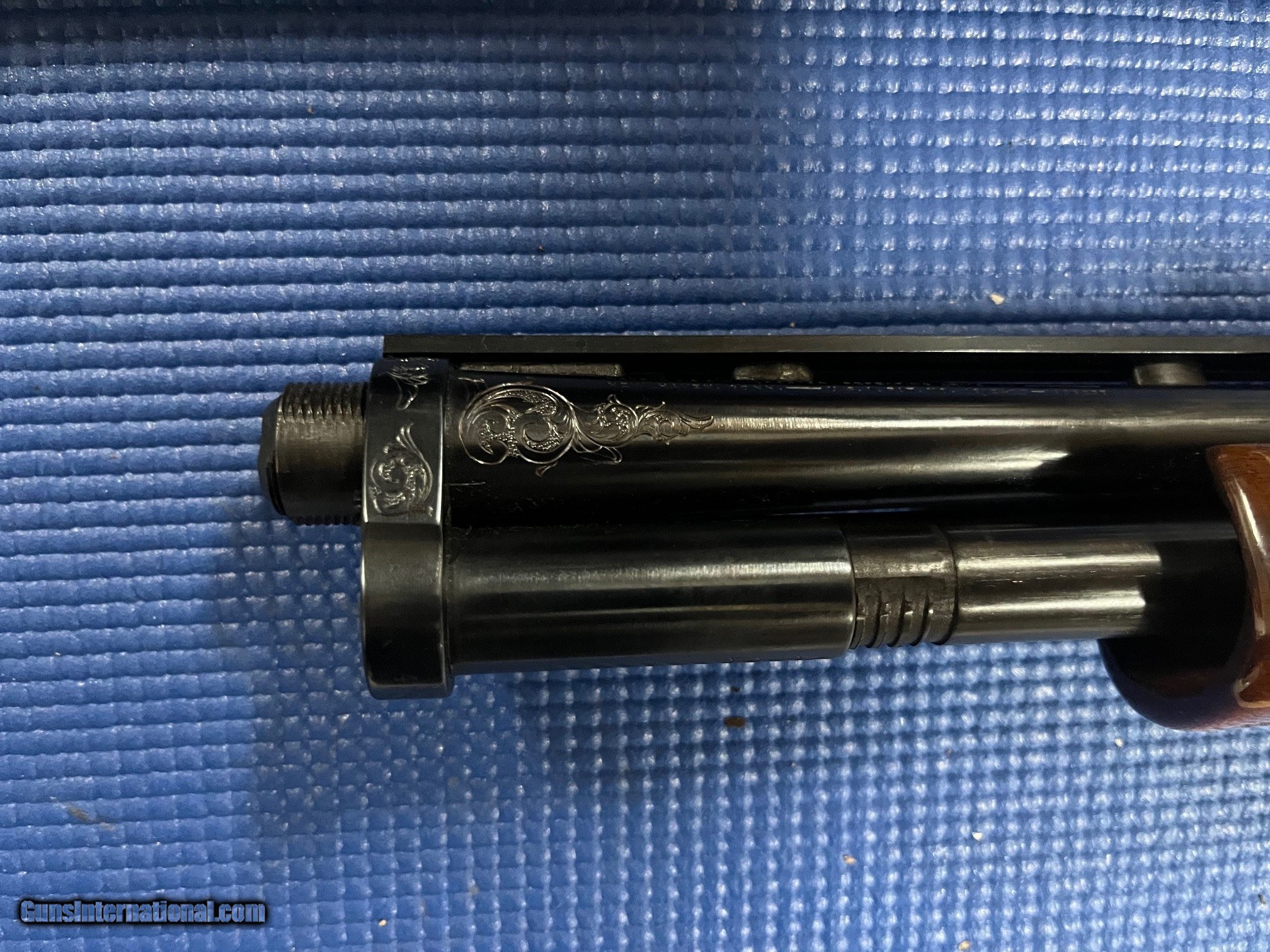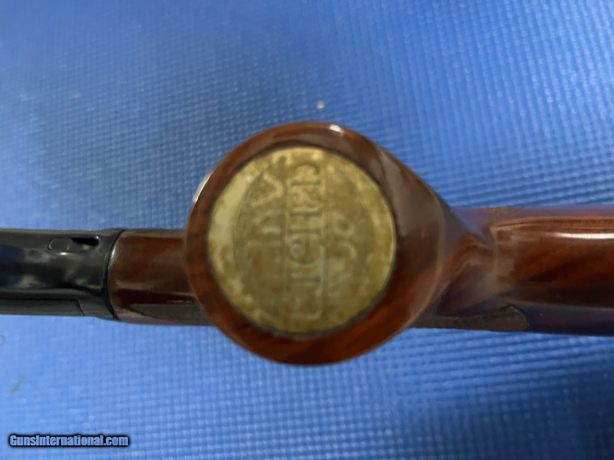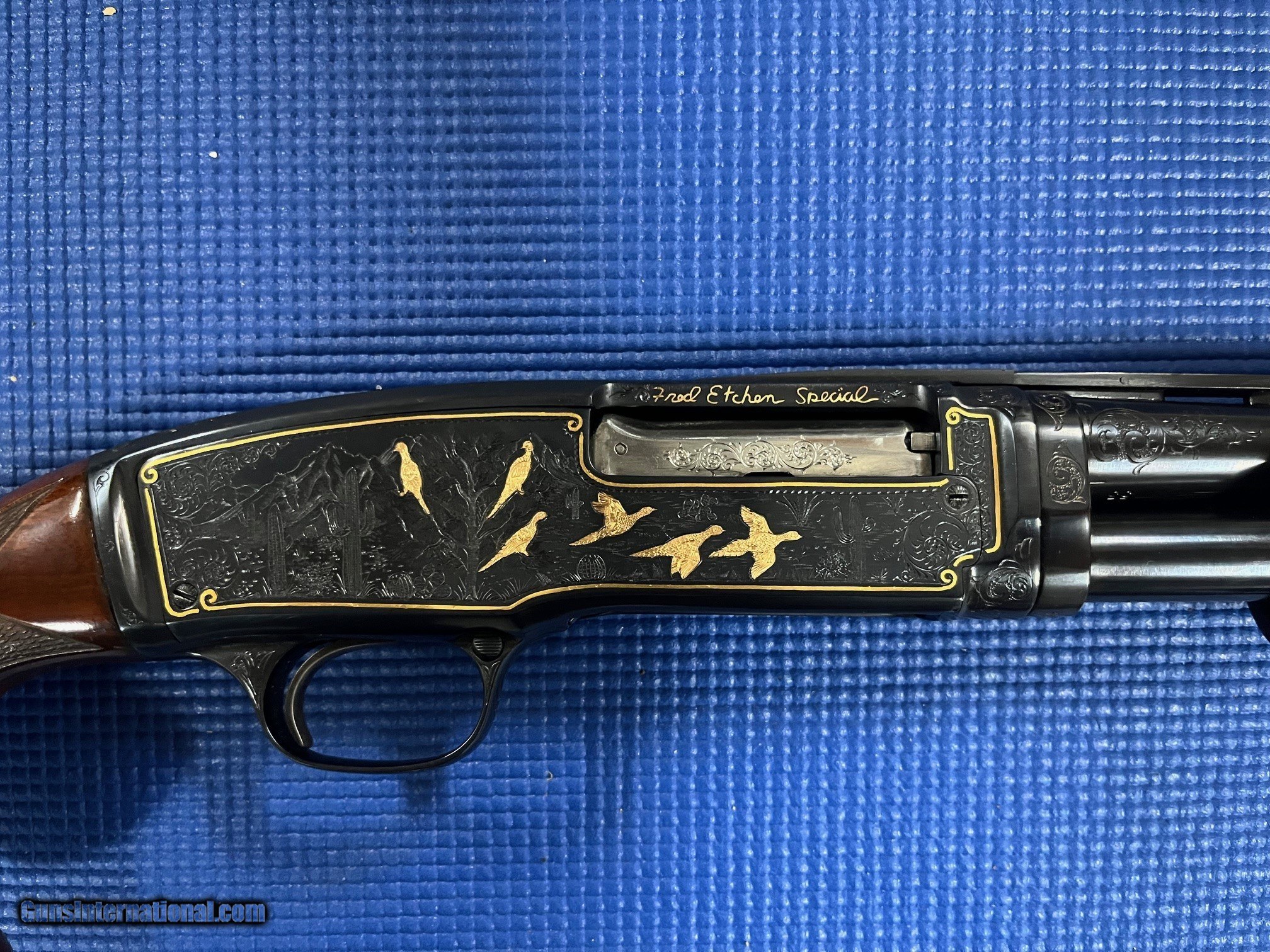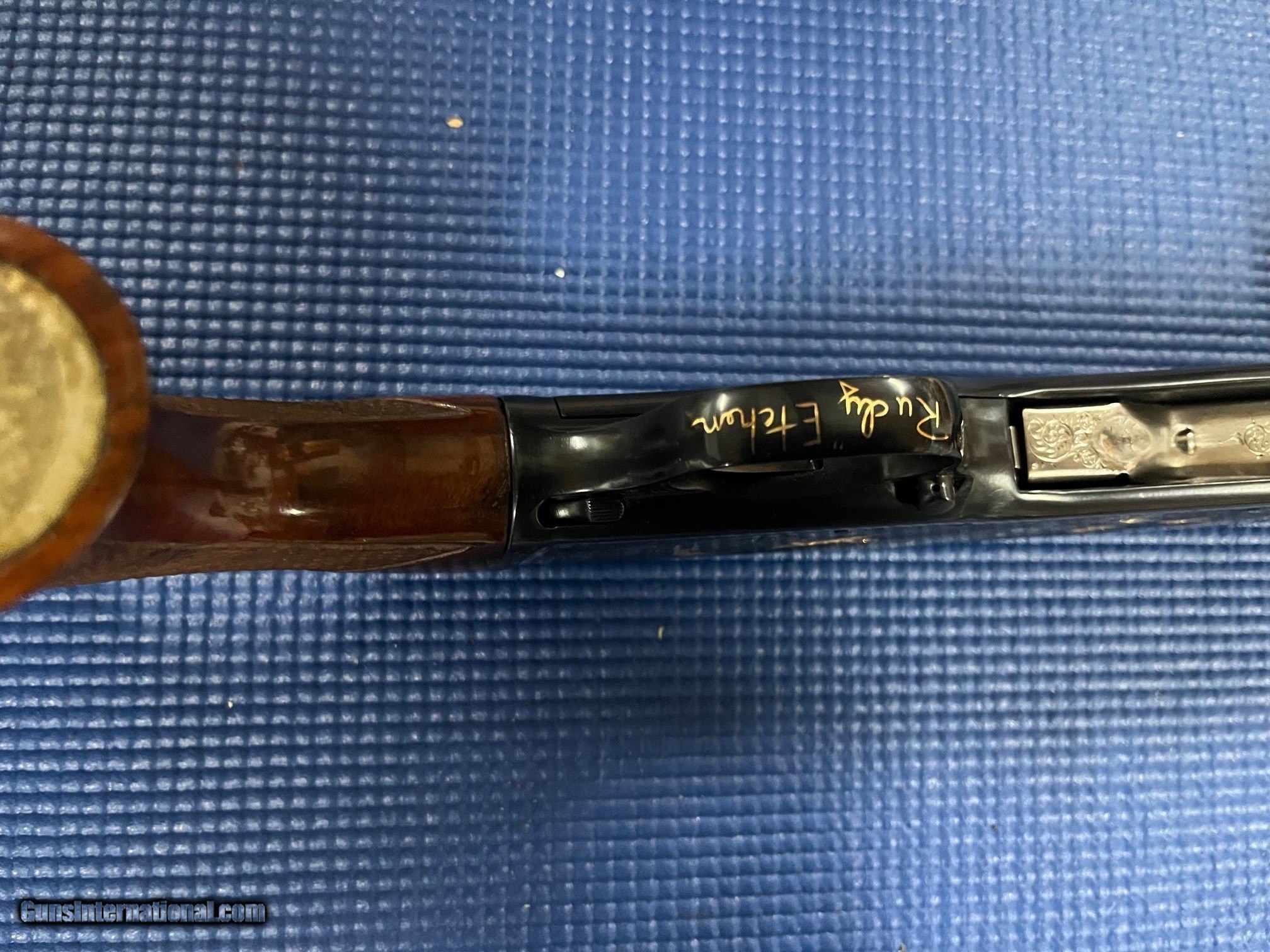 Description: Winchester Model 42 with custom Fred Etchen unique monte carlo stock and pistol grip made for Rudy Etchen, Neil Harlip engraved with Gold border and inlays. 2 sets of 28 inch barrels-one with full choke and one mod that has Briley choke tubes added to it. One of Rudy Etchen's personal guns that his son Joel is selling Looking for a new home. Wood is about 85% with some handling marks and aged woood, metal very nice. Fred Etchen (Olympic Gold winner 1924) developed this stock design in the early 1940's SOLD Shotgun Gauge: .410 Gauge Manufacturer: Winchester Model: 42 Serial Number: 42xxx Condition: 85 Metal Condition: 90 Wood Condition: 80 Bore Condition: good Action: pump |