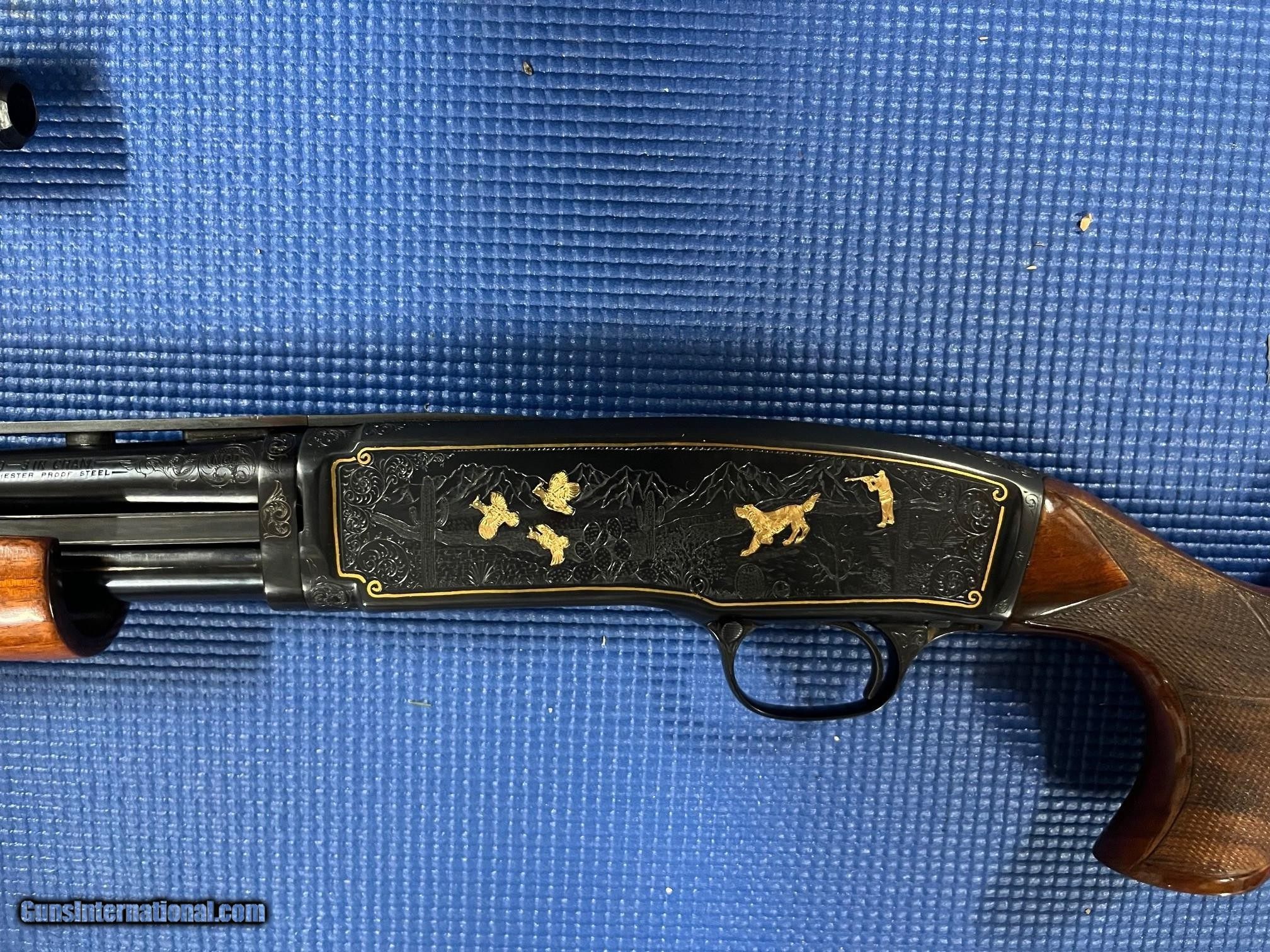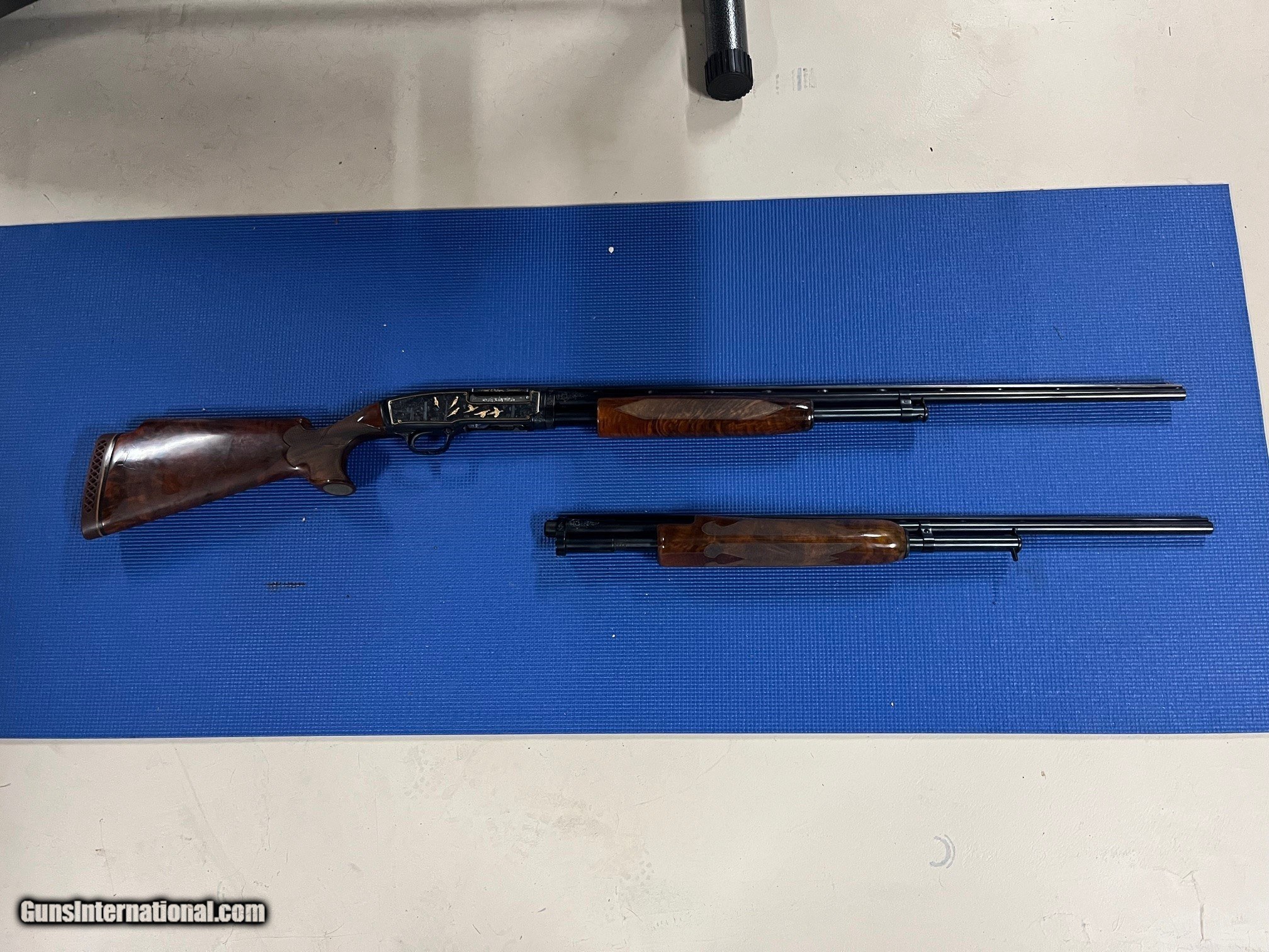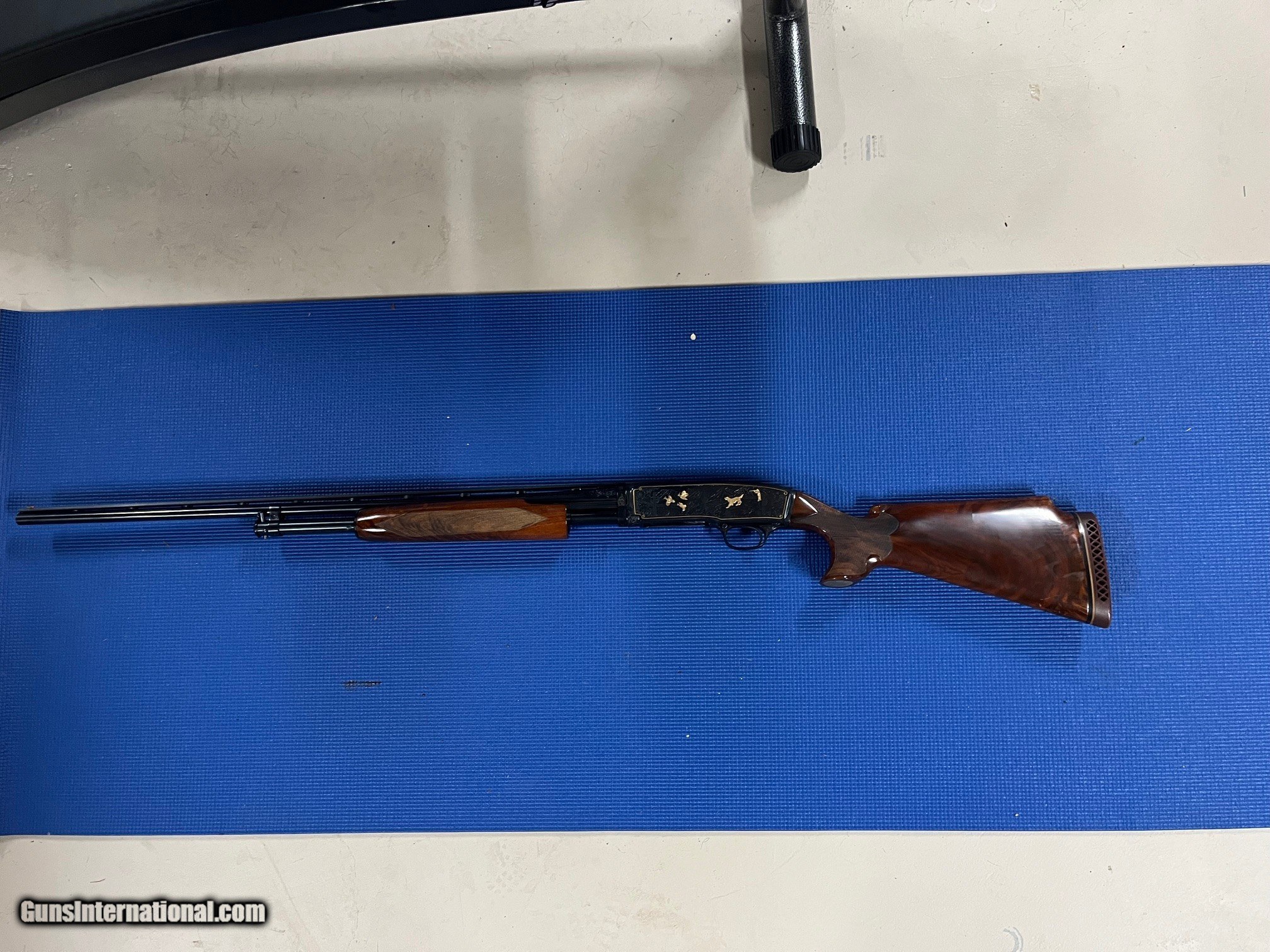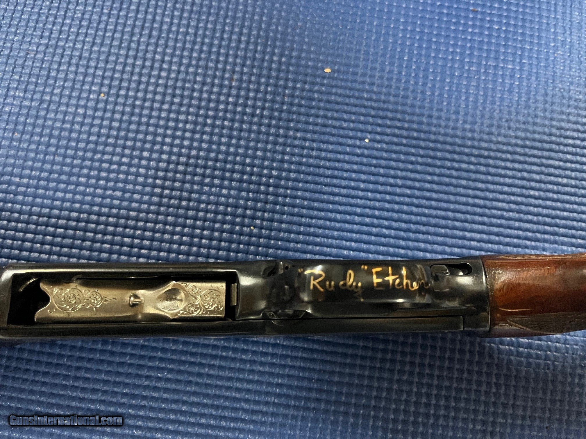 Description: Winchester Model 42 with custom Fred Etchen unique monte carlo stock and pistol grip made for Rudy Etchen, Neil Harlip engraved with Gold border and inlays. 2 sets of 28 inch barrels-one with full choke and one mod that has Briley choke tubes added to it. One of Rudy Etchen's personal guns that his son Joel is selling Looking for a new home. Wood is about 85% with some handling marks and aged woood, metal very nice. Fred Etchen (Olympic Gold winner 1924) developed this stock design in the early 1940's SOLD Shotgun Gauge: .410 Gauge Manufacturer: Winchester Model: 42 Serial Number: 42xxx Condition: 85 Metal Condition: 90 Wood Condition: 80 Bore Condition: good Action: pump |