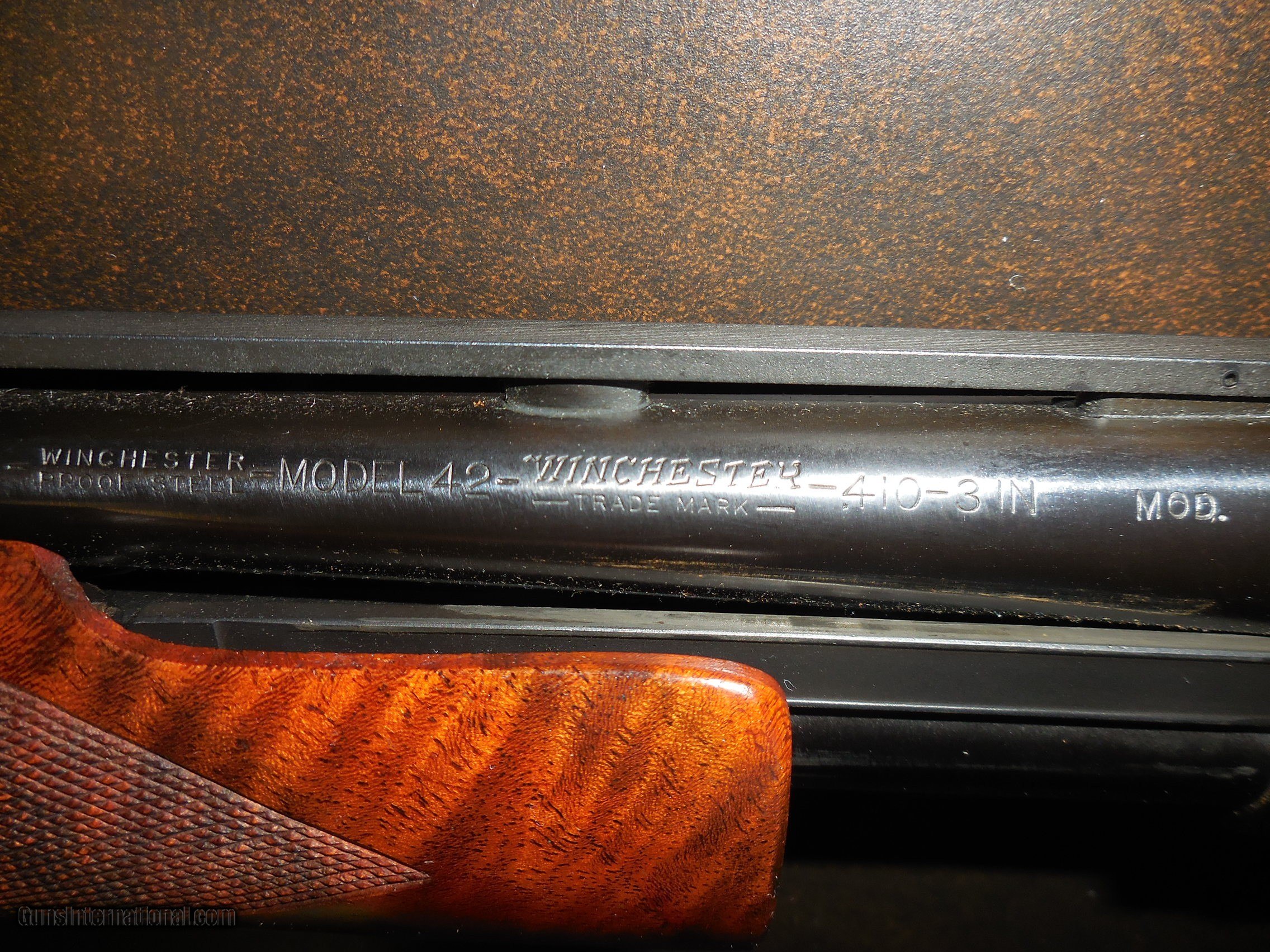 Description: Winchester Model 42. modified choke, 26” barrel, 3” chamber, grade 5 wood, tight checkering, Simmons ventilated rib, manufactured in 1937. Condition is excellent, wood is 99% with very few minor handling marks, Blueing is 99% with one blemish on the top of the rib. See pictures. More pictures available on request. SOLD Shotgun Gauge: .410 Gauge |
