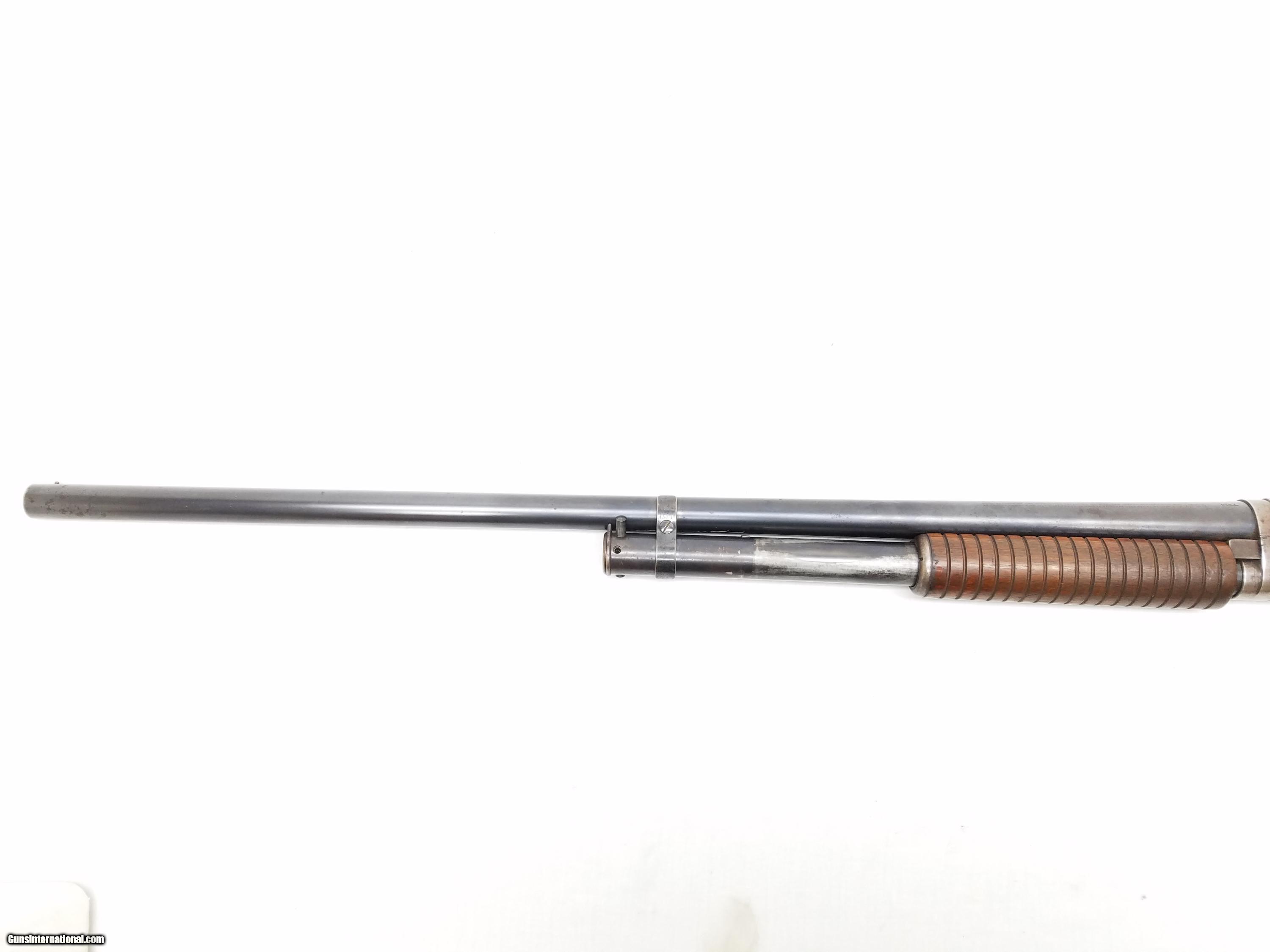 Description: This is a 1914 Winchester model 97 chambered for 2-¾” 12 gauge shotshells. The 30” blued barrel is in good condition. The blueing is relatively even save for a few dings and there is no pitting. The bore is smooth and the choke is full. The magazine tube has finish wear from the forend and is developing a patina. The blued receiver has finish wear and light pitting around the edges and some scattered scratches. A patina is developing where the finish is worn, on the trigger guard, and on the side of the bolt. The walnut forend and buttstock are in good condition having a few small scratches but none that disrupt the finish. A 1” rubber recoil pad is installed on the butt. Length of pull is 13”, overall length is 48-½”, and weight is 7.2 lbs. Our stock number is #A361. Willing to ship anywhere in the US to your FFL, buyer pays freight and insurance. SOLD Curio/Relic: Yes Manufacturer: Winchester Model: 97 Metal Condition: fair Wood Condition: good Bore Condition: good Action: Pump Gauge Info: 12 Ga Stock: walnut LOP: 13 Finish: blued Weight: 7.2 lbs |