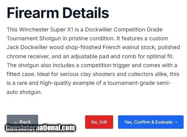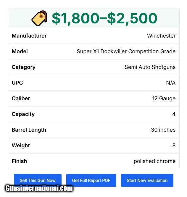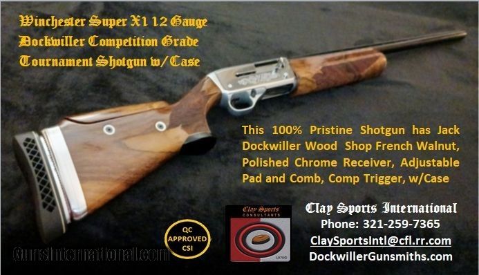 Description: Clay Sports Holiday Special Winchester Super X1 12 Gauge Dockwiller Competition Grade Tournament Shotgun With High Gloss Receiver, Special Circassian Walnut Stock with Adjustable Comb and Butt Plate w/Case Clay Sports International 321.259.7365 This Winchester Tournament Grade 12 gauge, with its 28” Improved/Modified Choke, has been customized to shoot Skeet, Sporting Clays, Five-Stand, and Speed Trap. The adjustable Comb and Pad assembly allows this shotgun to be fitted to any shooter’s physiology. The handsome Chrome Receiver protects the metal and ensures smooth performance for many years. The very impressive French Circassian stock and forearm from the Dockwiller Wood shop, adds to the High Chrome finish to enhance the shotguns overall appearance to match the level of this shotgun’s performance. This is a “One of a kind” Winchester. The shotgun has gone through our quality performance test and has the CSI Stamp of Quality approval completed as a pre-delivery standard. The shotgun will be delivered in a sturdy Military Cordura Grade case with a Rust Prufe Chamois to protect the wood and metal for up to six months. Please feel free to contact us at 321-259-7365 to Request further information or to place your order. We look forward to working with you and appreciate your interest. Happy Holidays! 321.259.7365 Clay Sports International Shotgun Gauge: 12 Gauge Manufacturer: Winchester Semi-auto Model: Super X1 Barrel Length: 28 Condition: Excellent as New Metal Condition: Excellent as New Wood Condition: Excellent as New Bore Condition: Excellent as New Barrel Type: Vent Rib Action: Semi-auto Triggers: Dockwiller Custom Stock: Dockwiller Special Circassian Stock Comb: Fully Adjustable Stock Heel: Fully Adjustable Fore End: Balance Weighted Butt Pad: Fully Adjustable Rib: Vent Finish: High Gloss Dockwiller with Hard Chrome High Gloss Metal Weight: 8.5 Sights: Bead Engraving: Factory Extras: Dockwiller Special Circassian Wood, Hard Gloss Chrome Finish, Custom Trigger, Adjustable Stock Case: Cordura Item Location: Brevard Co FL Grips: Pistol Price: $2,900.00 Shipping: $49.00 Buy Now Contact Seller |