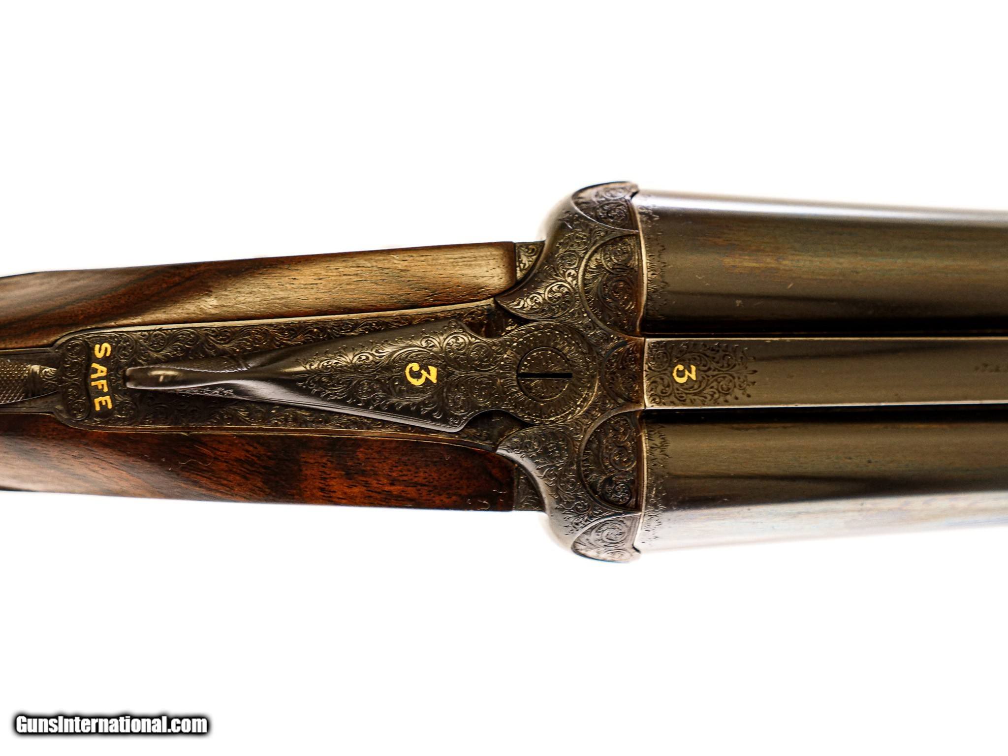 Description: J. Woodward - Best Quality, Full Sidelock, 12ga. 29" Barrels Choked IC/M. Woodworth Steele barrels, 64 St James St address. Automatic safety, side clip, arcaded fences, magnificently engraved with perfect execution small shaded scroll, medicine Turkish walnut feather crotch, very seldom seen. Original silvers pad, bore diameter 732 and 737, on the right .007, on left .016, wall thickness approximately .024 on both barrels. In original oak and leather case, with some vintage accessories that are original to the gun. This gun is completely London refinished, but is virtually showing as a new gun, in fact there was question if it was new. It is just in excellent condition, tight, on face, original label just an all around great gun. The owner says sell it at $16,500. Best offer buys it. Inv: 62531 6 lbs. 15 oz. 15 1/2" x 1 ½" x 2 5/16" (approximately ¼” castoff) $16,500.00 SOLD |