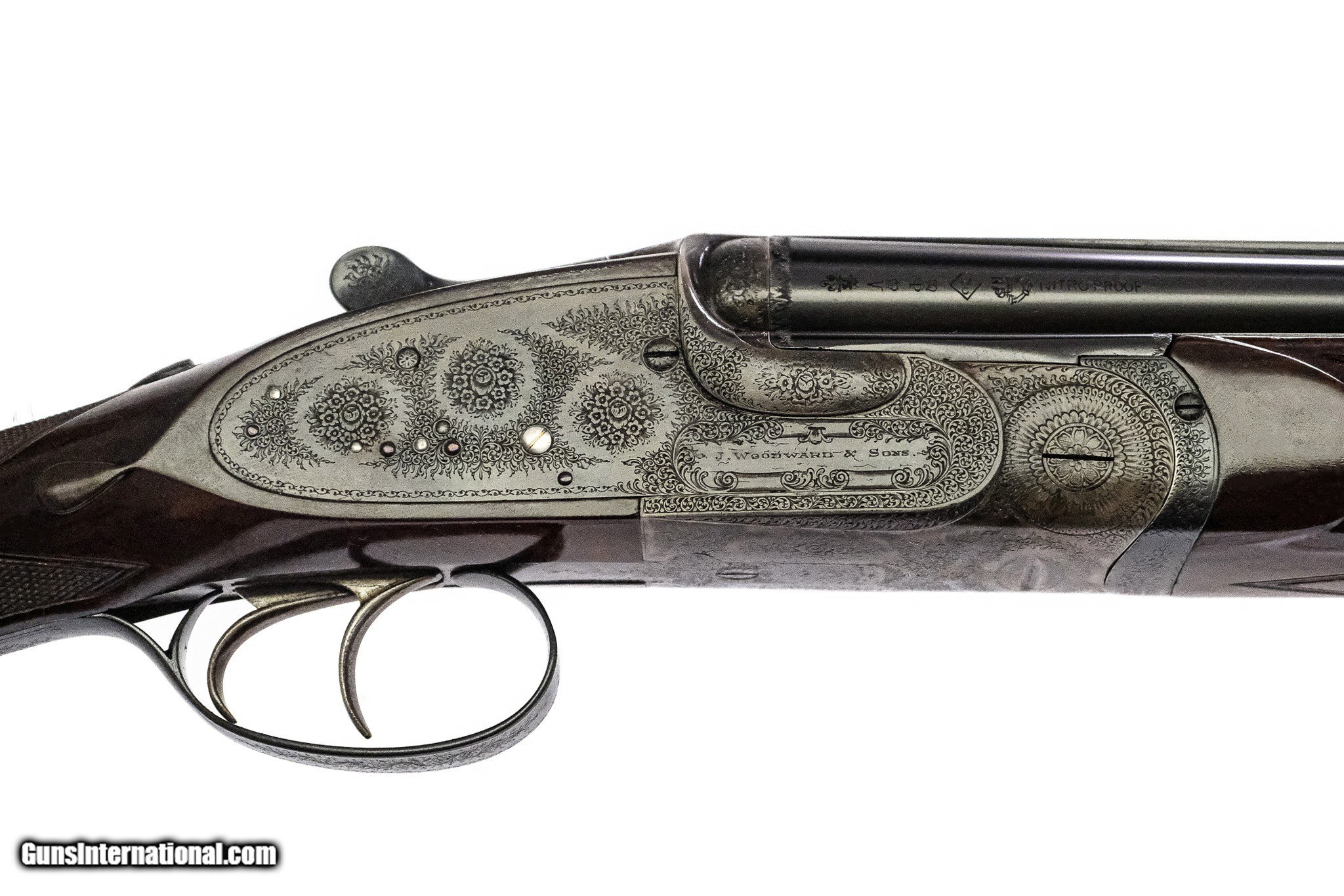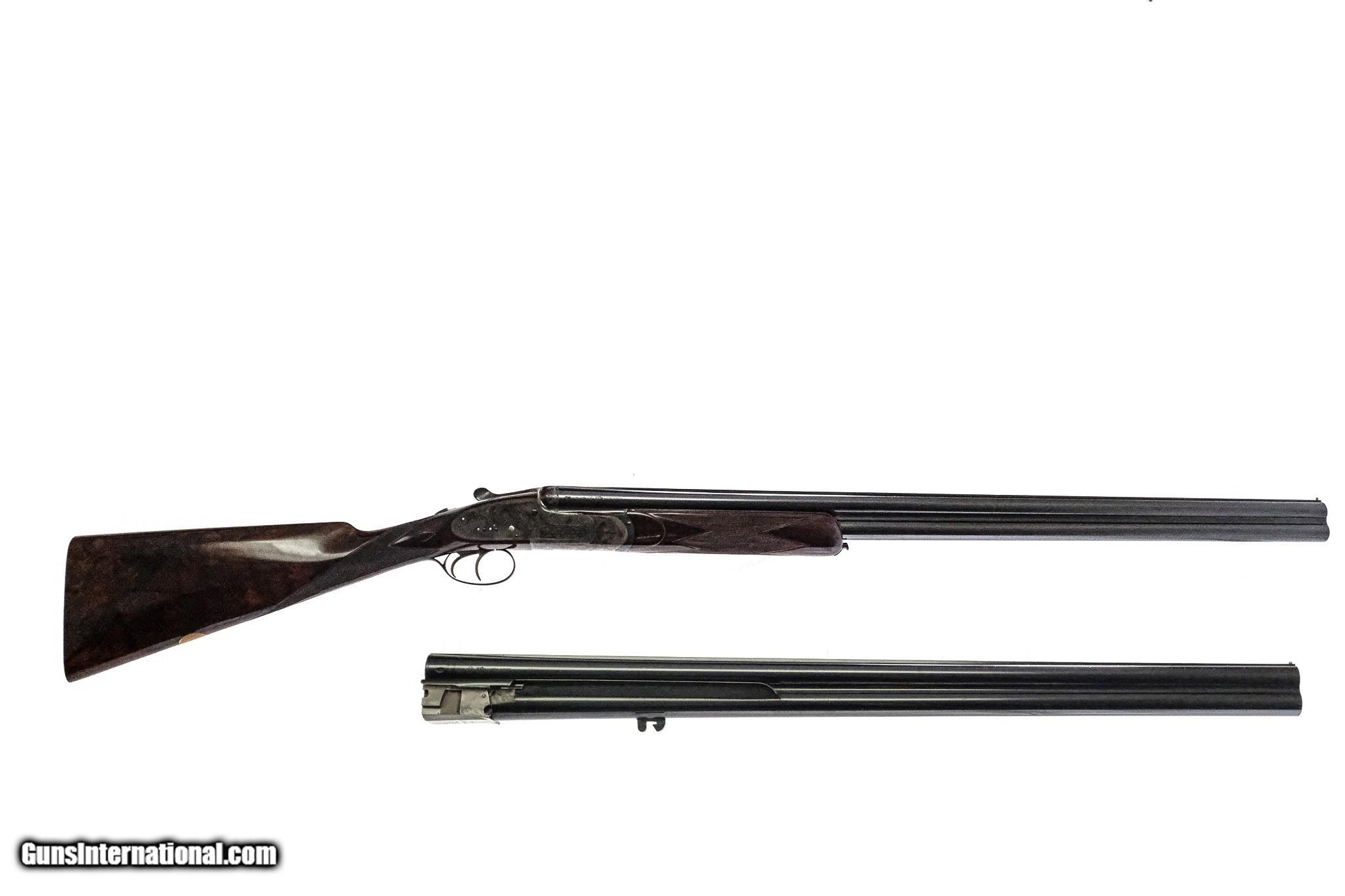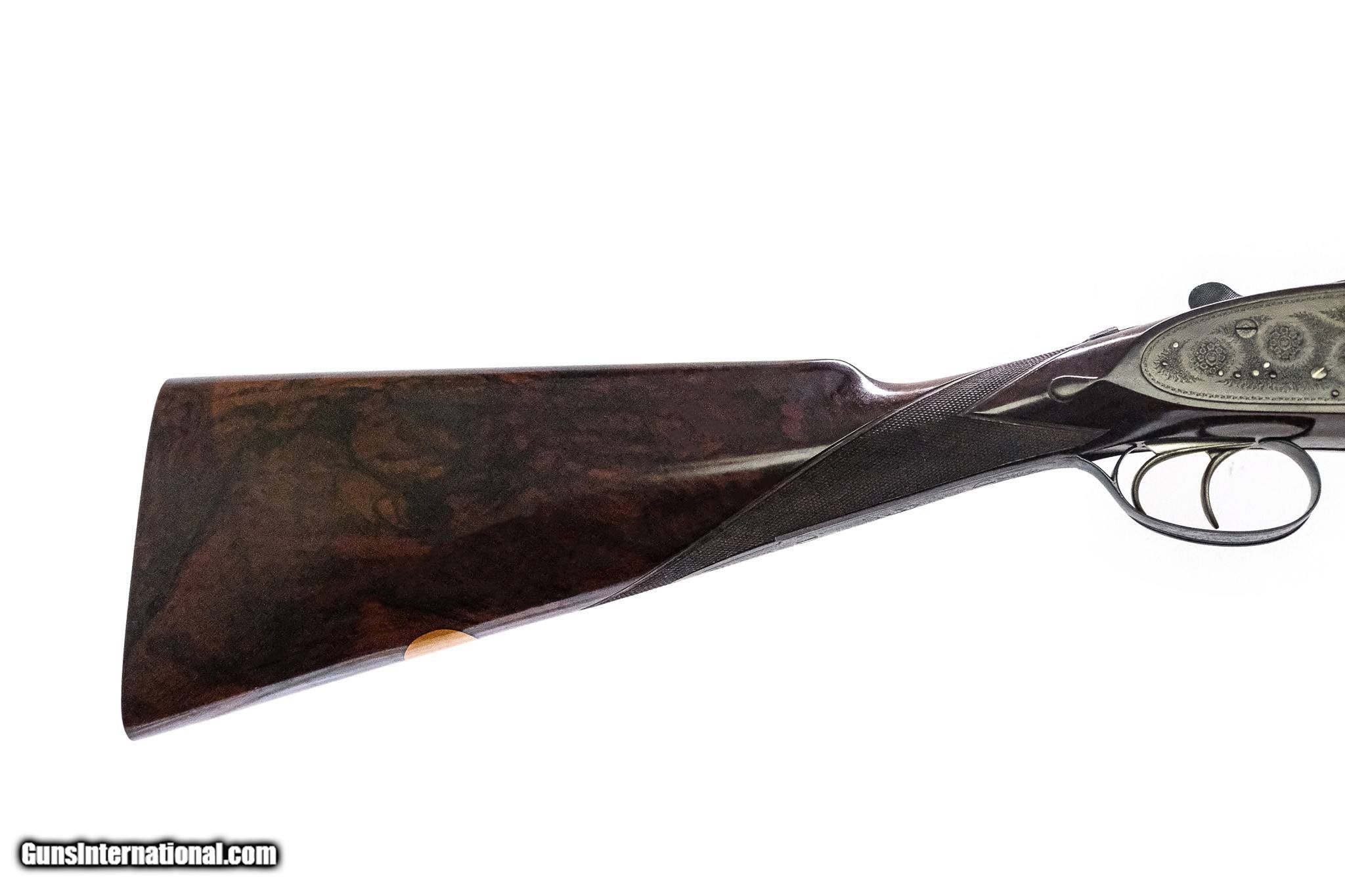 Description: J. Woodward & Son - O/U, Two Barrel Set, 12ga. 30" Barrels & 27" Barrels. Solid file cut rib, straight grip, checkered butt, double triggered, auto ejector, virtually all the case color. Originally built for Royalty, perfect screws, perfect engraving. Gorgeous marble cake wood in a two-barrel oak and leather case. Outstanding in every way! Inv: 74542 6 lbs. 11 oz. (With 30" Barrels) 14 1/8" x 1 ½" x 2 ½" $59,995.00 SOLD |