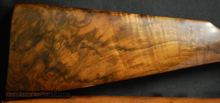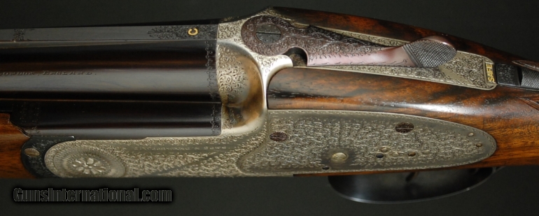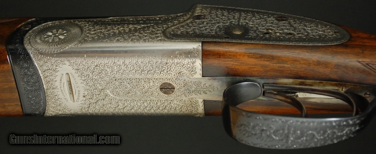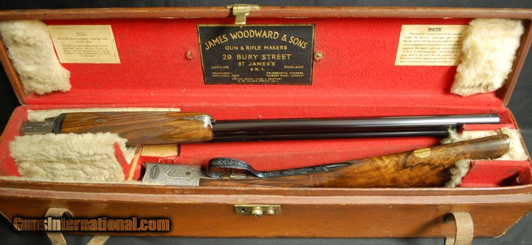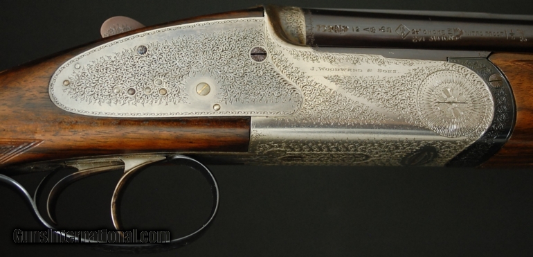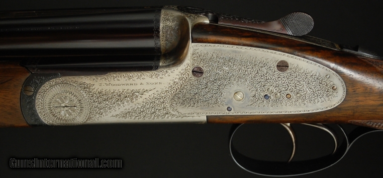 Description: J. Woodward & Sons- Best O/U, 12ga. 26 ½”barrels choked F/F, spectacular exhibition quality Turkish walnut straight grip stock, checkered butt, rare double trigger with a hinged front trigger, solid rib, automatic ejectors, automatic safety, gold oval, 1936 production, modern proof gun with 2 ¾” chambers, a very RARE special rounded frame, the engraving features beautiful sharp miniature scroll with traces of case color left on the frame, the gun remains in excellent overall condition, a spectacular gun in all respects, cased in motor case, available for immediate delivery.