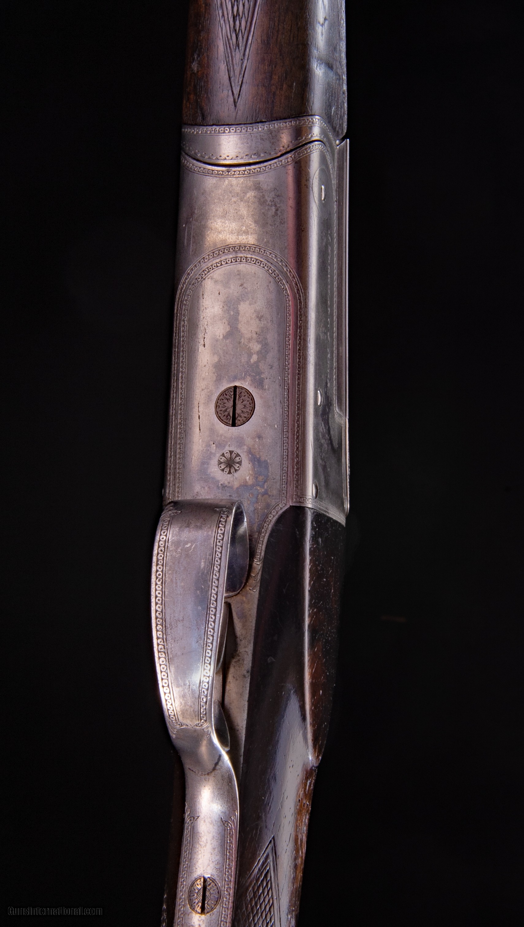 Description: Boxlocks - This is a wonderful little 20g. and by James Woodward to say the least. Actually, that says it all as it is a beautiful gem of the quality we would expect from Woodward. Built about 1898 this gem can be shipped direct. Yes, the stock is short but at four pounds the gun balances and comes up to fit a small person (child undoubtedly) so what a great first gun for the small person in your world. The other option is to have it restocked to fit you!