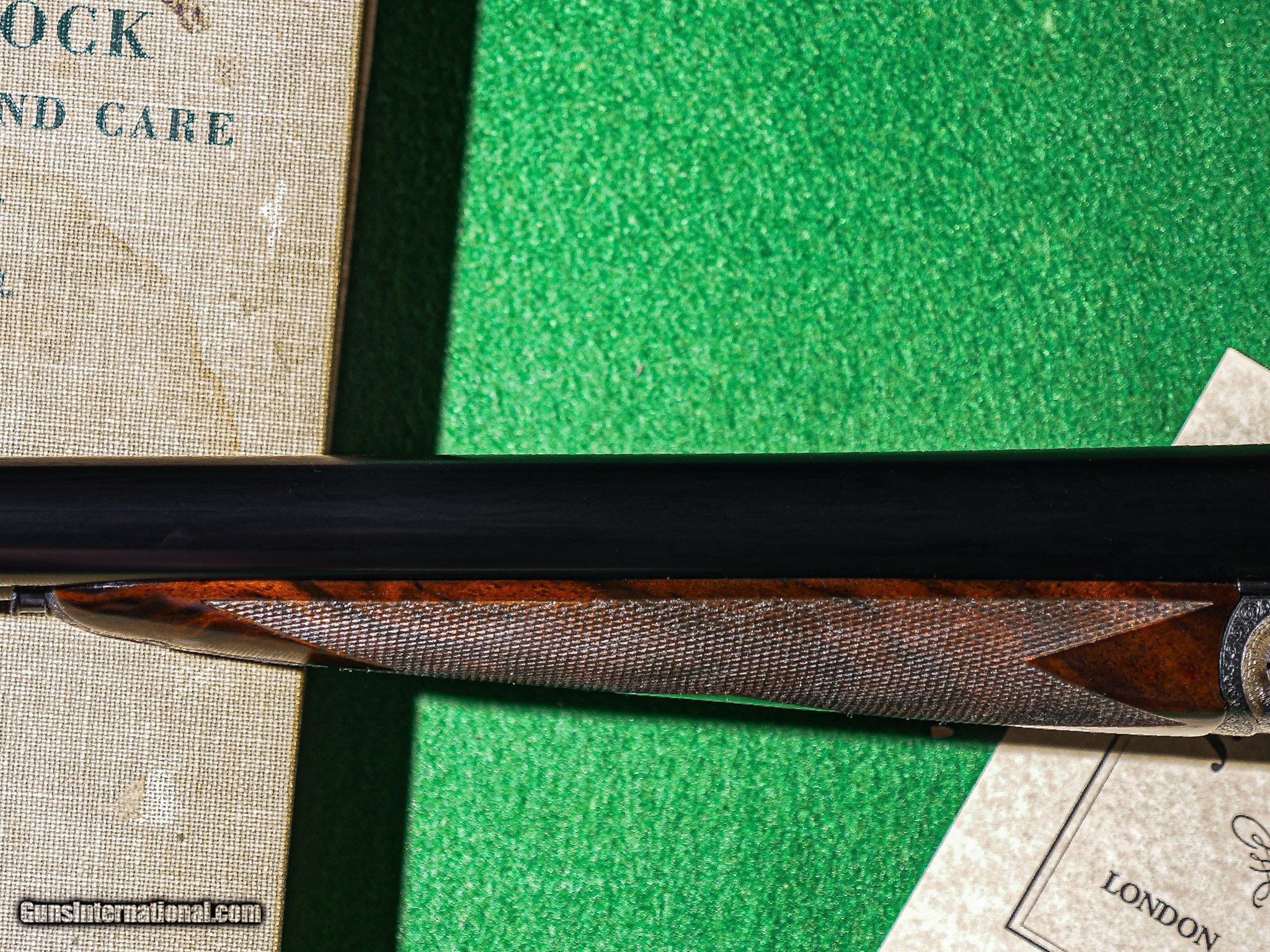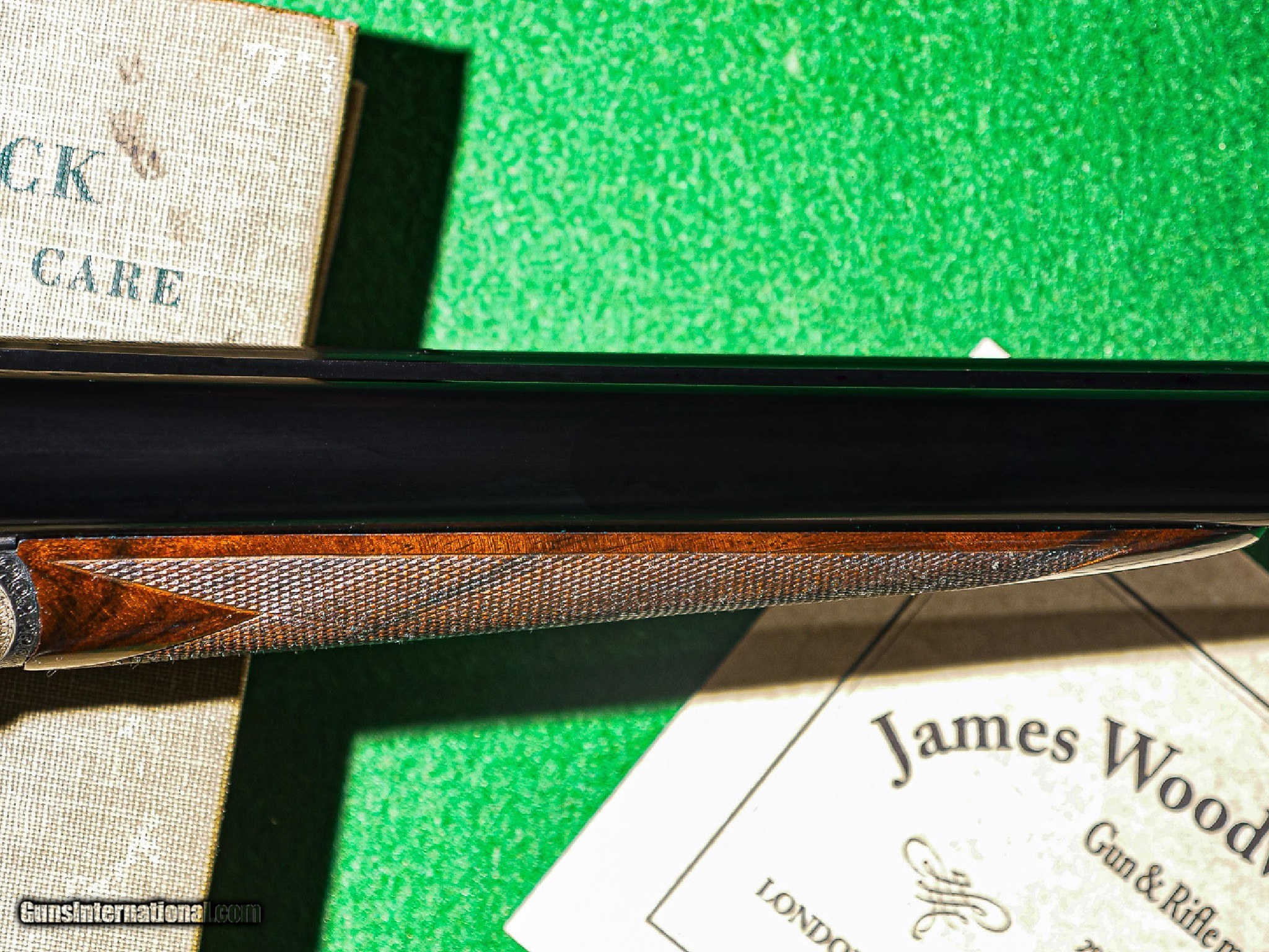 Description: James Woodward & Sons - SxS, Two Barrel Set, 12ga/12ga. 30" IC/IM & 30" IC/M. Two Barrel Set. First set, 30” barrels choked IC/IM with 2 ¾” chambers. Second set, 30” barrels choked IC/M with 2 ½” chambers. Whitworth steel barrels made from fluid pressed steel. Double trigger, auto ejector, high grade Turkish stock, straight grip, splinter forend, arcaded fence, magnificent superbly Woodward scrolled engraving, checkered butt, long LOP. A sharp, crisp, near perfect gun. This gun is completely as new with a London style refinishing which is indistinguishable from a new gun. The cost of the refurbishment is more than we are asking for the gun. Virtually perfect in all respects. Checkering is perfect, case color, bluing are 100%. The lettering and finish are of the highest quality. Just a beautiful gun. Inv: 89249 6 lbs. 15 oz. 15" x 1 ½" x 2 5/8" $16,995.00 The largest, most diverse, high-grade shotgun and firearms inventory in history. There is no one even close and a service department to back up everything we sell with our unparalelled warranty to support our customers exclusively. If someone tells you they have a larger inventory, just look for yourself. SOLD |