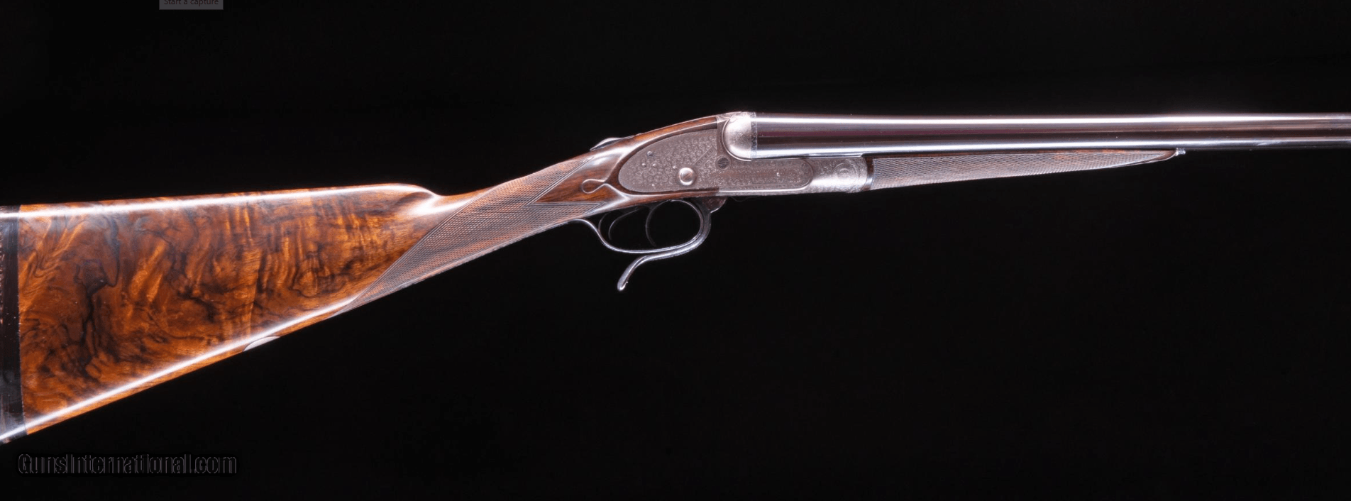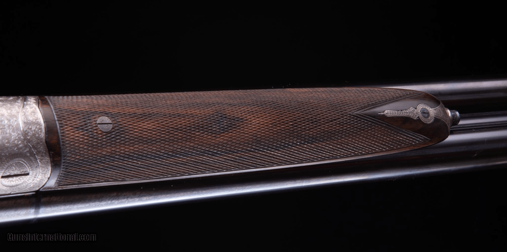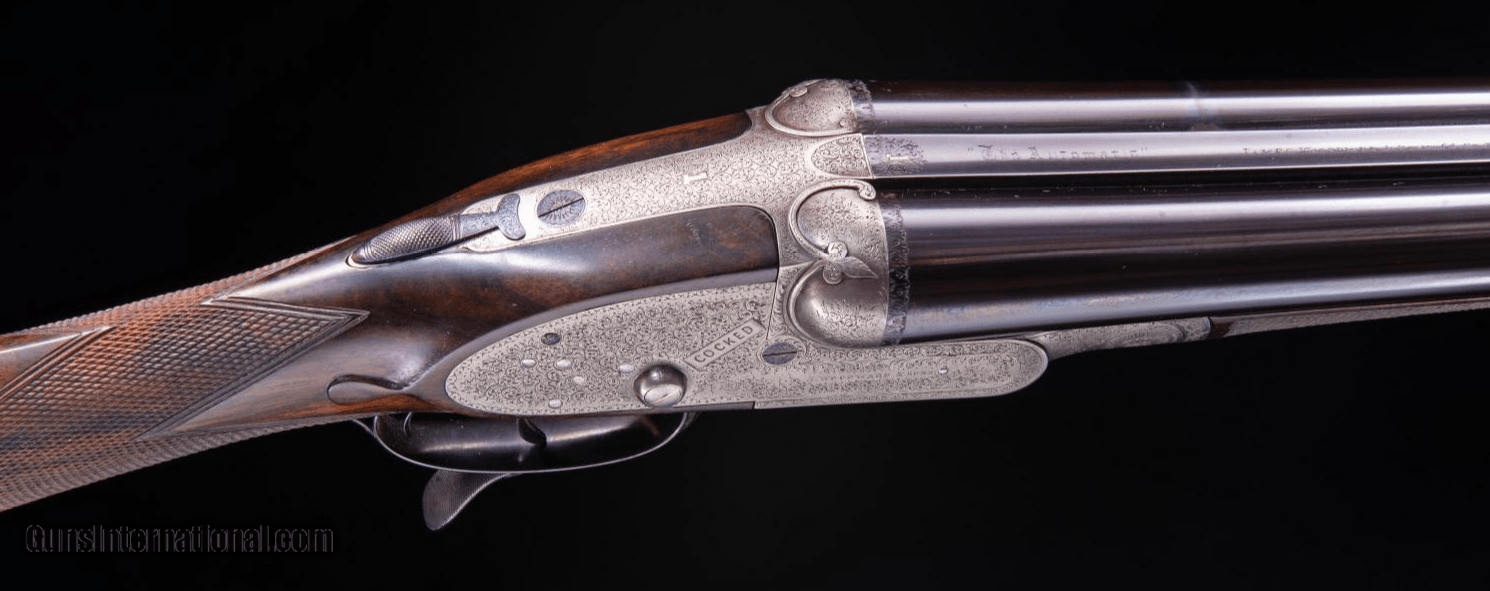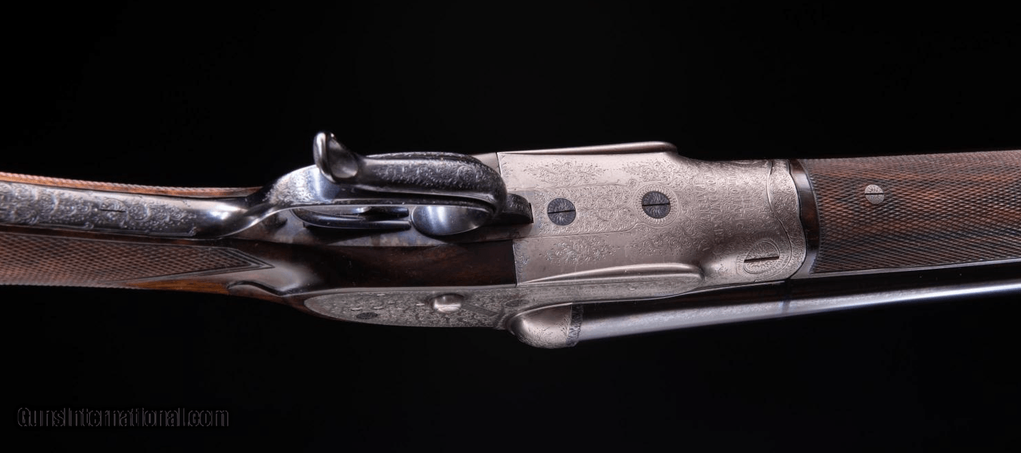 Description: ** 11/24/23 SOLD ** For sale is a beautiful, true BEST quality English double! This James Woodward 'The Automatic' sidelock boasts beautiful full coverage engraving, deep carved fences, cocking indicators and stunning, original wood. 'The Automatic' was the first Woodward designed with self cocking hammers - originally in 1880. This second-generation hammerless sidelock was built in 1881 - they got rid of the exposed hammers but kept the 'The Automatic' name. The action is void of a common top lever as the barrels are opened using a forward underlever. Once you try this a few times you will appreciate how ergonomic this design is. Rolled edge trigger guard; Bar action sidelocks with bolstered tumbler pivots and Gold lined cocking indicators; Locks cocked by the combined action of lever and barrels; Interceptor sears operated by the safety slide; Underlever opening, operating a double bite 'Purdey Bolt'; 'Anson' forend catch; ; Arcaded, clipped fences. Engraving style Very best foliate scroll with floral detail. Very probably engraved by Kell or Sumner. Woodward "T" style safety slide with gold inlaid 'SAFE'. Top rib and top tang gold inlaid with engraved '1'. The top rib is of the smooth, concave game type. The stock is beautifully well figured walnut and is lightly cast off for a right-handed shot, features well-defined drop points, a vacant metal oval . The forend has a finely engraved steel tip. The stock is finished with a traditional linseed oil-based preparation as used on best guns by one of the top English makers. Overall the condition of this fine double is very good. The barrels have been sleeved which makes this a reliable and safe shotgun to shoot. Original rib remains and reads: "The Automatic" James Woodward & Sons, 64 St James's Street, London SW From the Woodward Ledger: Completed September 12, 1881 for CC Rogers - Description: No. 1 of a pair with "Automatic" hammerless non-ejector game gun. Weight 6lb 12oz. Calibre: 12bore Barrels: 30in Whitworth Steel Choke: 1/4 & 1/2 Stock: 14.5" Notes: snap-action underlever This is a tremendous opportunity to own a London BEST shotgun at a great price. Antique - ships direct to your door. Great info on Woodward in this YouTube clip: ://youtu.be/PLGQfgGMQf4?si=vucCr-kckGhhm3lI SOLD Shotgun Gauge: 12 Gauge Manufacturer: James Woodward and Sons Model: The Automatic Serial Number: 3794 Barrel Length: 26 Chambers: 2.5 Ejectors: Yes Condition: very good Metal Condition: excellent Wood Condition: excellent Bore Condition: excellent Barrels: Sleeved Triggers: Double Stock: Straight Stock Comb: 1 9/16 Stock Heel: 2 1/16 Stock Cast: 1/8 Fore End: splinter Butt Pad: horn LOP: 14 15/16 Rib: concaved Weight: 6lb 11oz Sights: bead Manufacture Date: 1881 Choke Left: .022 Full Choke Right: .008 IC Engraving: full coverage hand engraved Proof:Nitro: Nitro 2 1/2 Minimum Wall Thickness Left: .036 Minimum Wall Thickness Right: .035 |