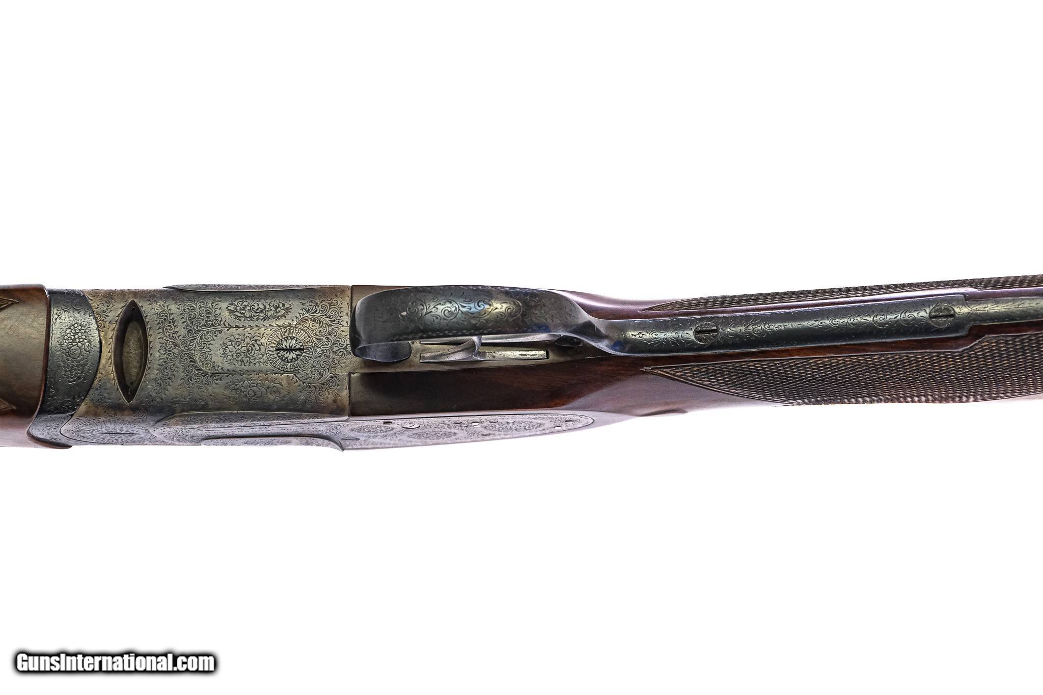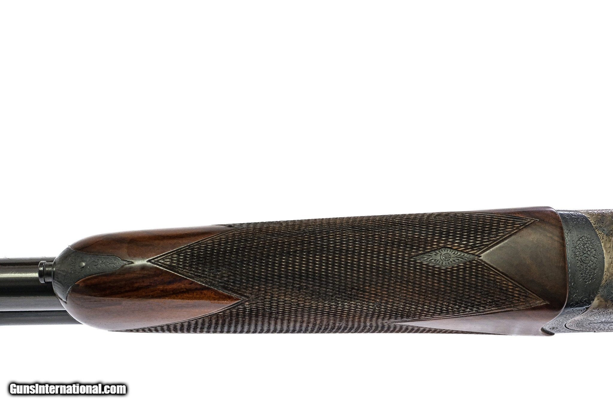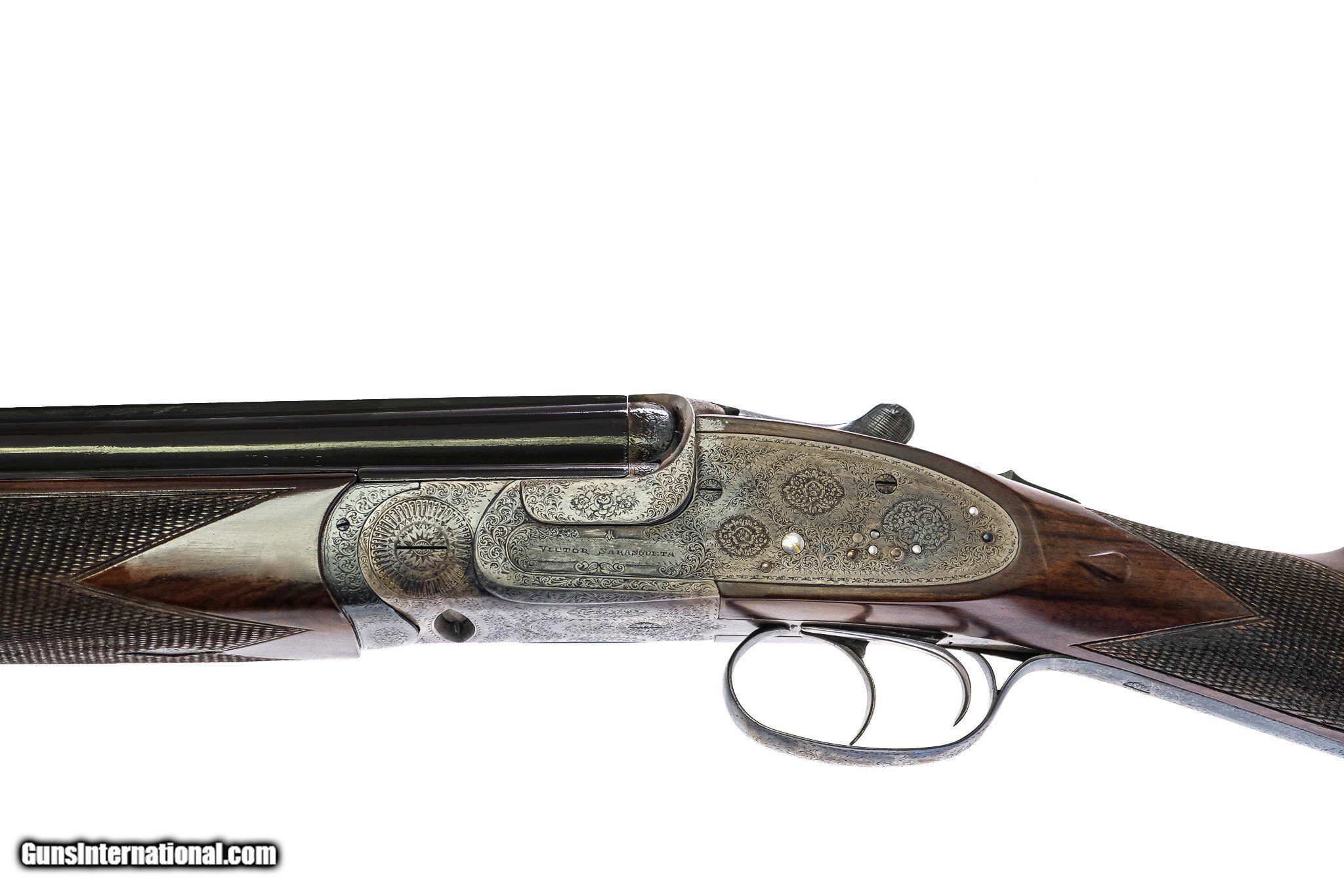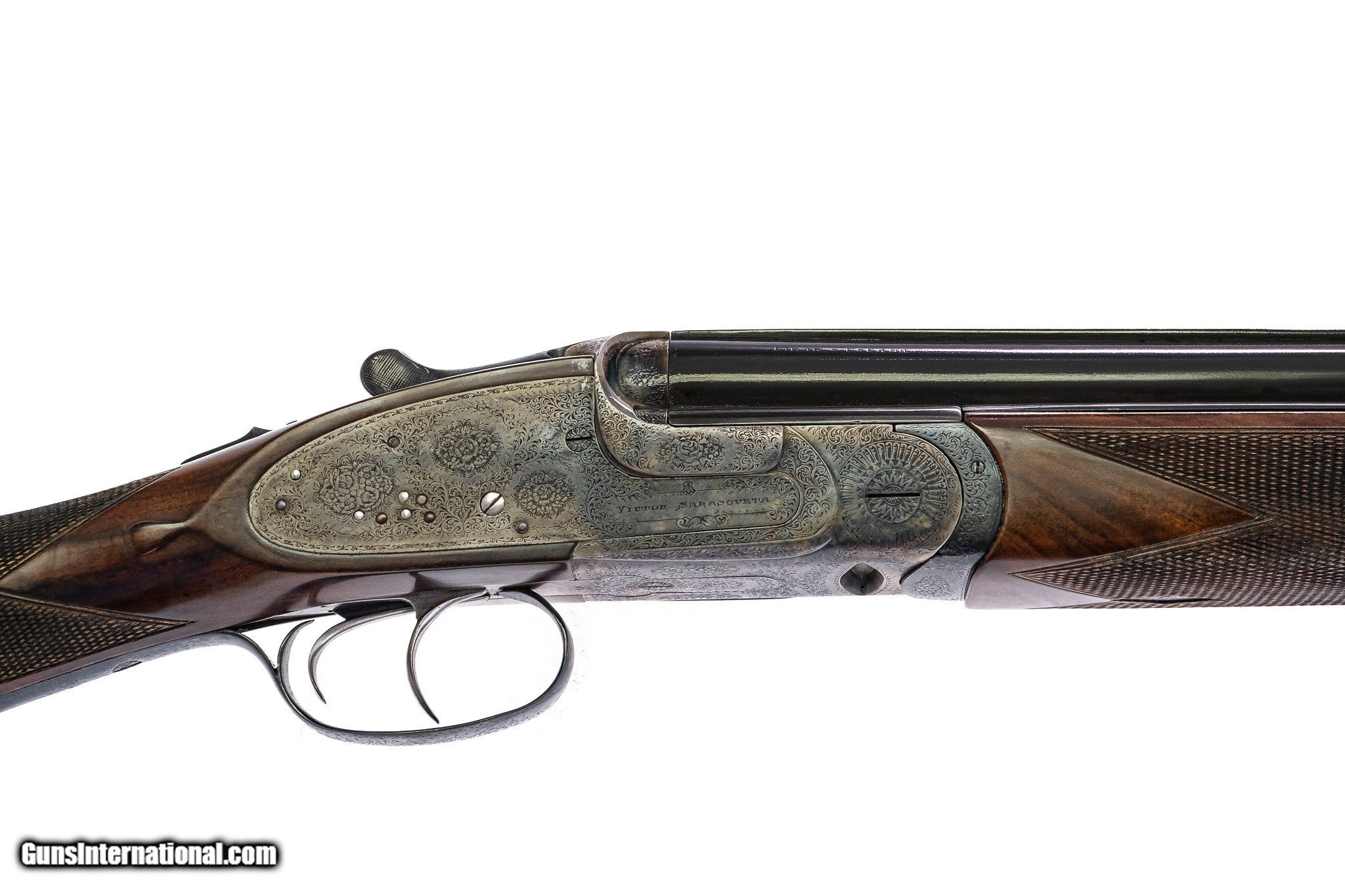Description: Victor Sarasqueta - #14, O/U, 12ga. 27 ½ “ Barrels. An exact copy of a Woodward shotgun made in England 27 ½ “ solid rib, double trigger, hinged front, straight grip, silvers pad, drop point stock, Woodward type wings over the forend, perfect screws, complete English style refinish, with most of the case color, with extreme high quality rose and scroll, automatic ejector, wonderfully straight Turkish walnut stock. This is an extremely high grade/ high quality gun. Which are very seldom seen! Inv: 67842 7 lbs. 6 oz. 15" x 1 ½" x 2 ¼" $7,995.00 SOLD |